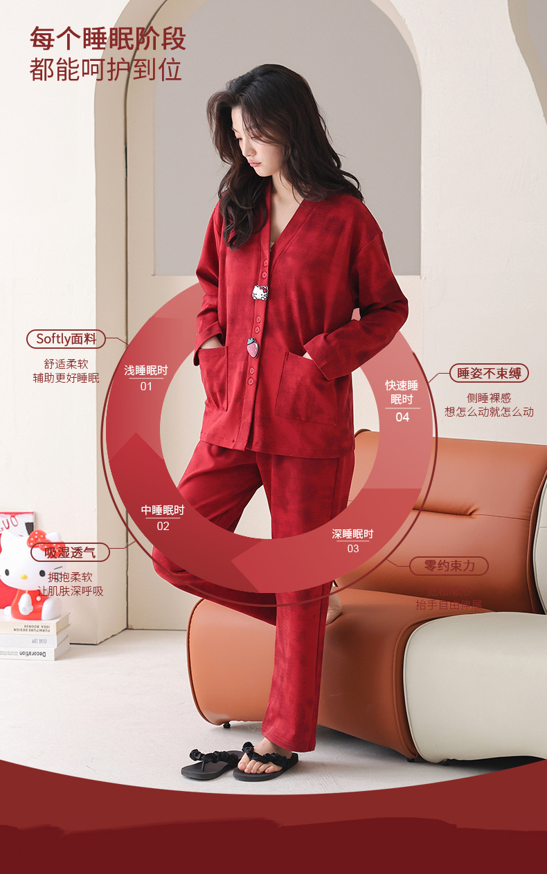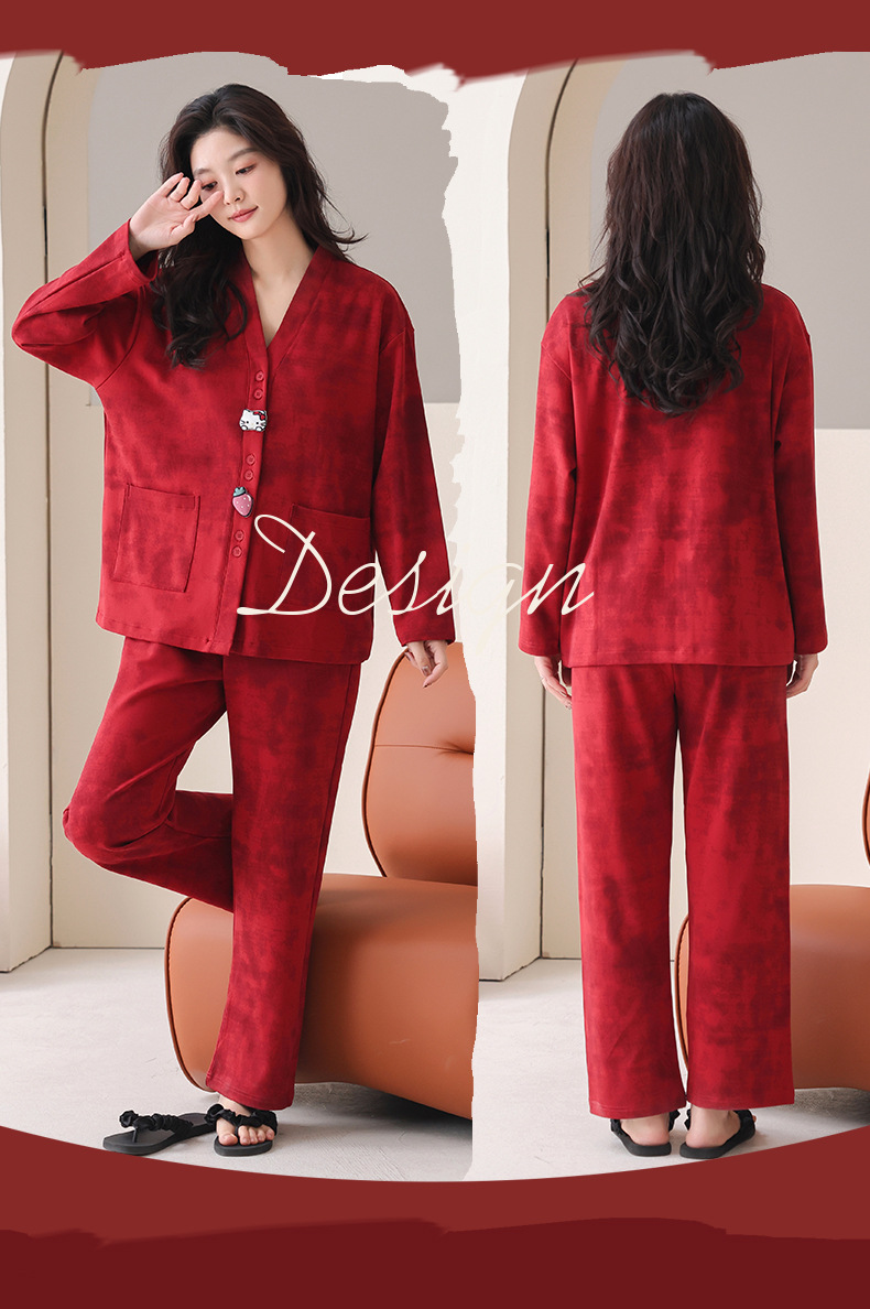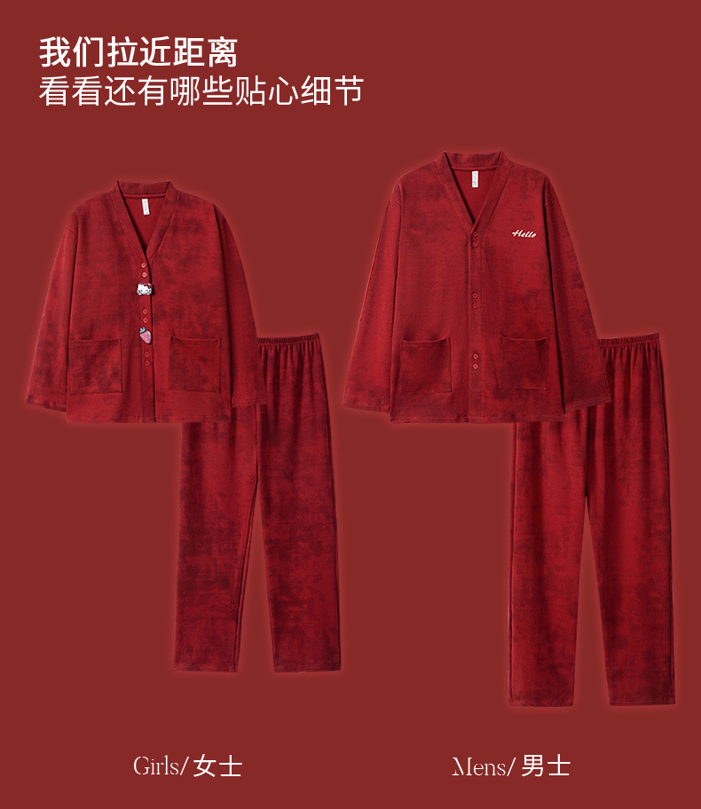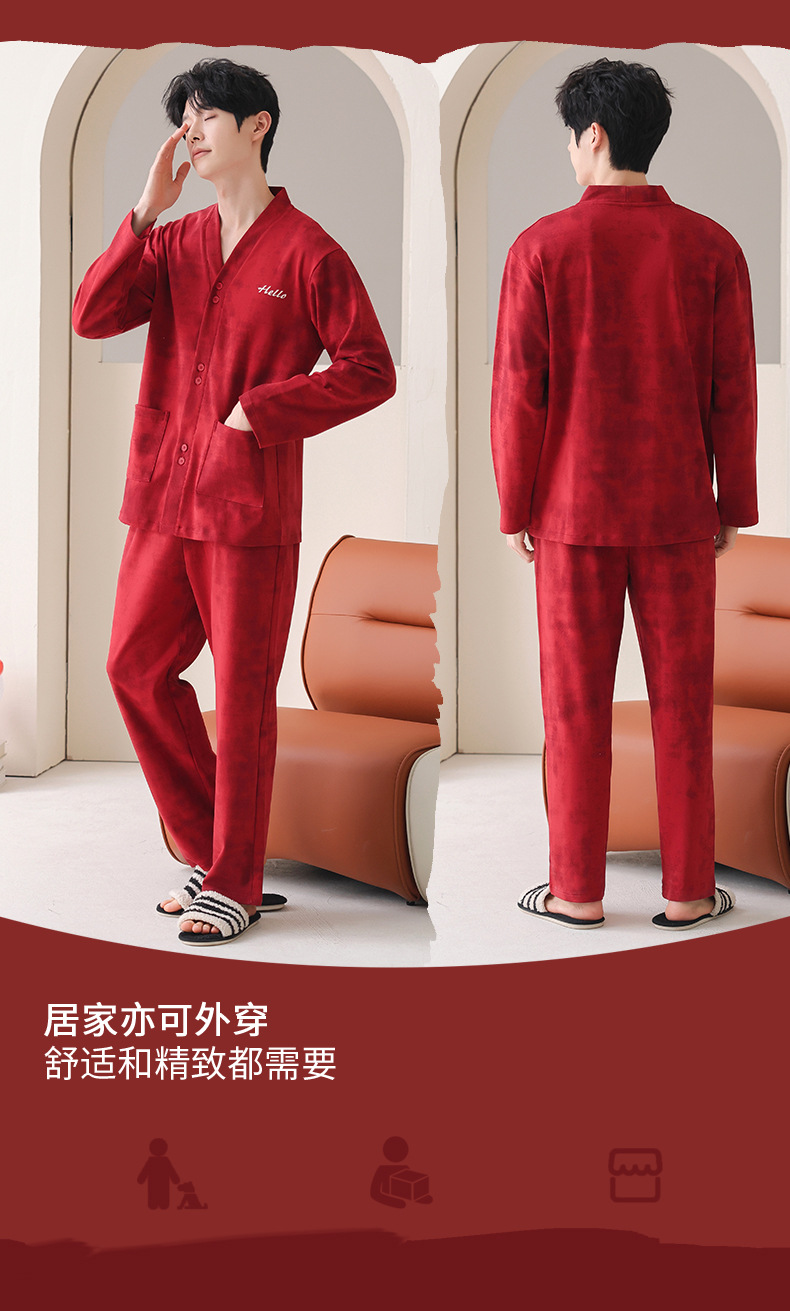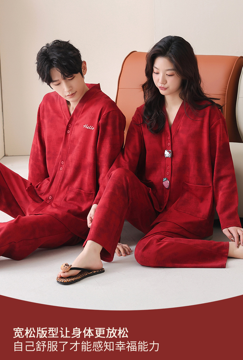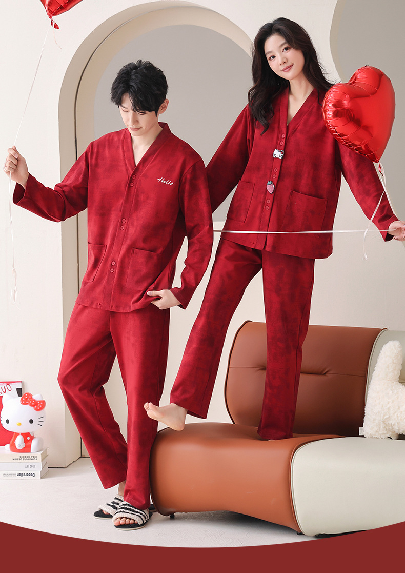 가슴 패드가있는 여성용 웨딩 커플 잠옷 봄, 가을 순수 코튼 긴팔 카디건 레드 축제 남성용 홈웨어 세트스토어 가기