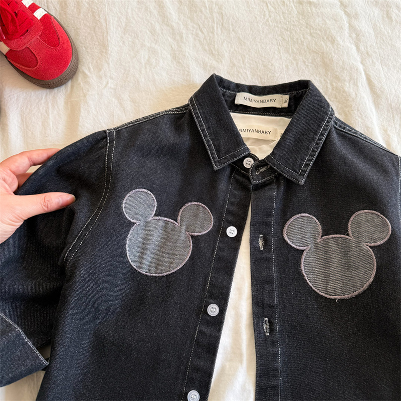 어린이 셔츠 2025 곁눈질 봄 새 소년 소녀 만화 데님 셔츠 아기 캐주얼 패치 셔츠스토어 가기