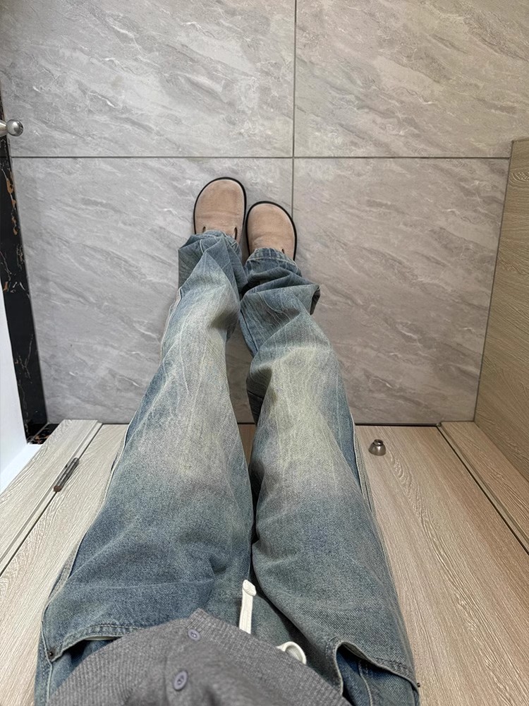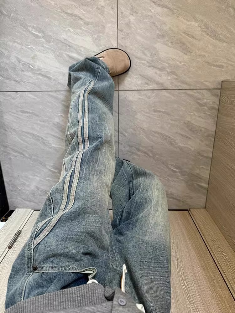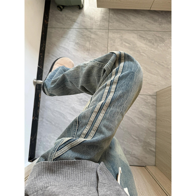 아메리칸 스타일 하이 스트리트 스트라이프 스티칭 청바지 남성 봄과 가을 디자인 센스 패션 브랜드 루즈 레트로 좁은 버전 스트레이트 와이드 다리 바지