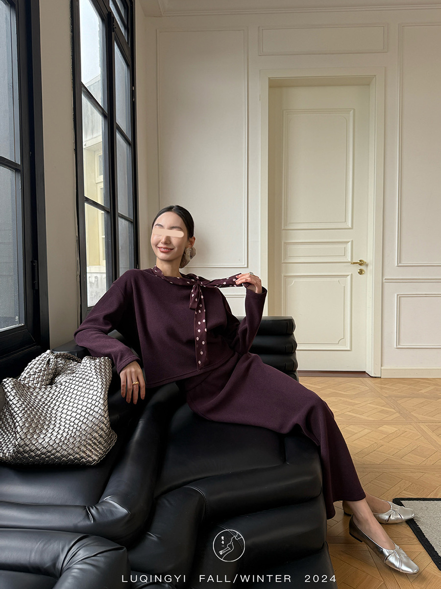 루칭이【작은 숙녀】프렌치 니트 여성 배색 물방울무늬 레이스업 디자인 다용도 세트 스커트 봄옷스토어 가기