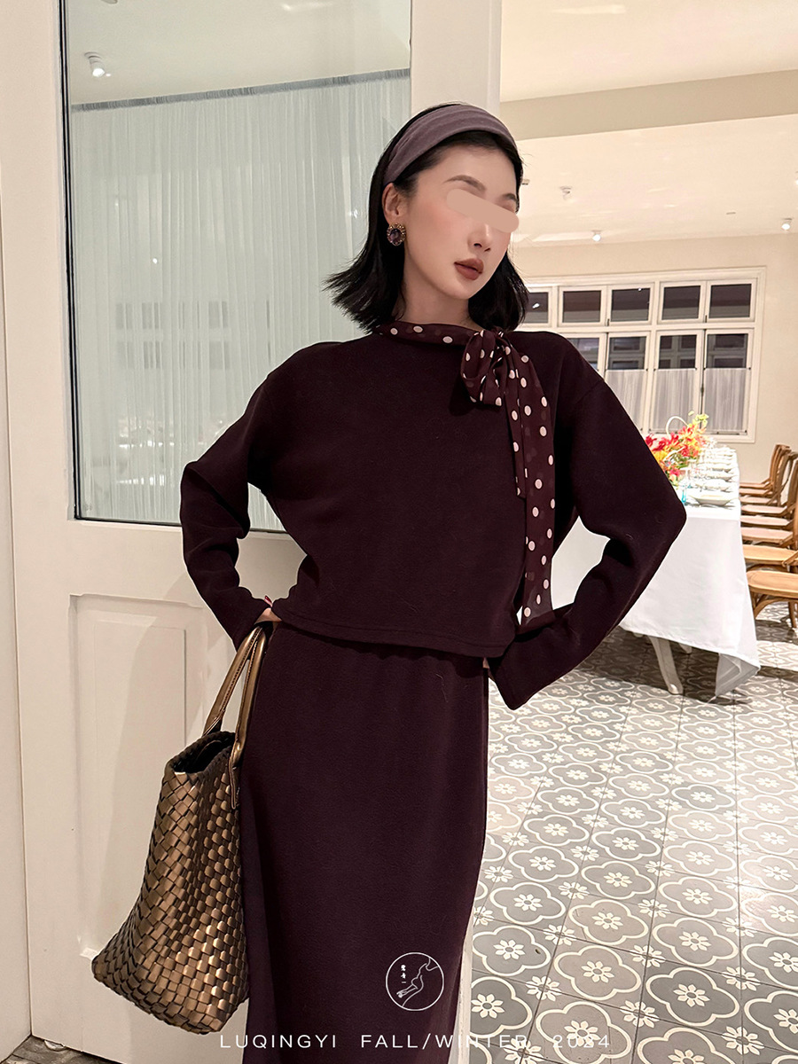 루칭이【작은 숙녀】프렌치 니트 여성 배색 물방울무늬 레이스업 디자인 다용도 세트 스커트 봄옷