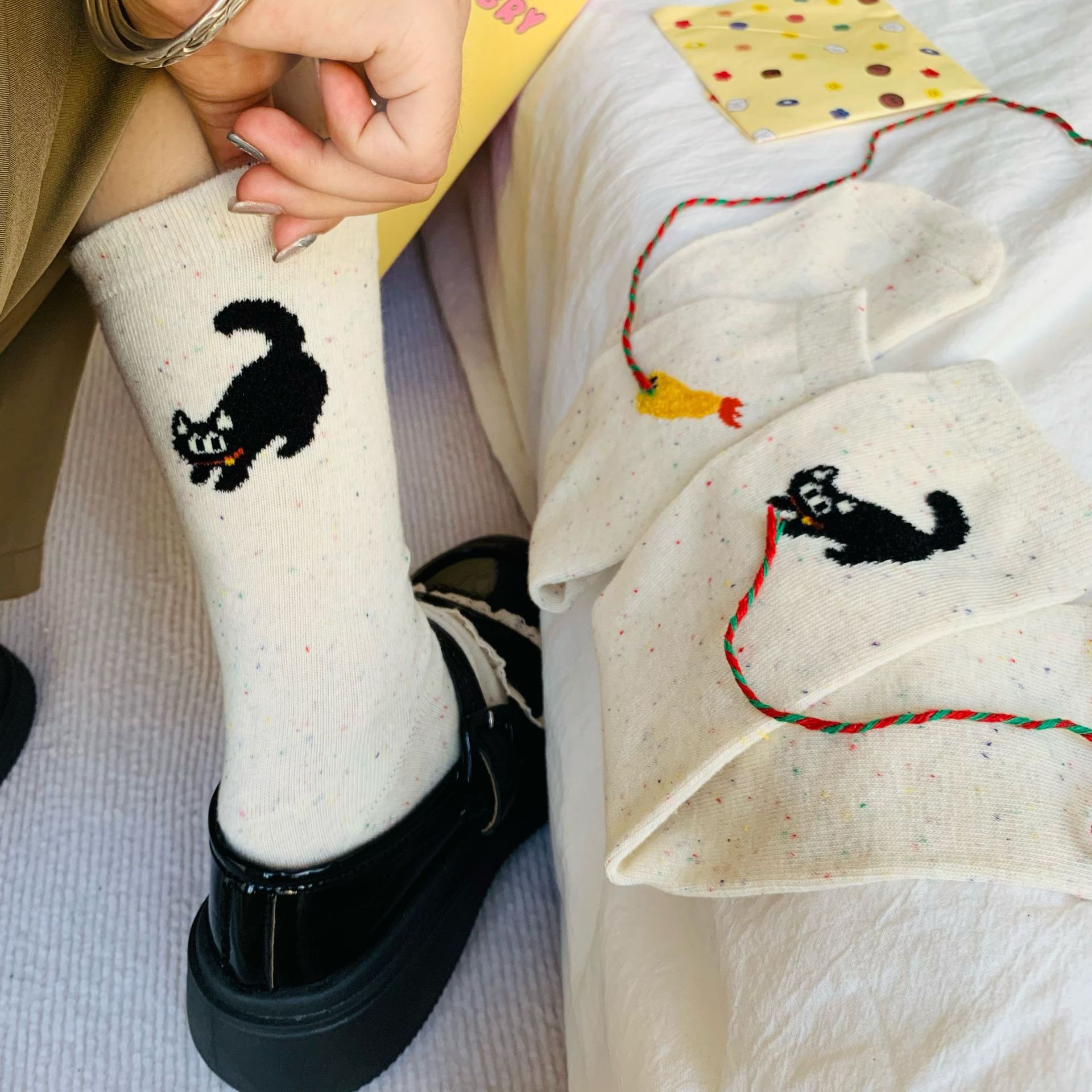 일본 귀여운 만화 새끼 고양이 봄과 가을 새로운 귀여운 일러스트 뒤꿈치 컬러 도트 미드 양말 학생스토어 가기