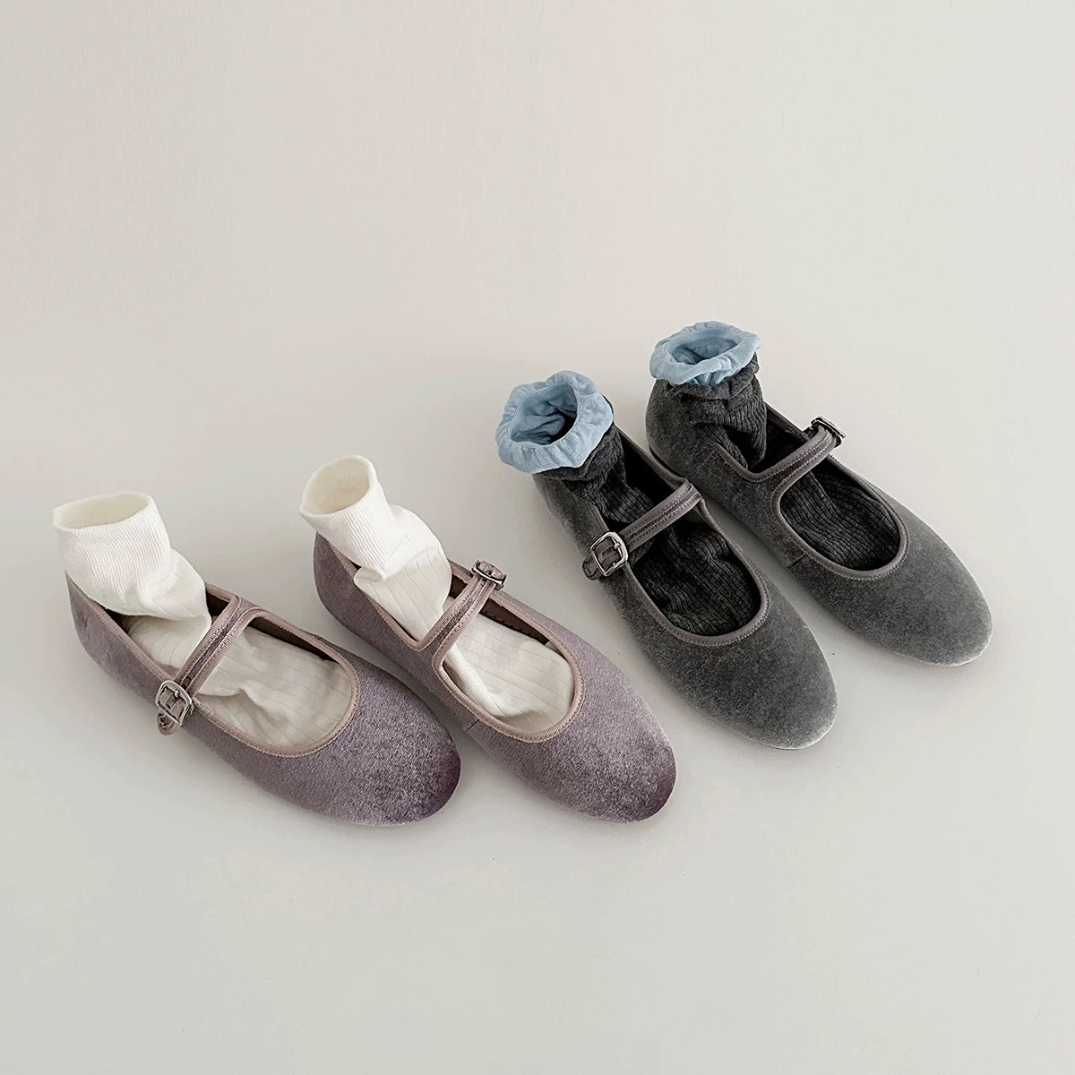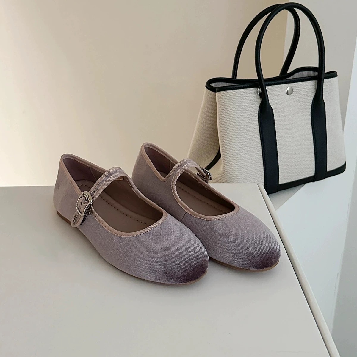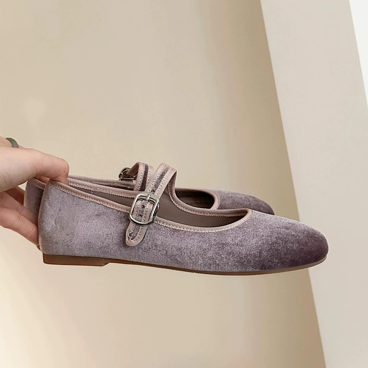 정품 가죽 벨벳 프렌치 얕은 탑 라운드 발가락 버클 벨트 메리 제인 신발 여성의 2025 봄 발레 플랫스토어 가기