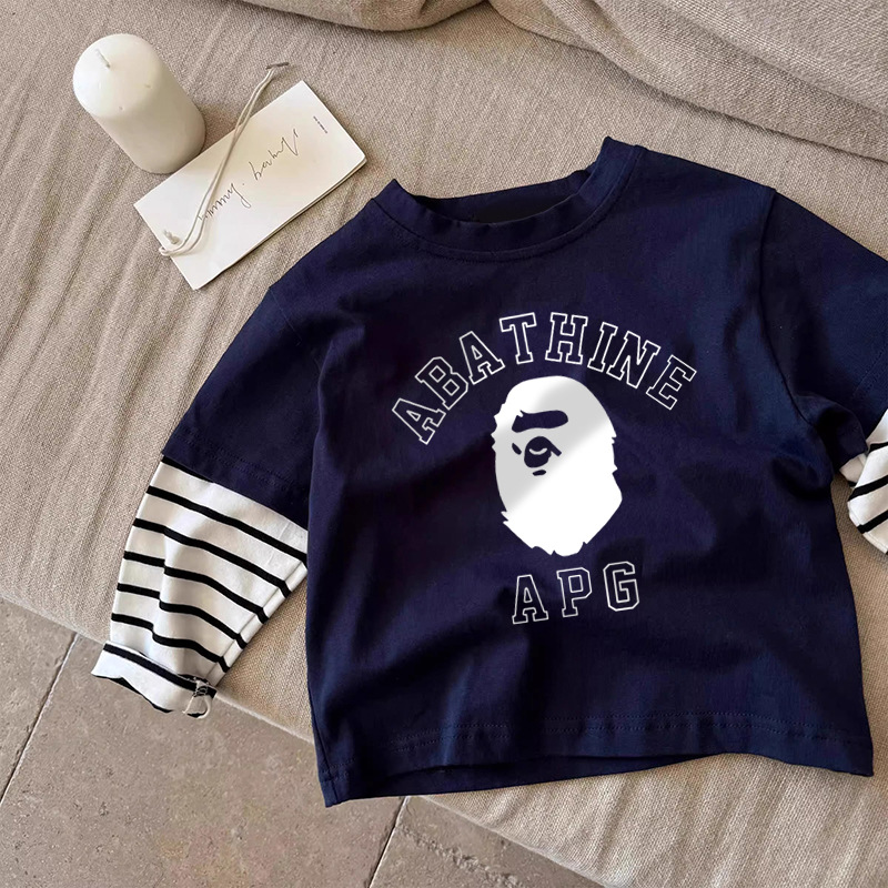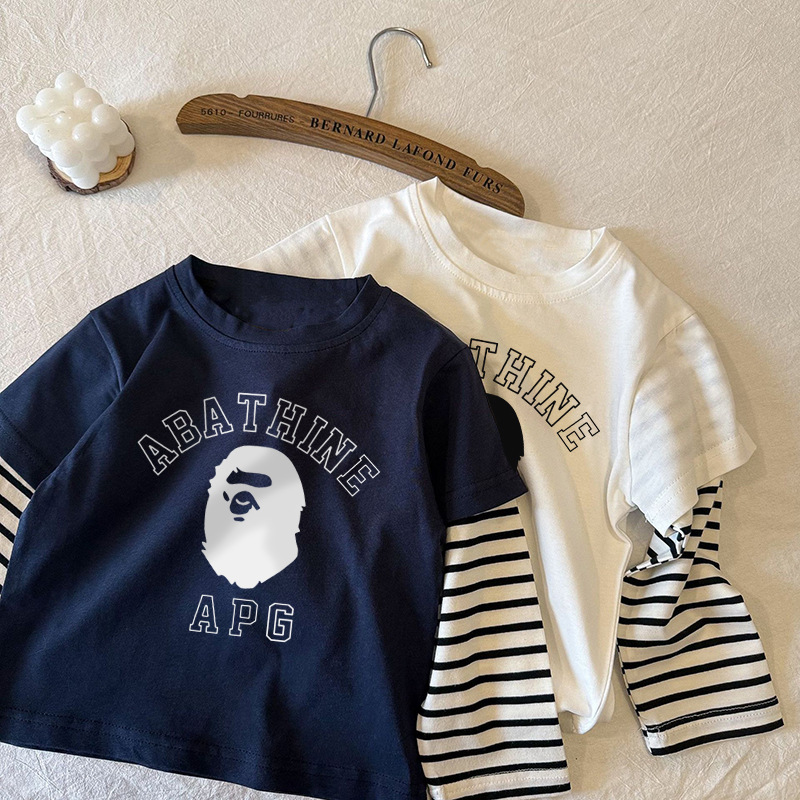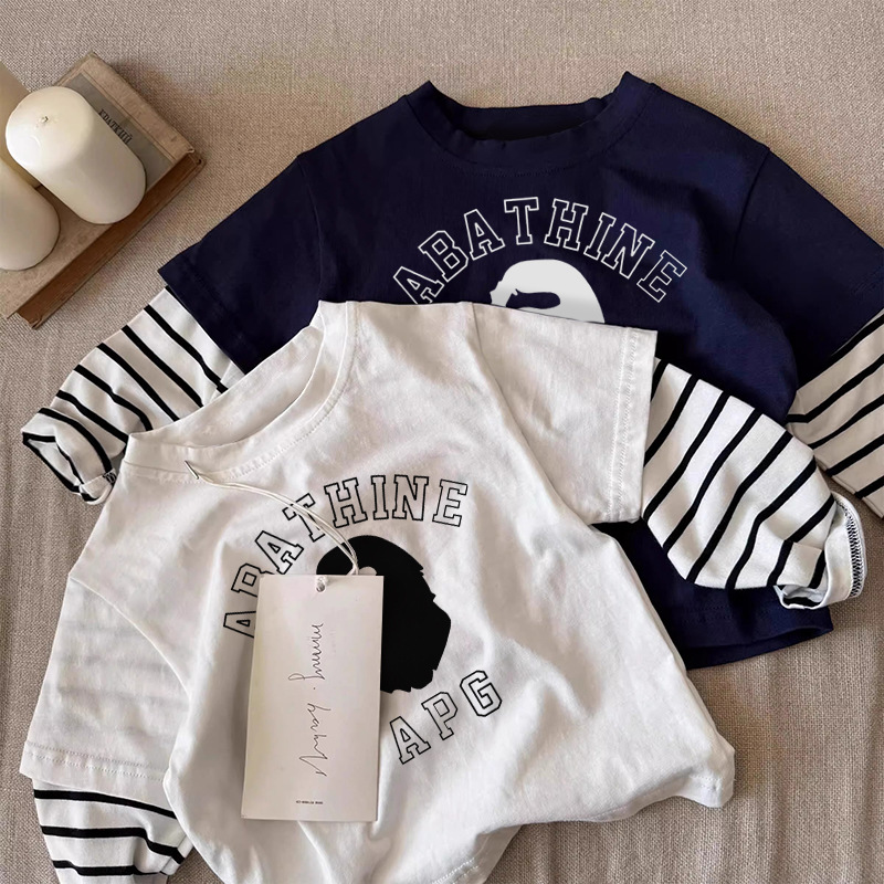 순면 아동용 티셔츠 긴팔 2025 스트라이프 페이크 투피스 트렌디 브랜드 다용도 중소 아동복 하의 셔츠 탑 봄, 가을스토어 가기