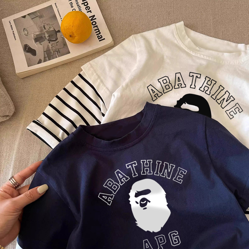 순면 아동용 티셔츠 긴팔 2025 스트라이프 페이크 투피스 트렌디 브랜드 다용도 중소 아동복 하의 셔츠 탑 봄, 가을