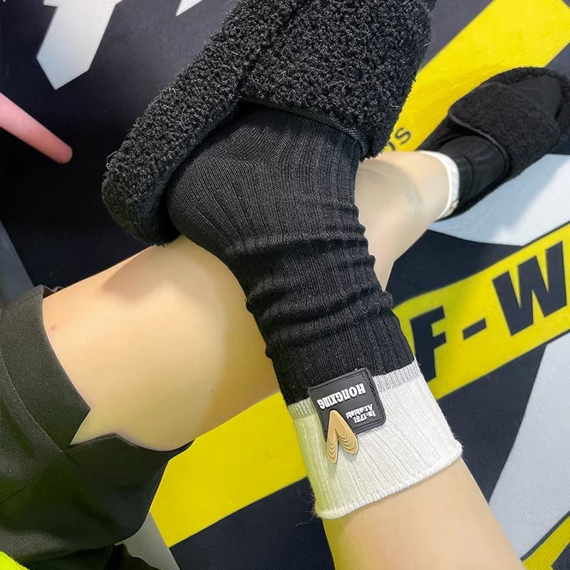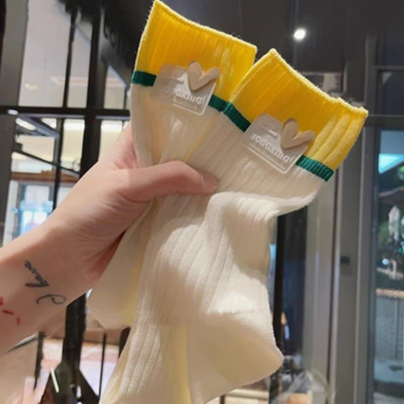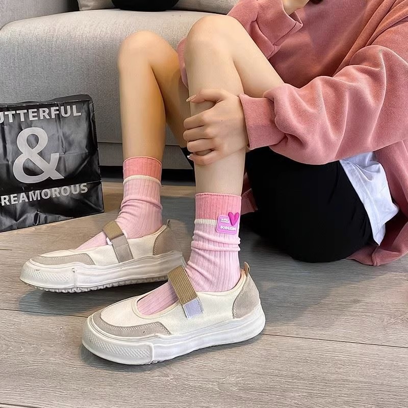 핑크 양말 여성의 중간 길이 양말 봄과 여름 얇은 더블 바늘 스타킹, 트렌디 한 맞춤형 컬러 매칭 러브 라벨 스택 스타킹
