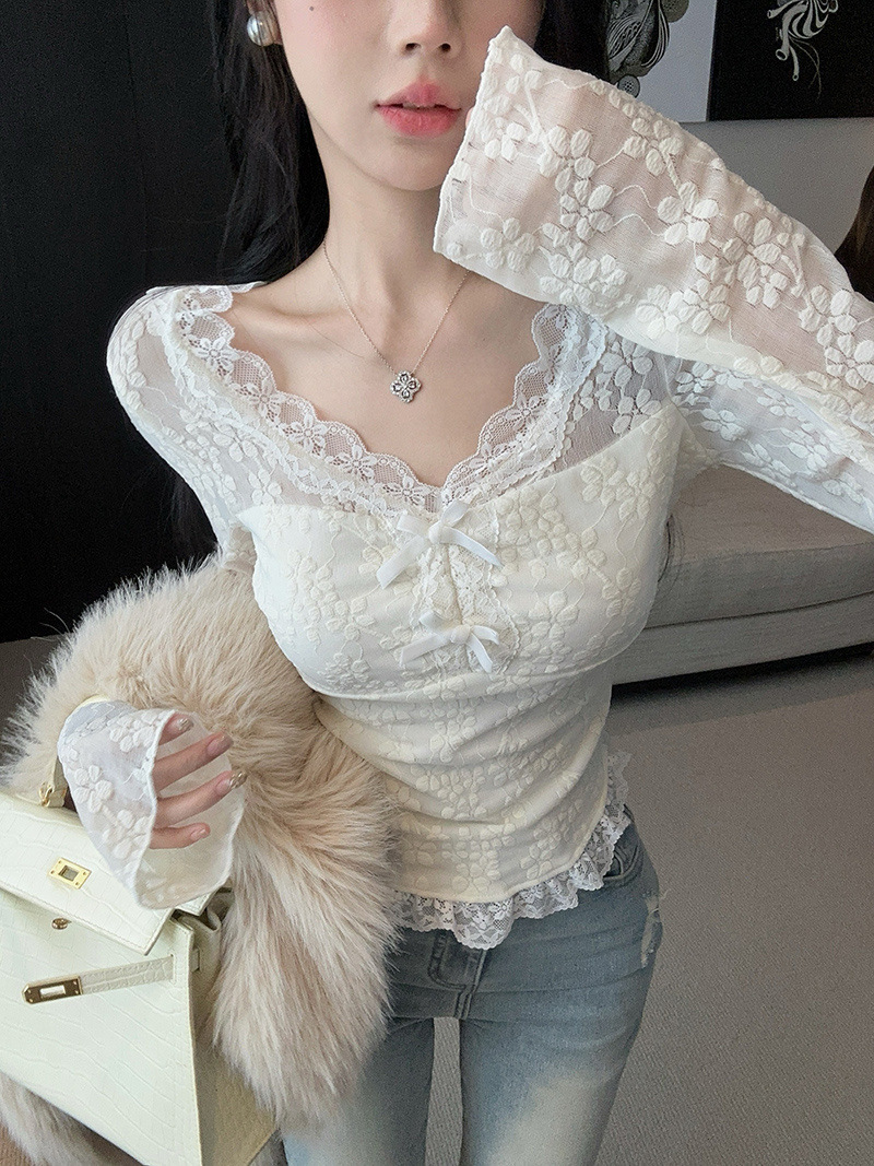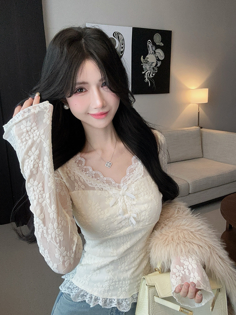 순수한 욕망 스타일 스파이스 소녀 V-넥 최고 여성의 가을과 겨울 샤넬 스타일 기모 레이스베이스 셔츠 내부 착용 하이 엔드 감각