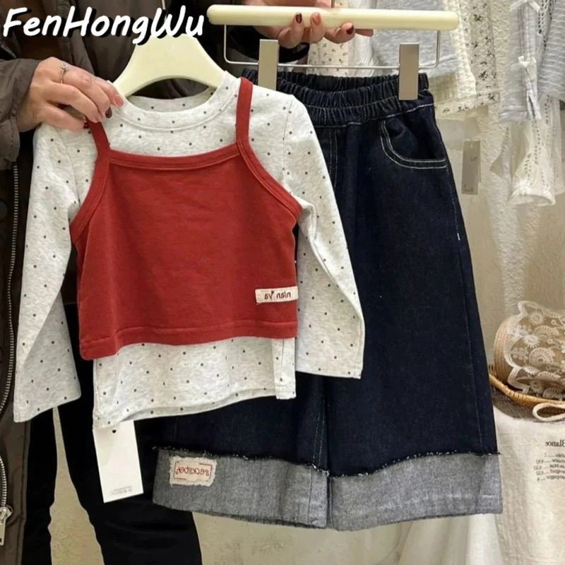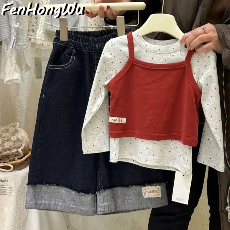 [핑크 집] 여자 한국 세트 봄 · 가을 어린이 서양식 웨이브 도트 긴소매 조끼 방풍 커튼 청바지