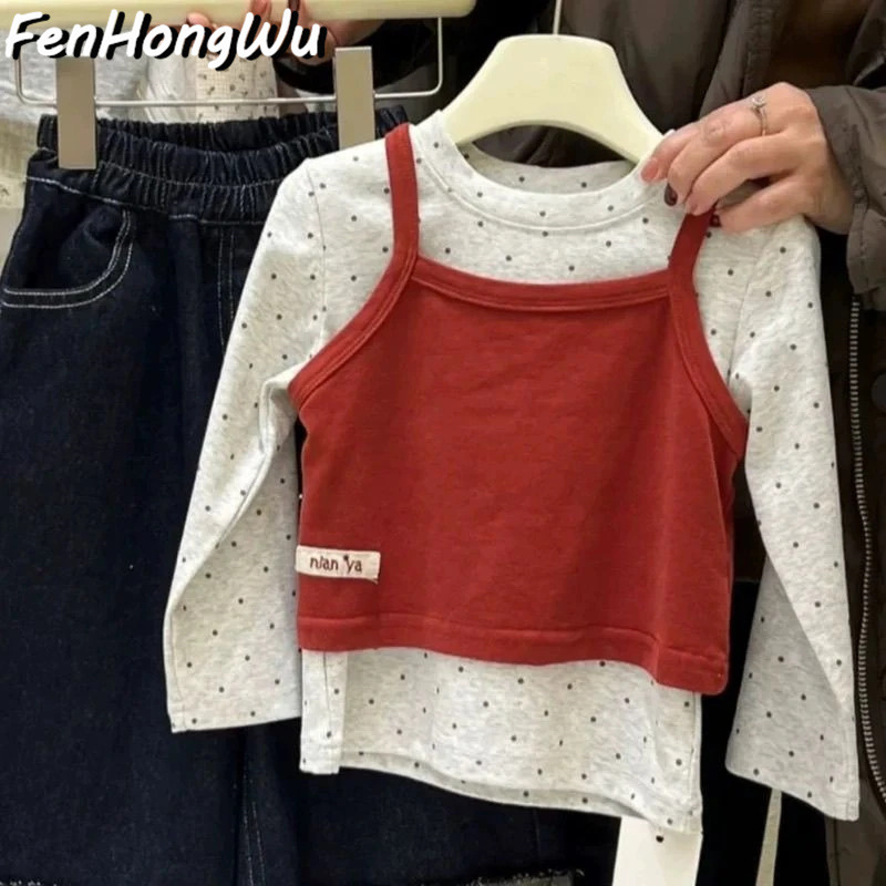 [핑크 집] 여자 한국 세트 봄 · 가을 어린이 서양식 웨이브 도트 긴소매 조끼 방풍 커튼 청바지스토어 가기