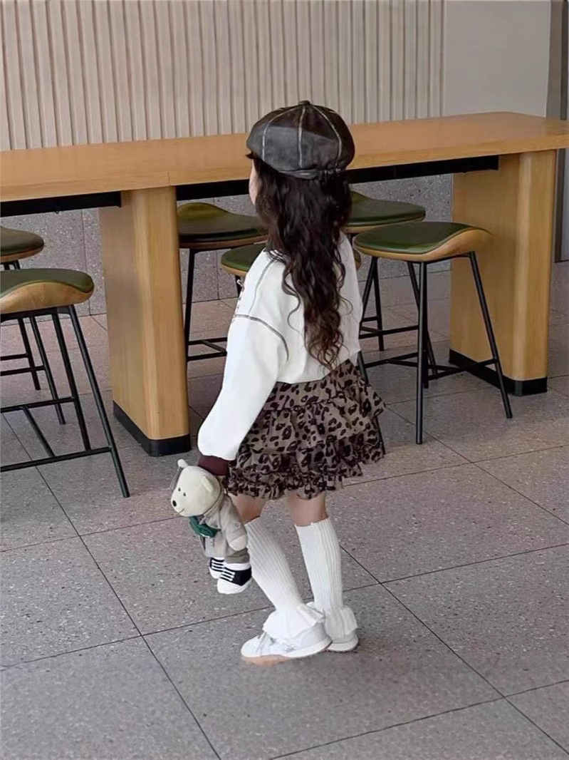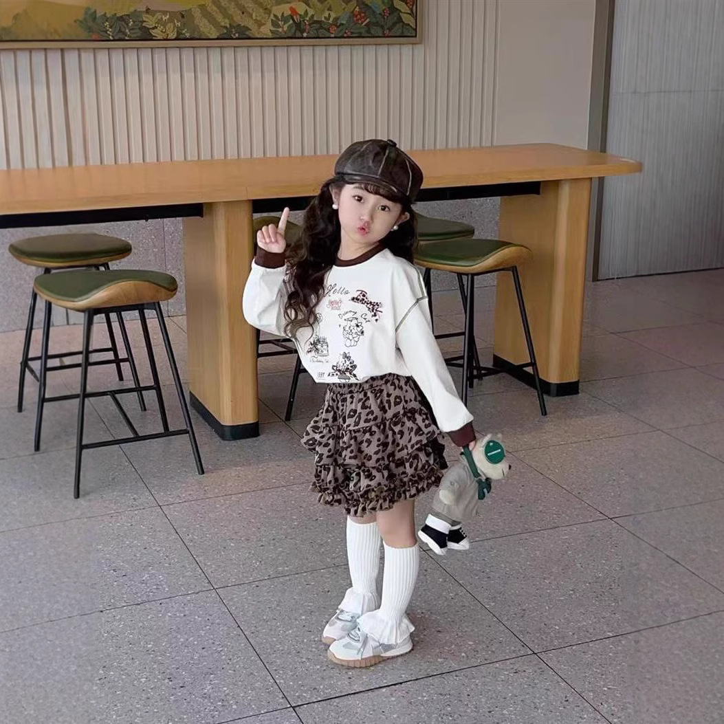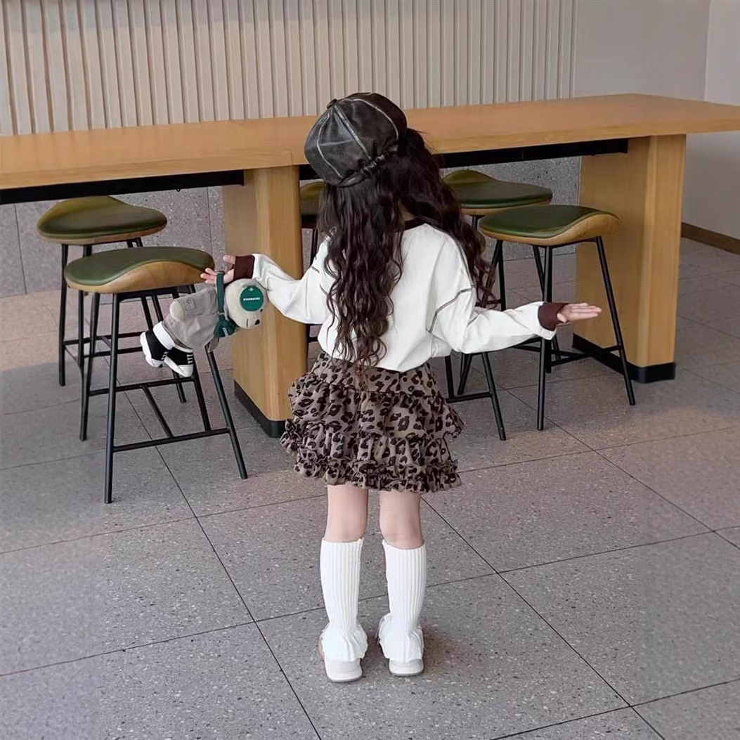 새로운 2025 봄 소녀의 레오파드 무늬 스커트 스커트 스커트 캐주얼 케이크 주름 치마스토어 가기