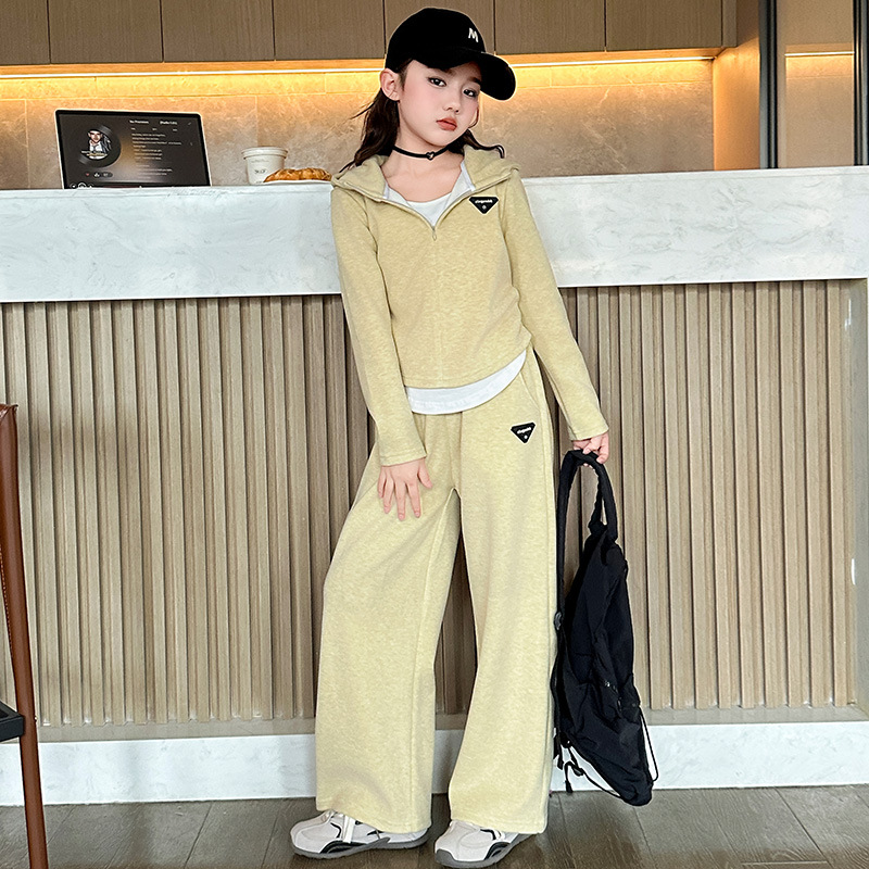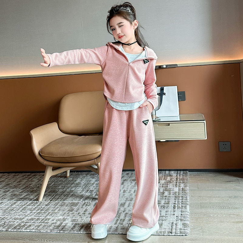 큰 어린이 후드 지퍼 코트 캐주얼 와이드 레그 팬츠 투피스 세트 2025 봄 새로운 어린이 외국 스타일의 한국 버전 세트