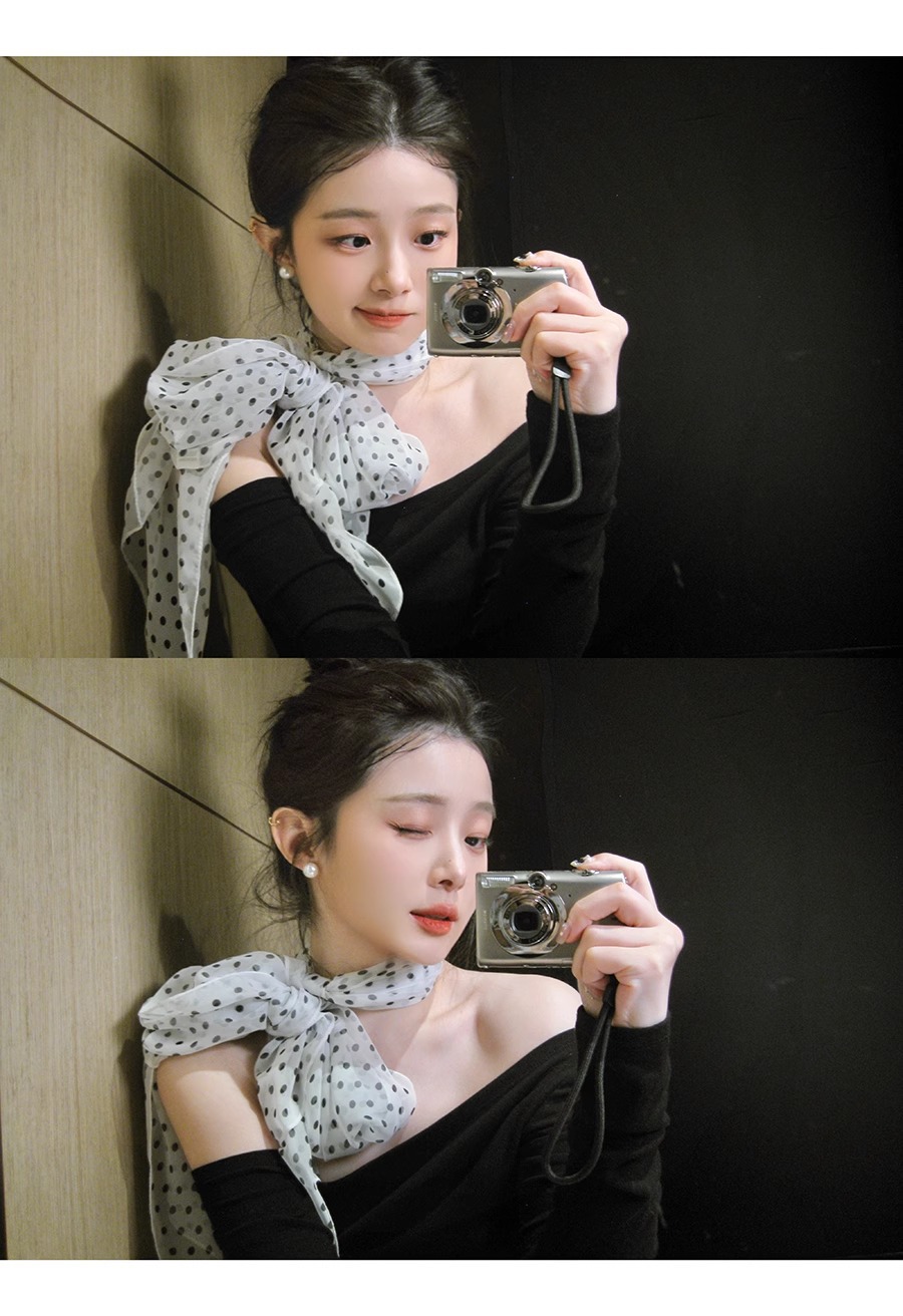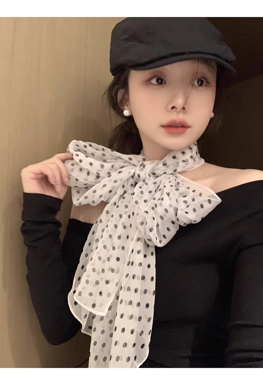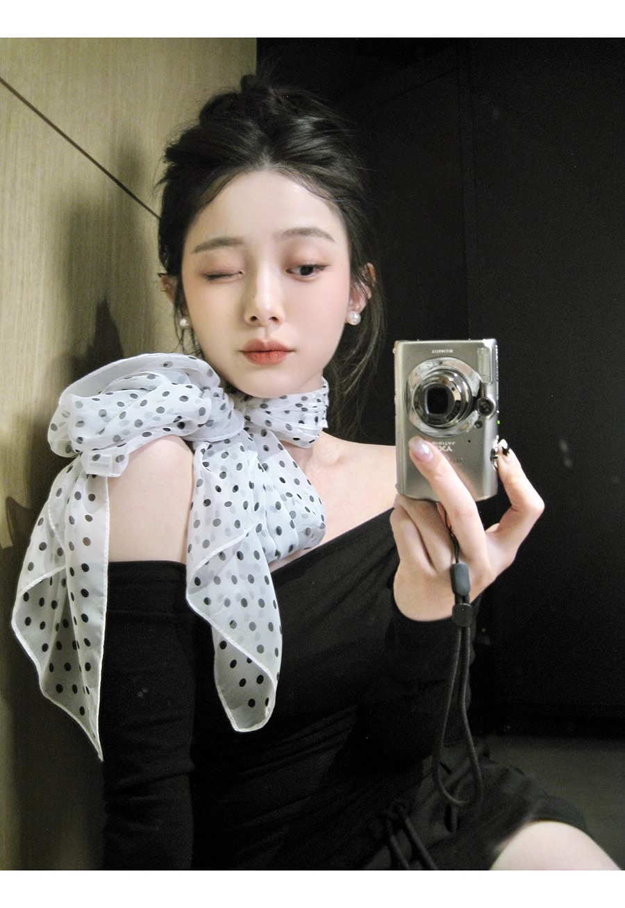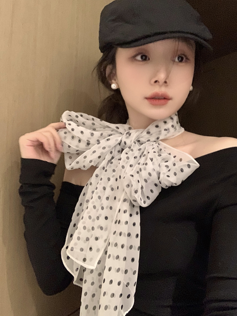 한국 스타일 흑백 폴로 도트 스카프 여성의 2025 봄 새로운 하이 엔드 목 긴 리본 목 액세서리스토어 가기