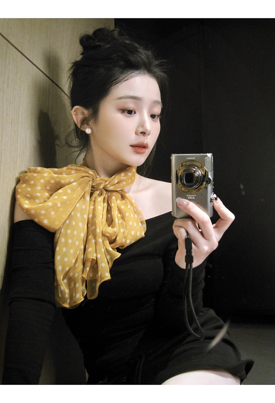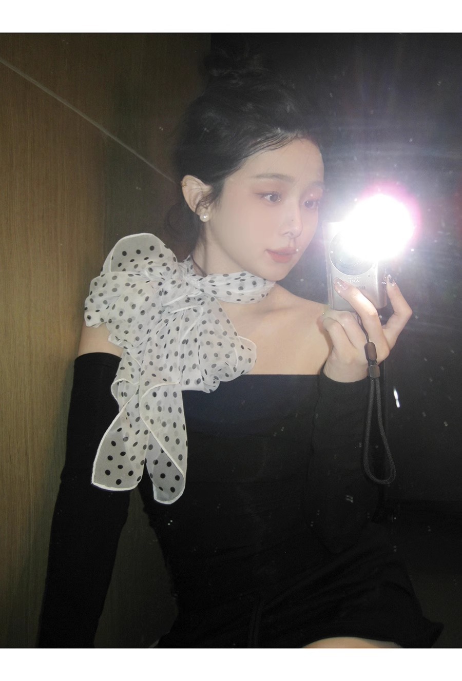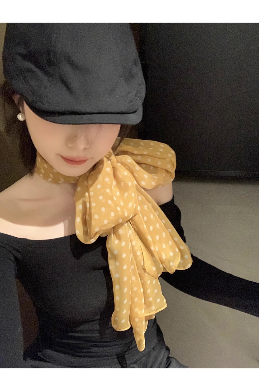 한국 스타일 흑백 폴로 도트 스카프 여성의 2025 봄 새로운 하이 엔드 목 긴 리본 목 액세서리스토어 가기