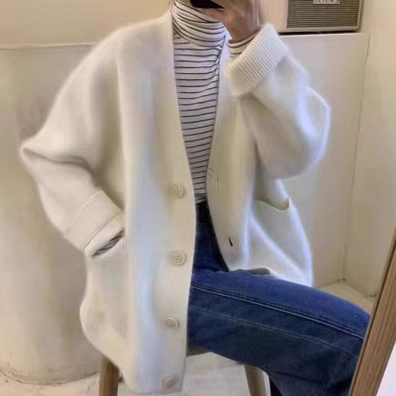 가을과 겨울 새로운 유럽 양모 카디건 여성용 V 넥 중간 길이의 스웨터 코트 두꺼운 느슨한 게으른 스타일 스웨터스토어 가기