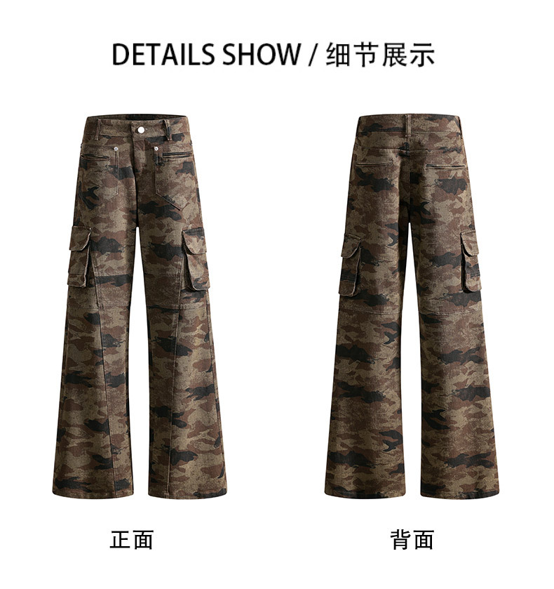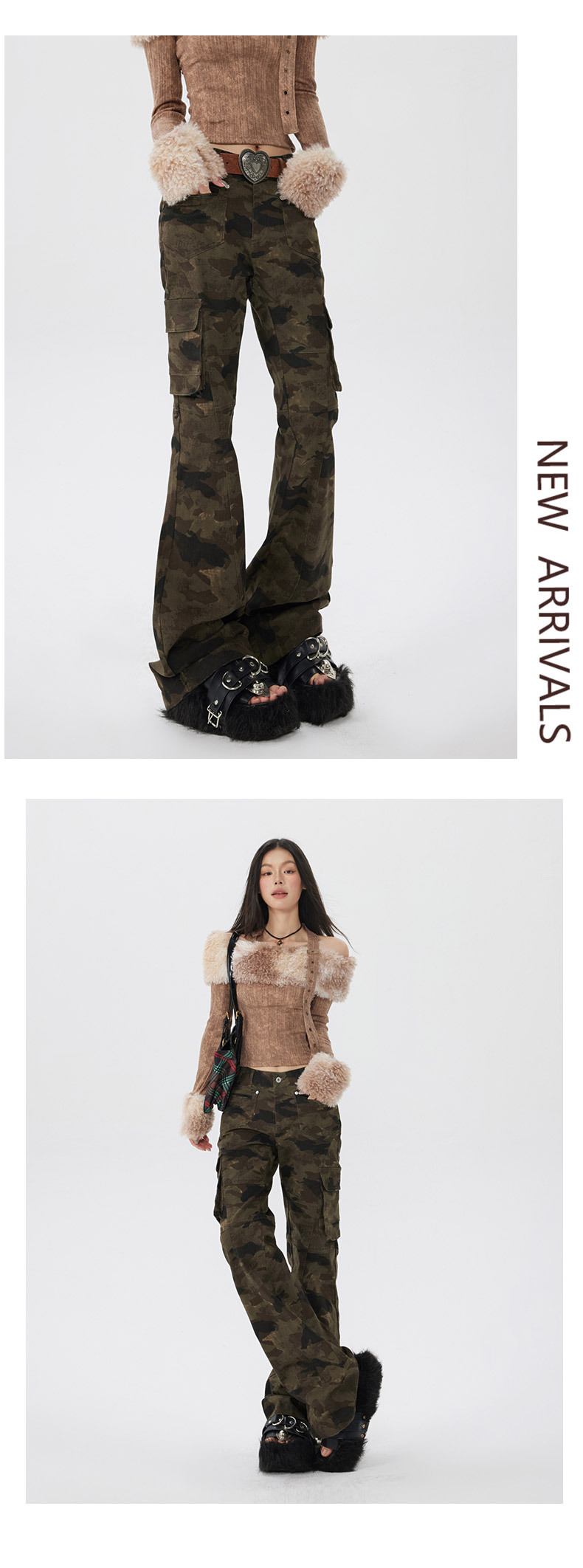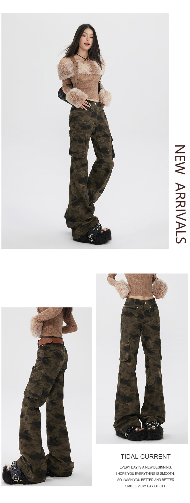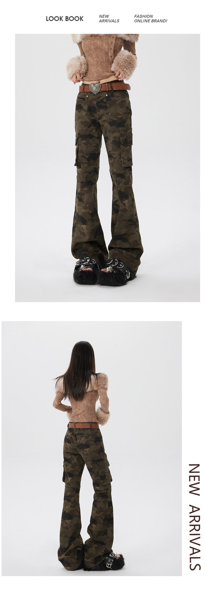 YD @ 레트로 마이크로 위장 바지 2024 가을/겨울 슬림 말굽 플레어 바지 위장 정사이즈