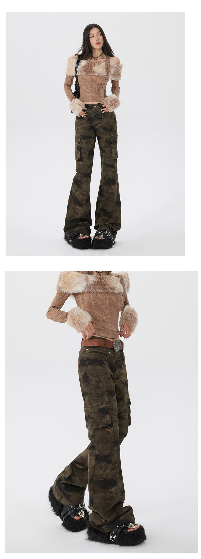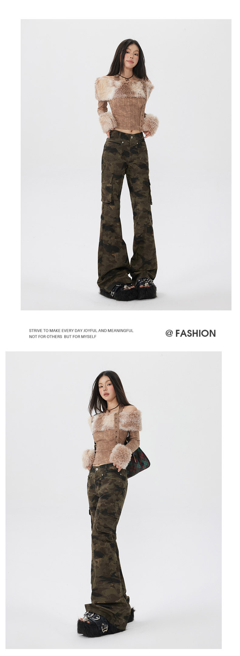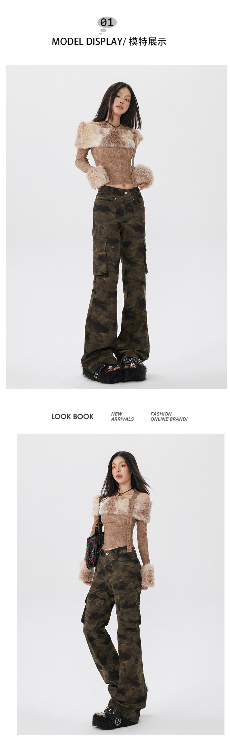 YD @ 레트로 마이크로 위장 바지 2024 가을/겨울 슬림 말굽 플레어 바지 위장 정사이즈