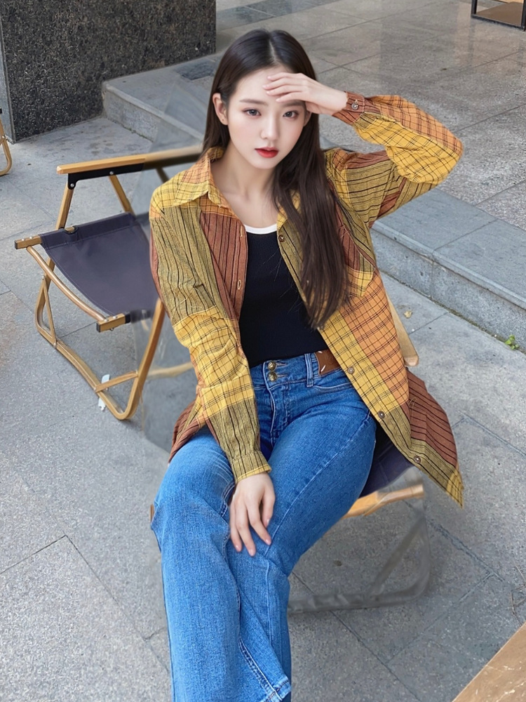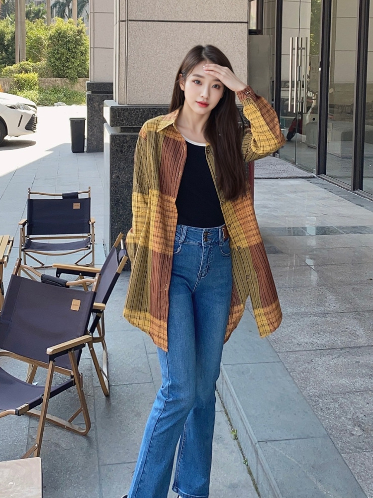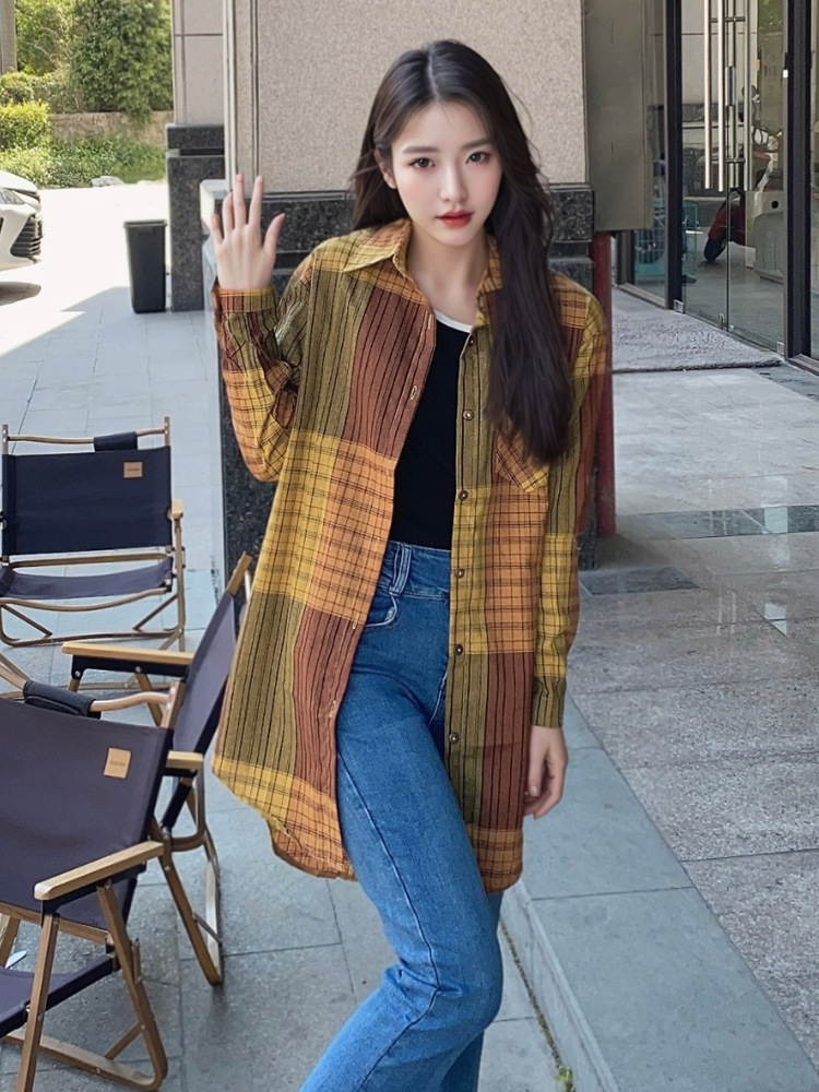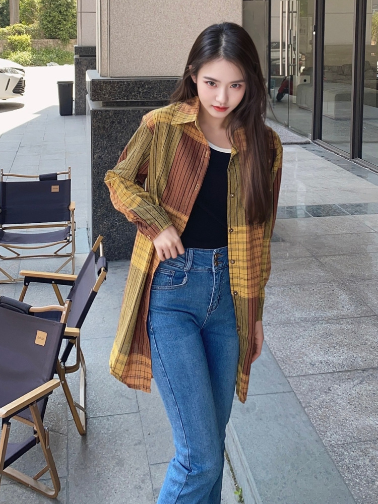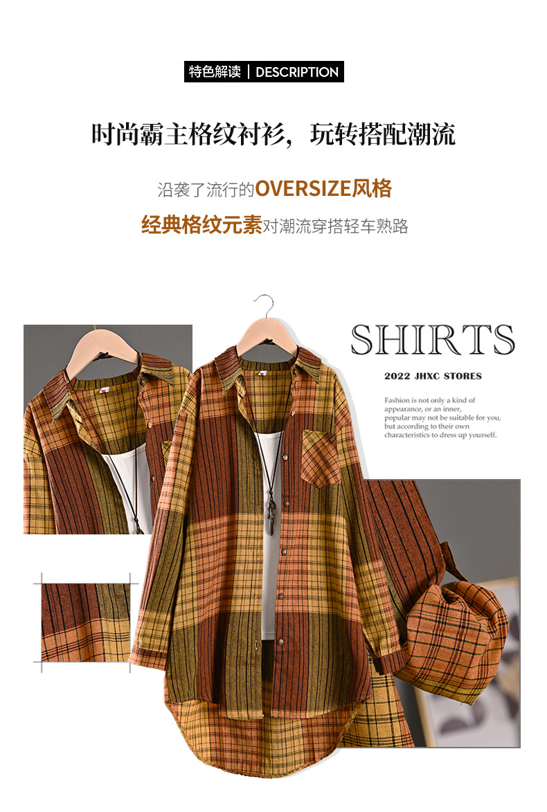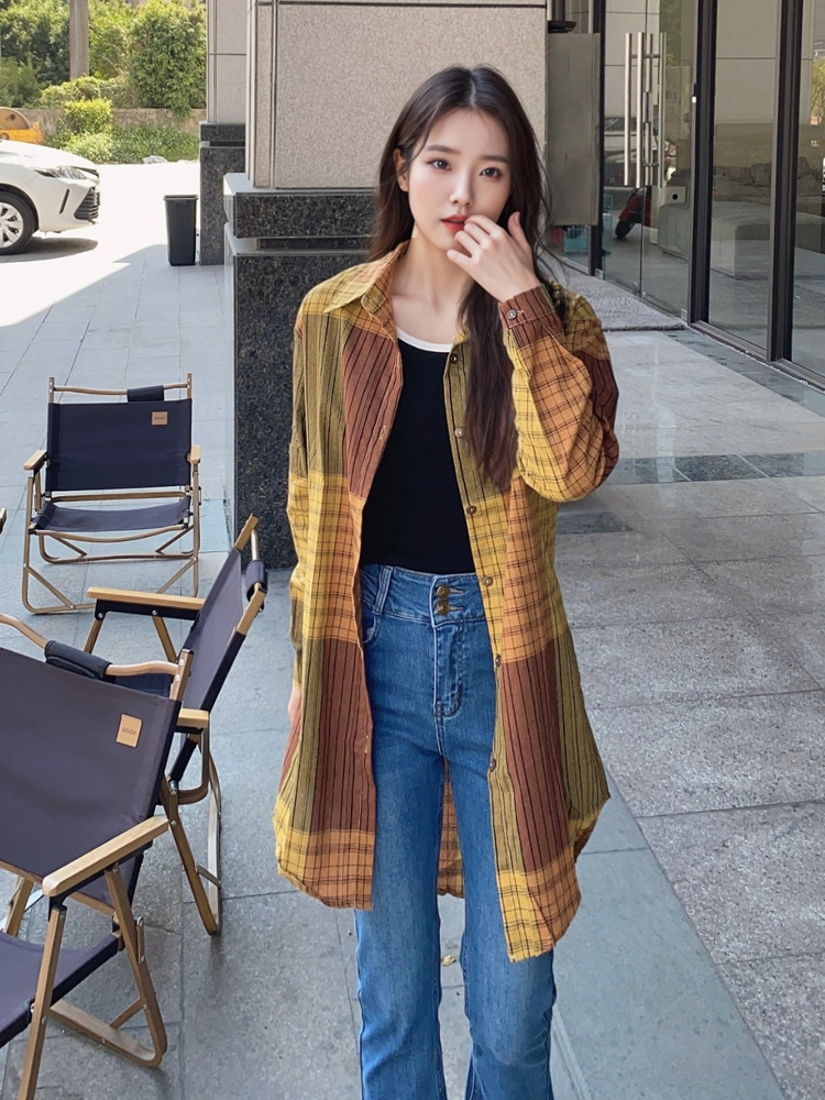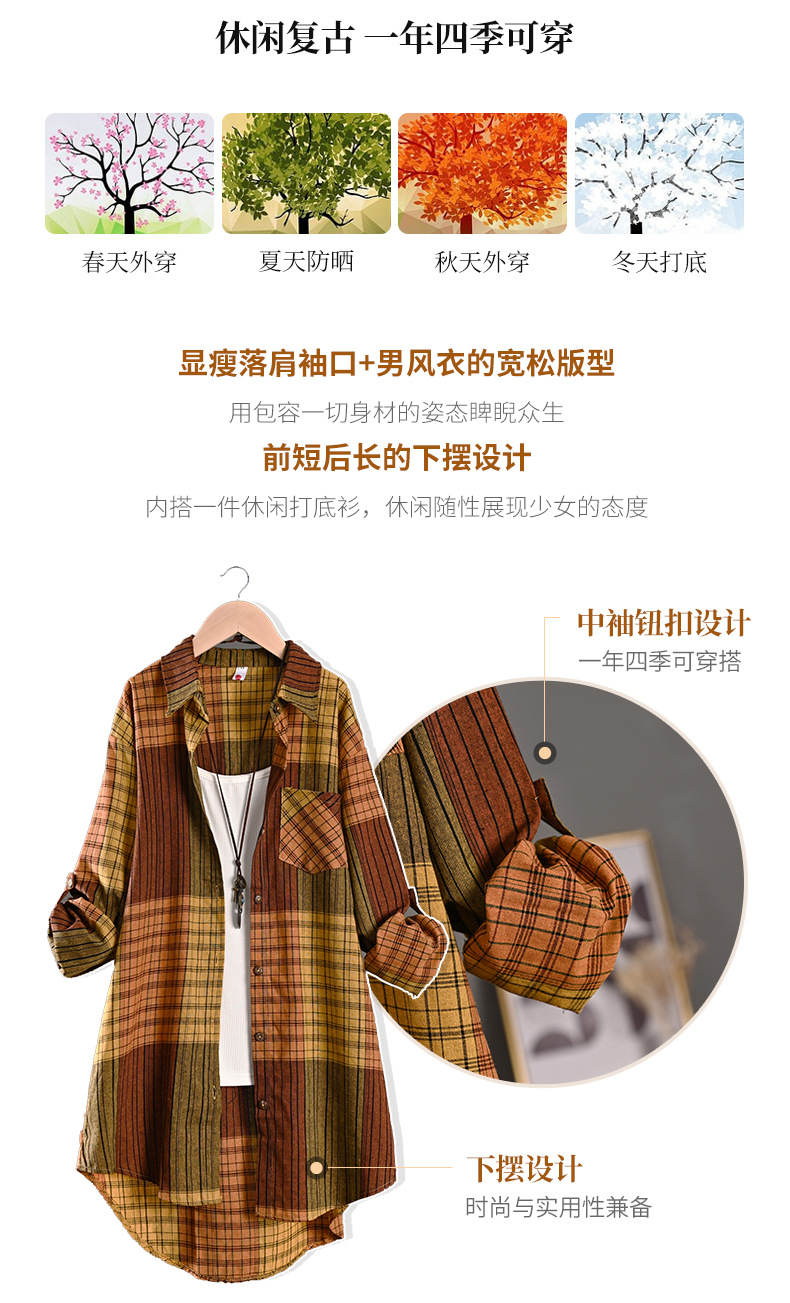 빈티지 예술면과 리넨 셔츠 여성의 봄과 여름 얇은 코트 느슨한 격자 무늬 셔츠 중간 길이 디자인 센스 선 스크린 탑스토어 가기