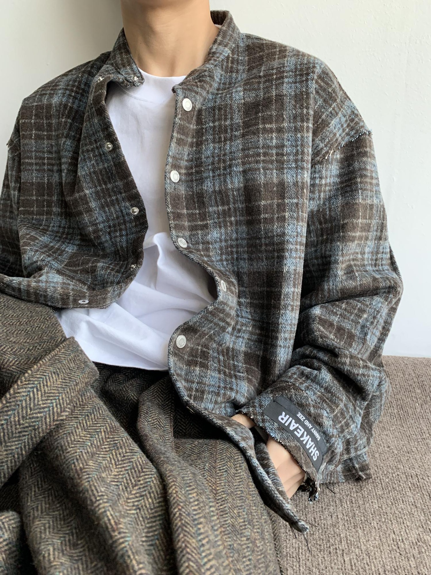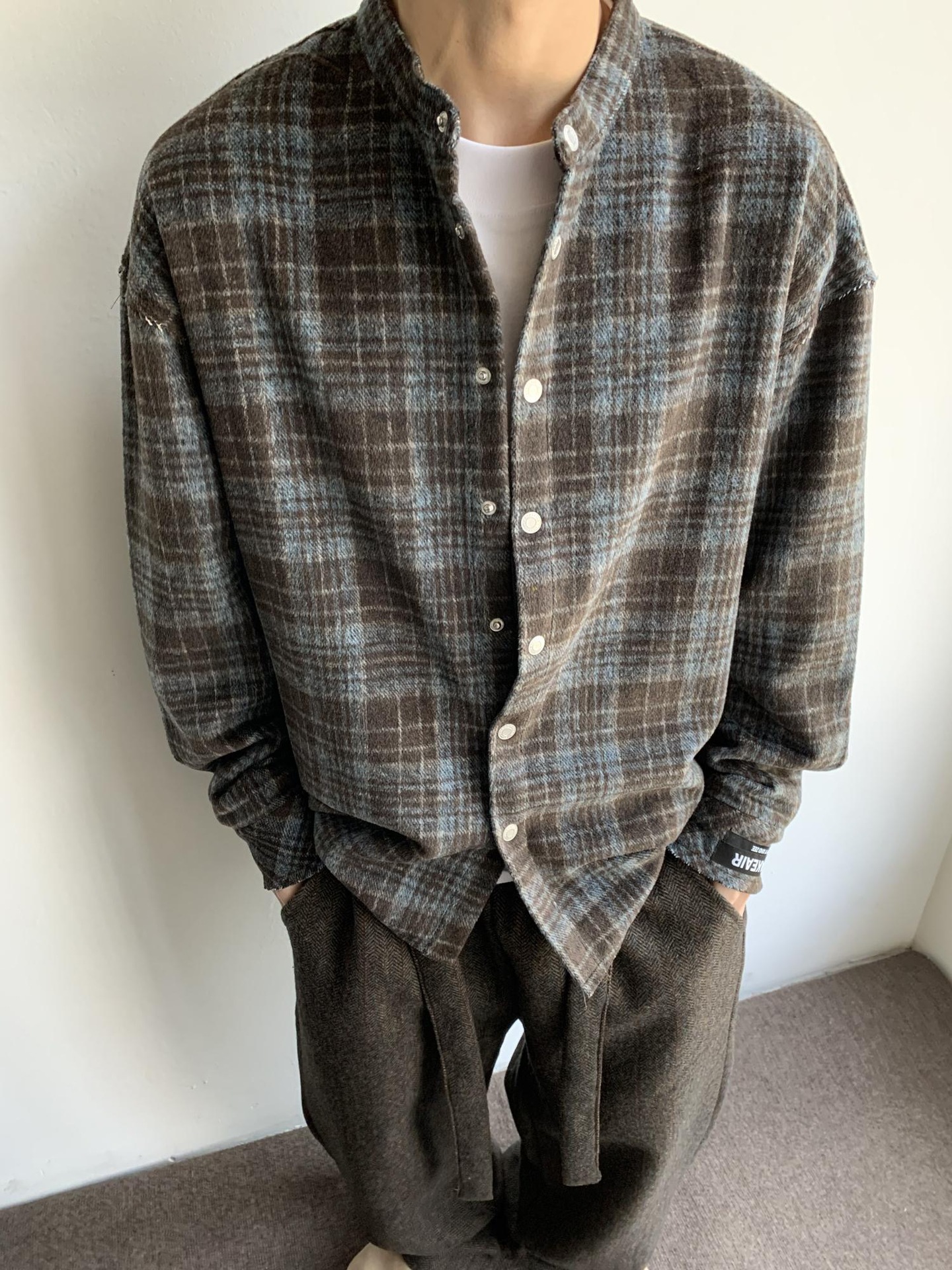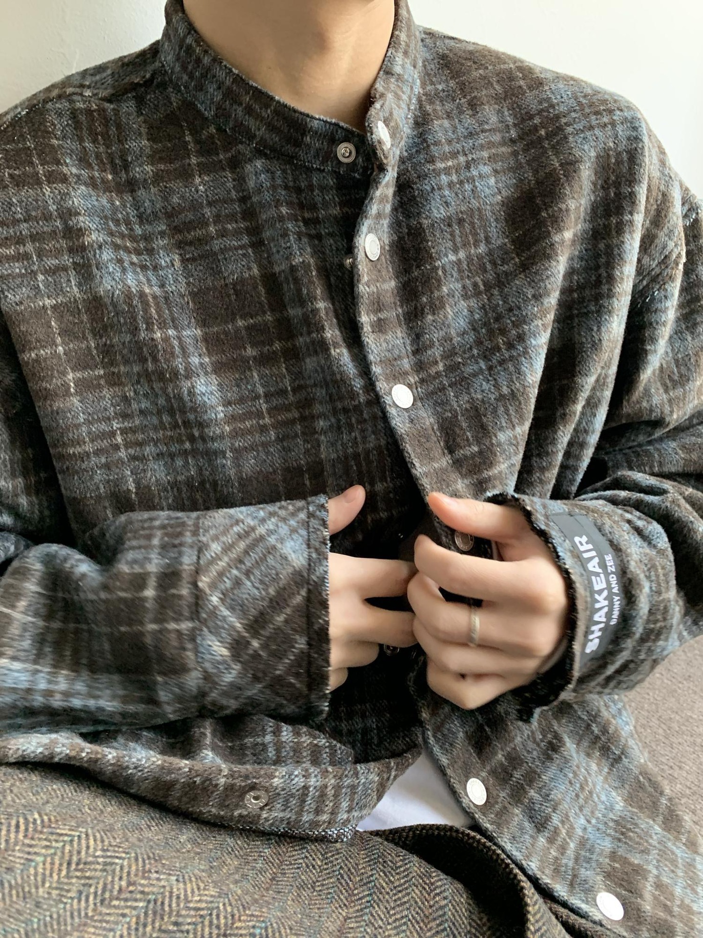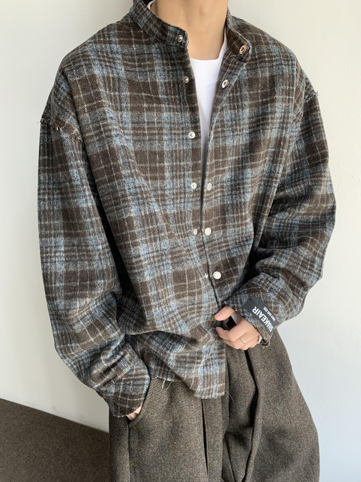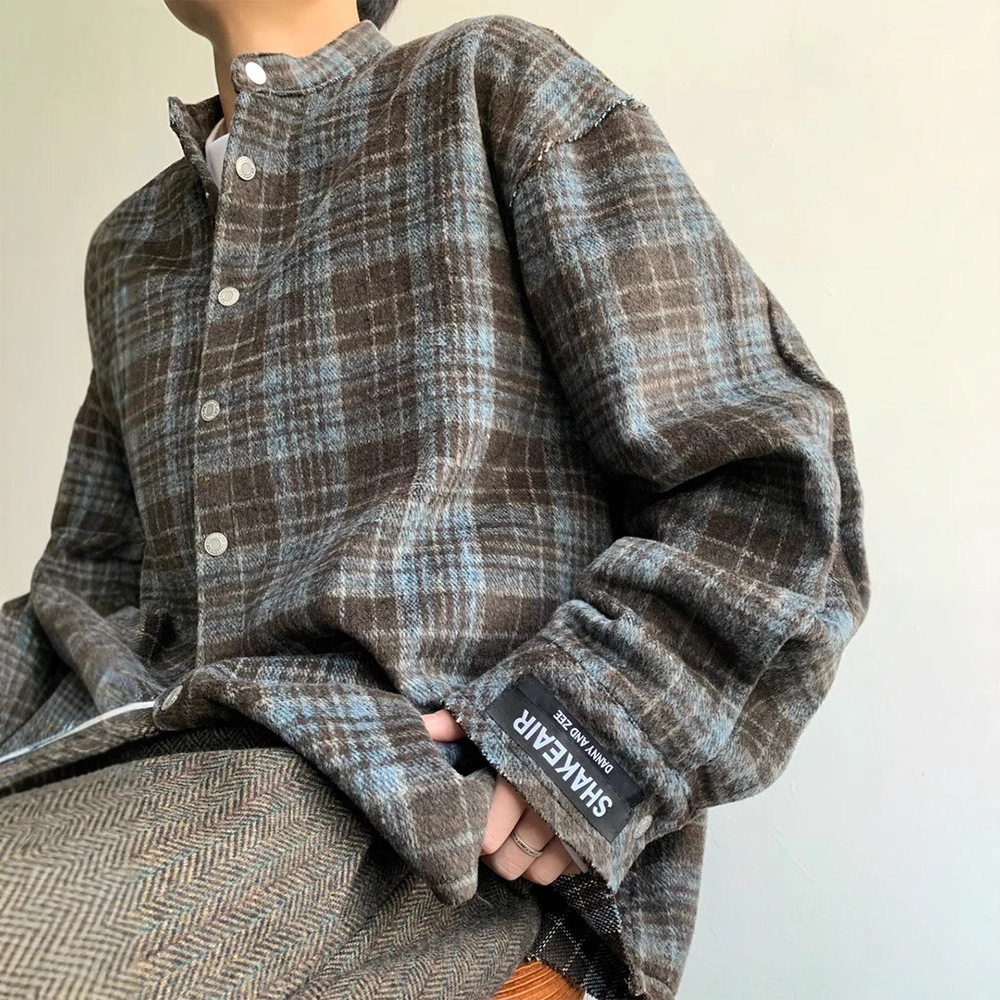아메리칸 스타일 레트로 블루 다크 브라운 격자 무늬 셔츠 남자의 봄과 가을 벨벳 스타일 게으른 셔츠 깨끗한 직물 얇은 코트