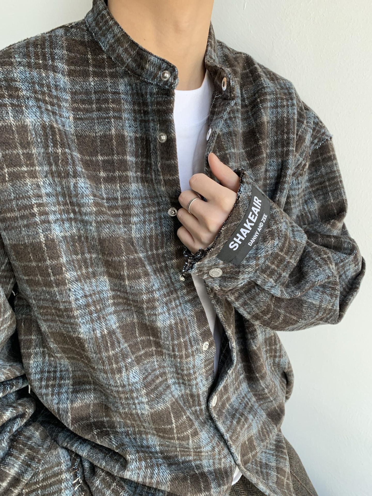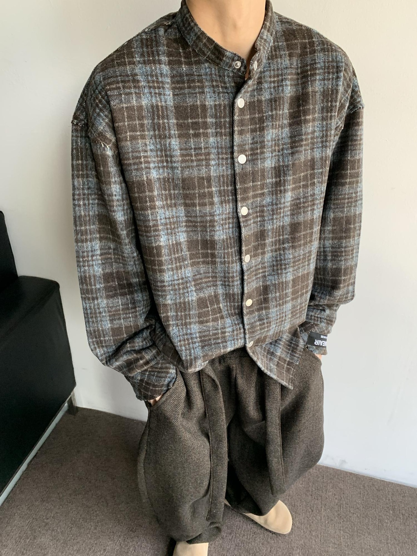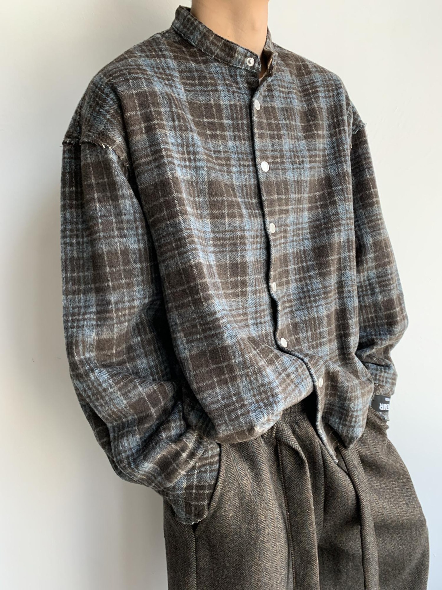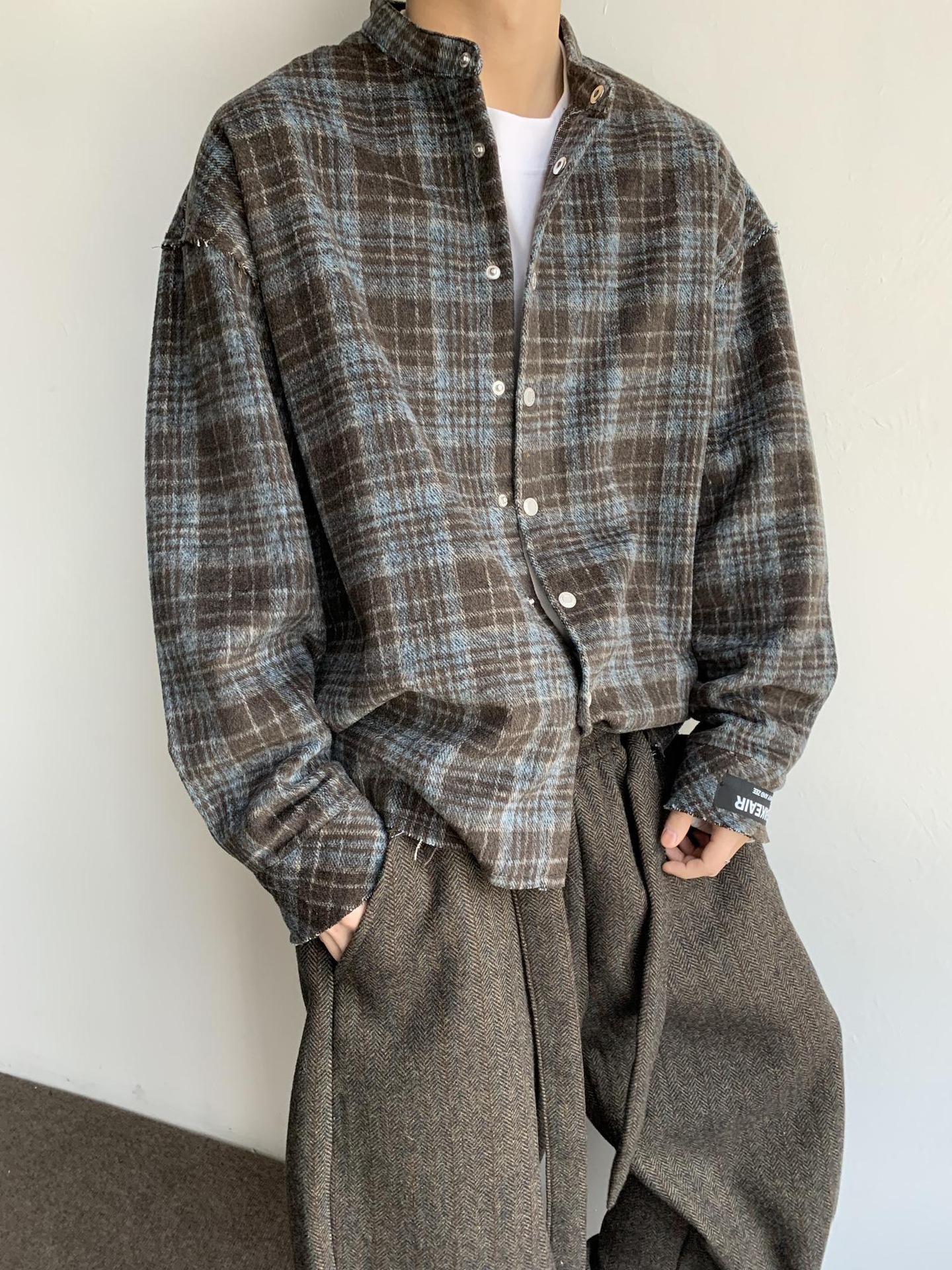 아메리칸 스타일 레트로 블루 다크 브라운 격자 무늬 셔츠 남자의 봄과 가을 벨벳 스타일 게으른 셔츠 깨끗한 직물 얇은 코트