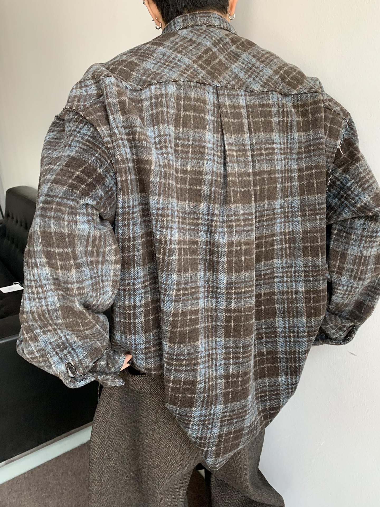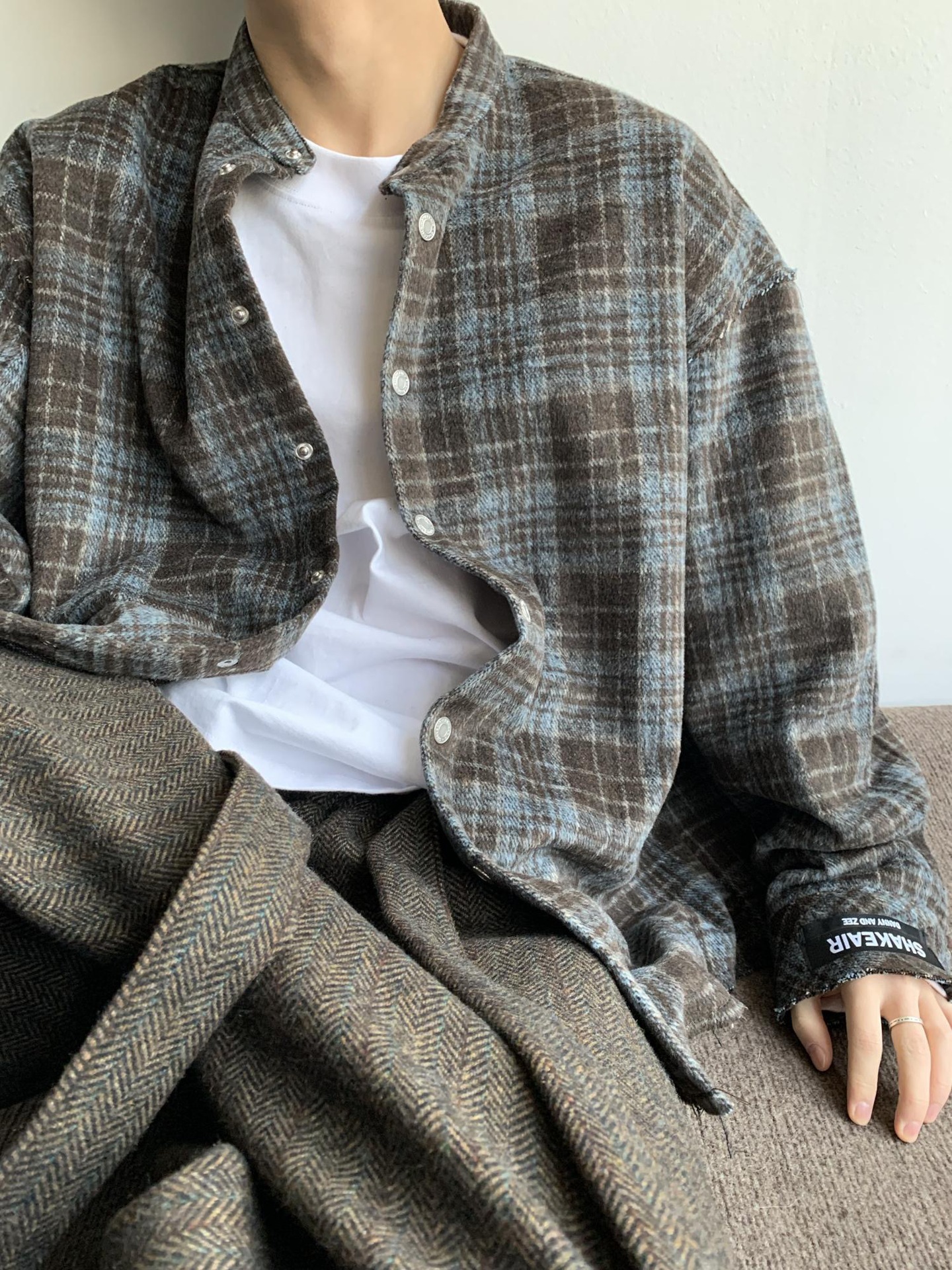 아메리칸 스타일 레트로 블루 다크 브라운 격자 무늬 셔츠 남자의 봄과 가을 벨벳 스타일 게으른 셔츠 깨끗한 직물 얇은 코트스토어 가기