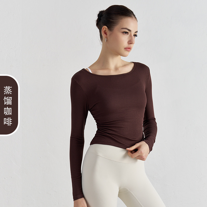 가을과 겨울 새로운 모달 요가 의류 여성의 섹시한 플리츠 슬림 핏 크루 넥 스포츠 최고 여성 피트니스 긴 소매