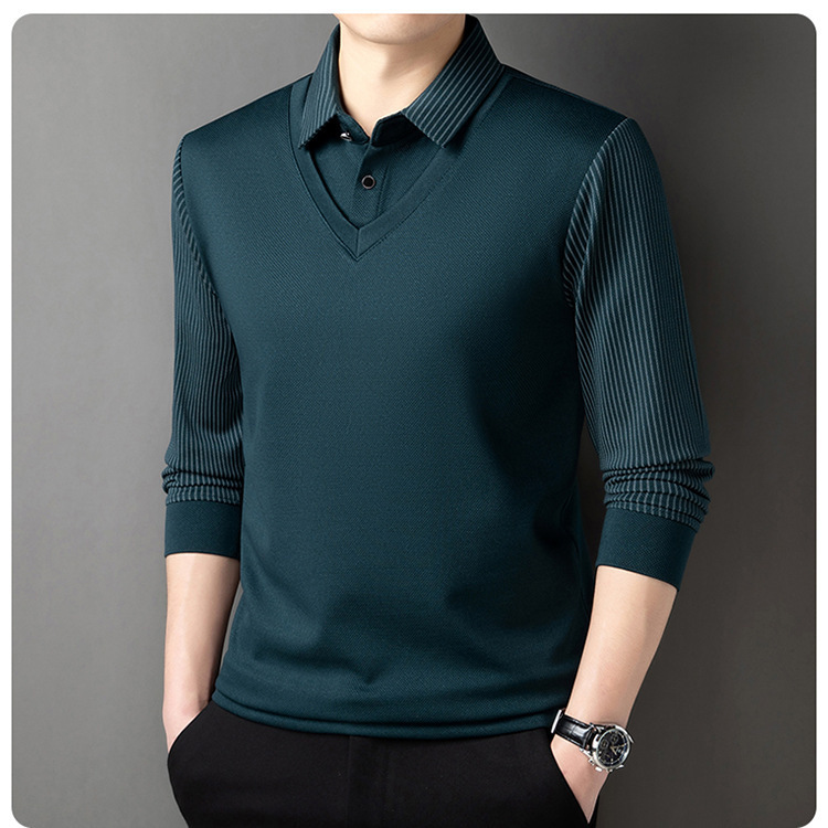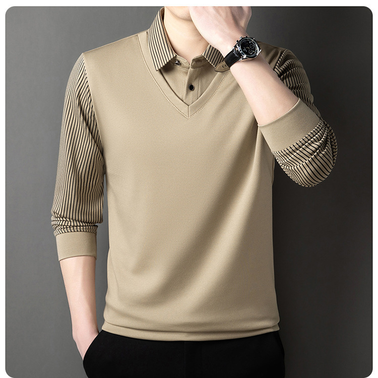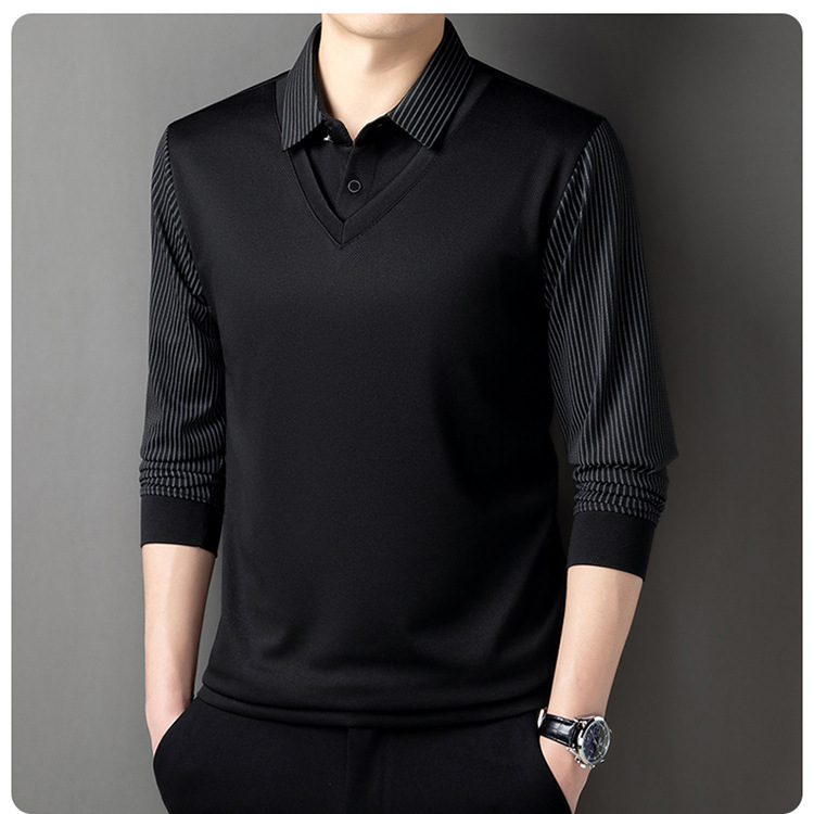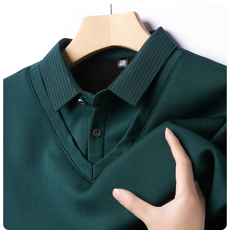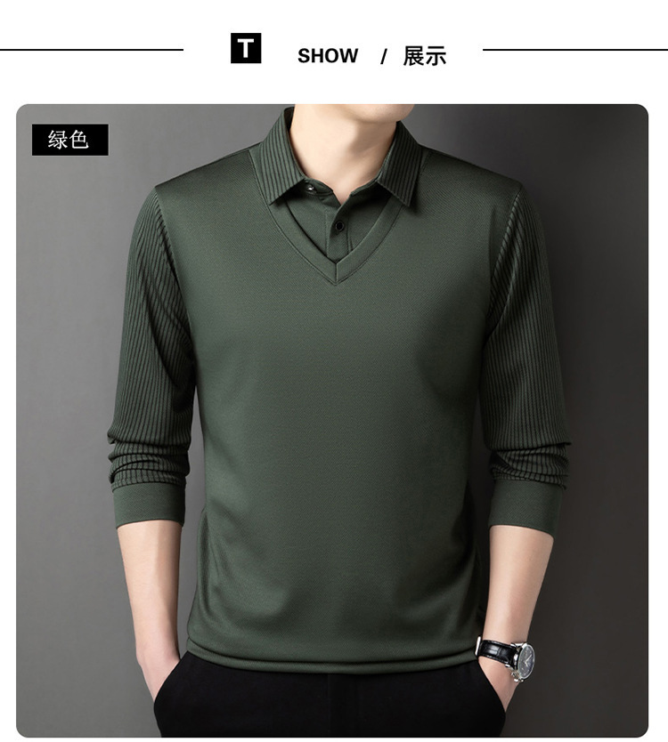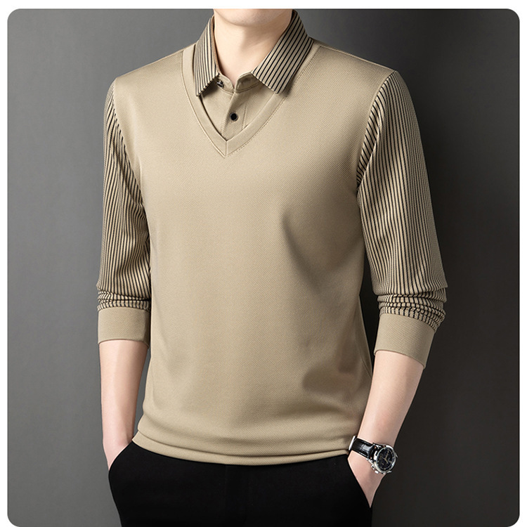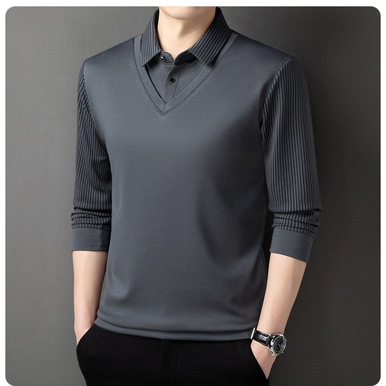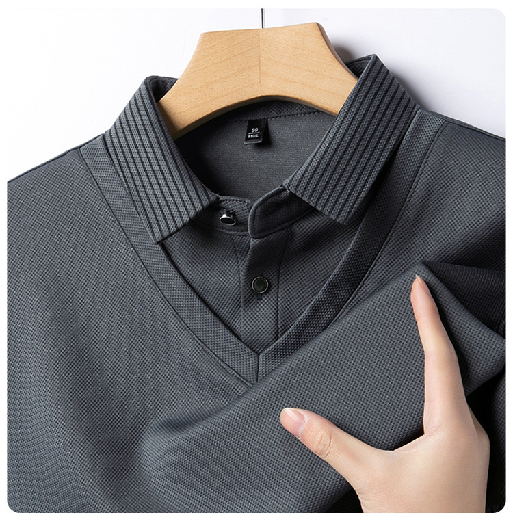 공장 직접 2025 봄 새로운 남성 가짜 투피스 티셔츠 얇은 아빠 셔츠 칼라 스티칭베이스 셔츠