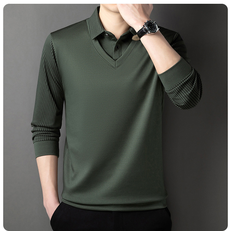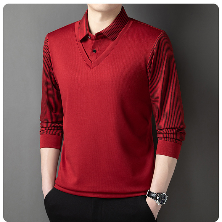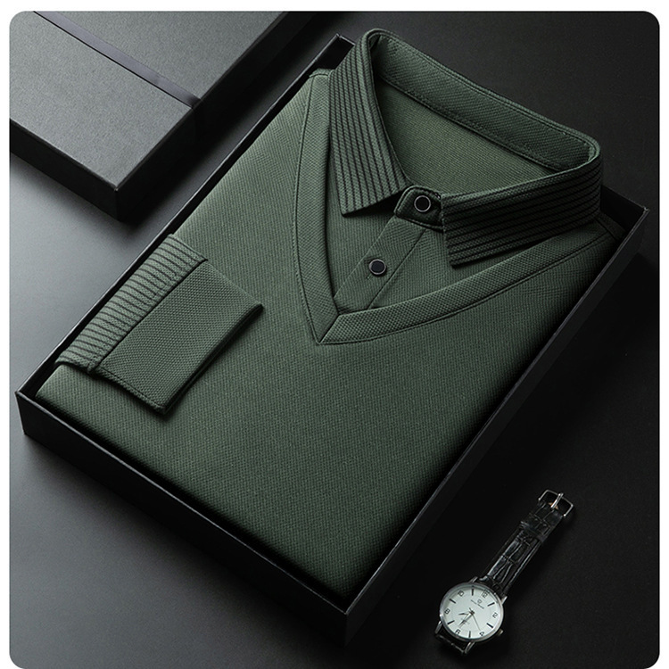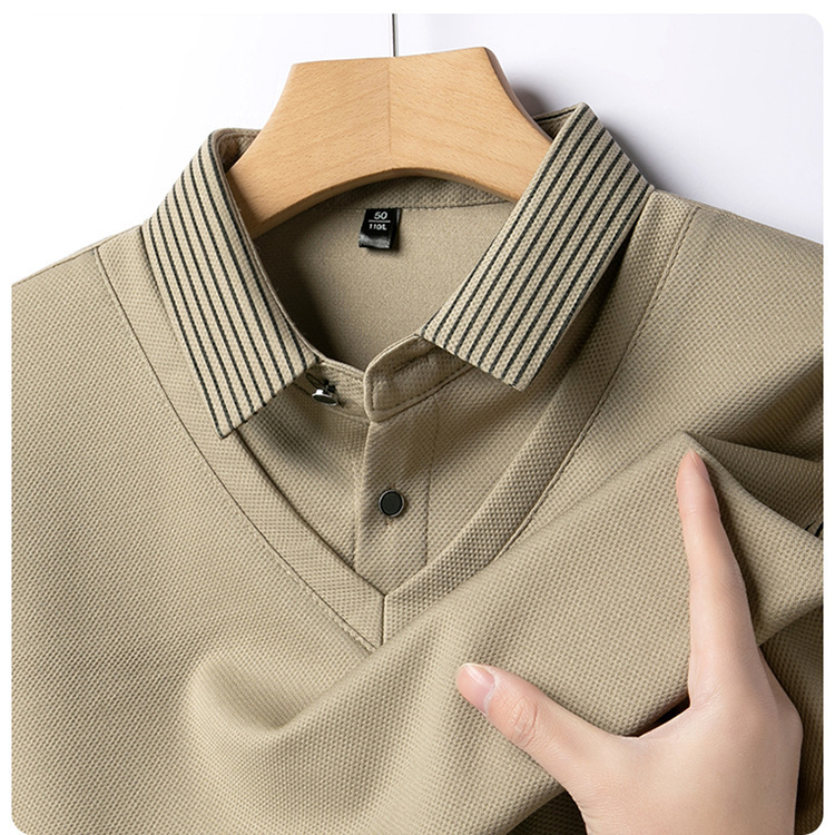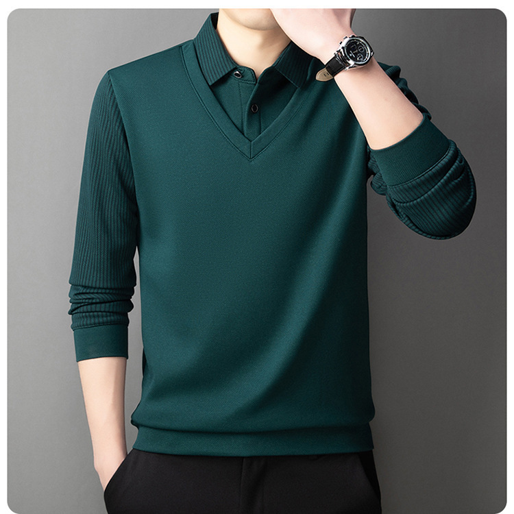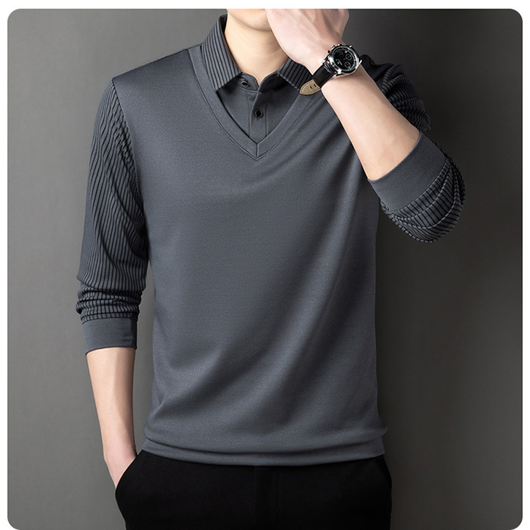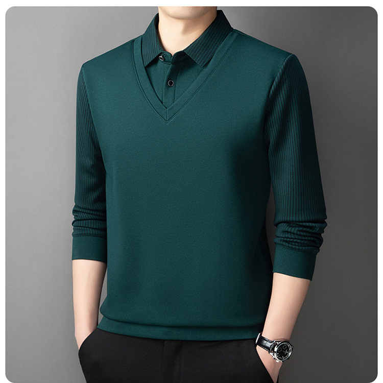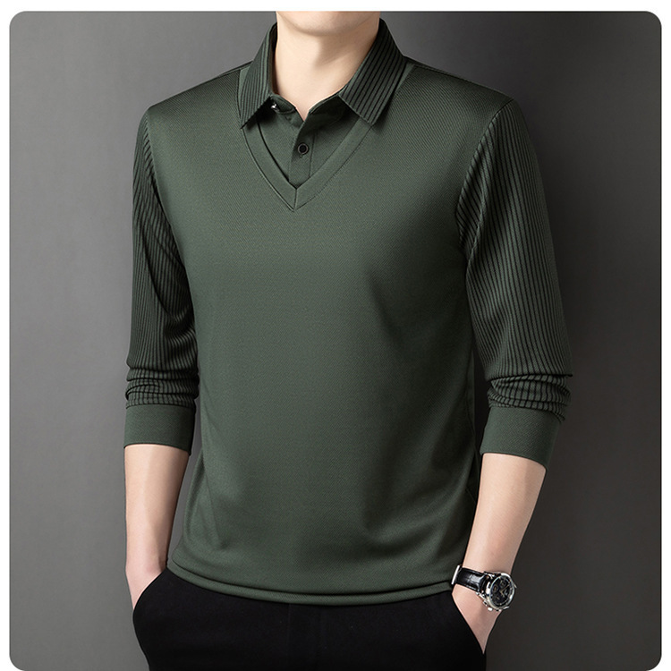 공장 직접 2025 봄 새로운 남성 가짜 투피스 티셔츠 얇은 아빠 셔츠 칼라 스티칭베이스 셔츠