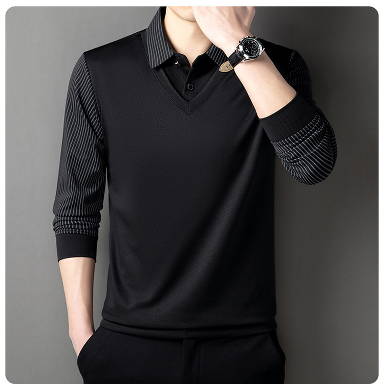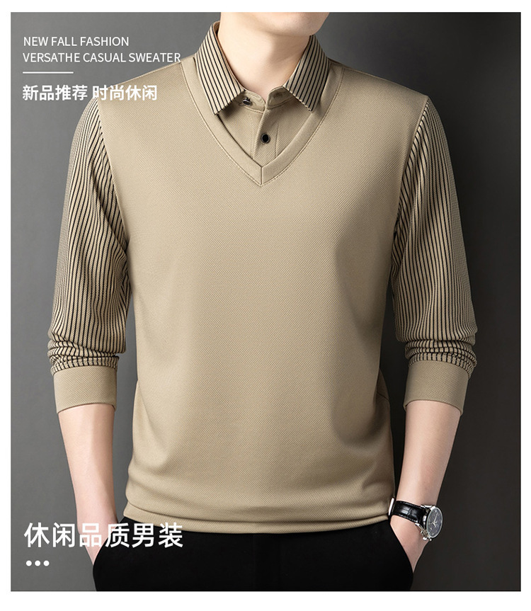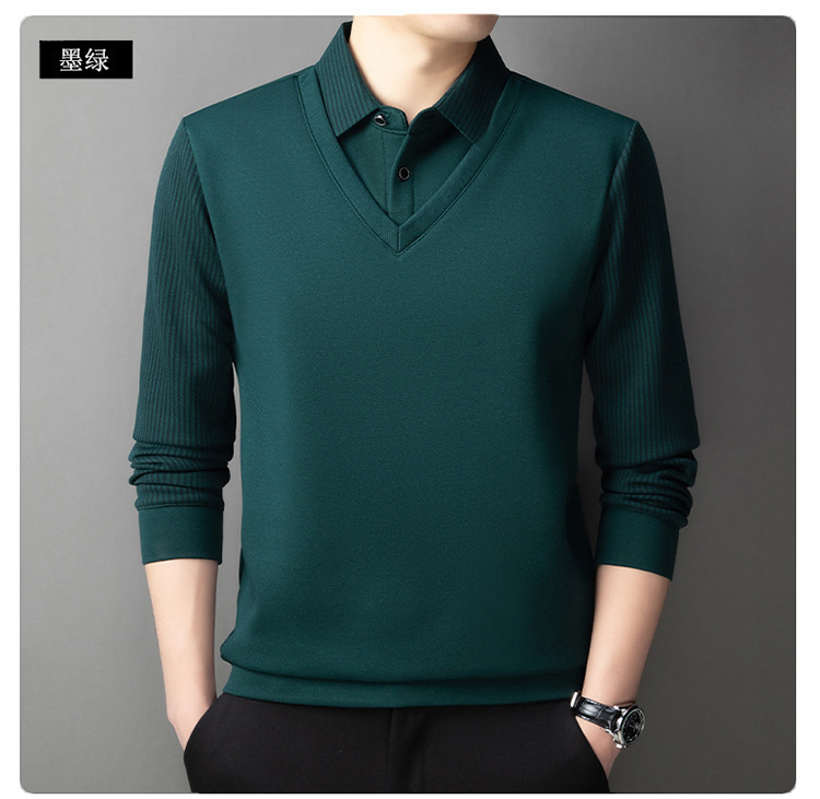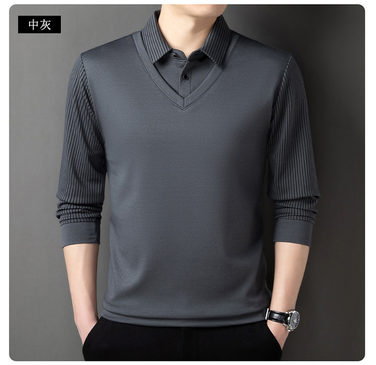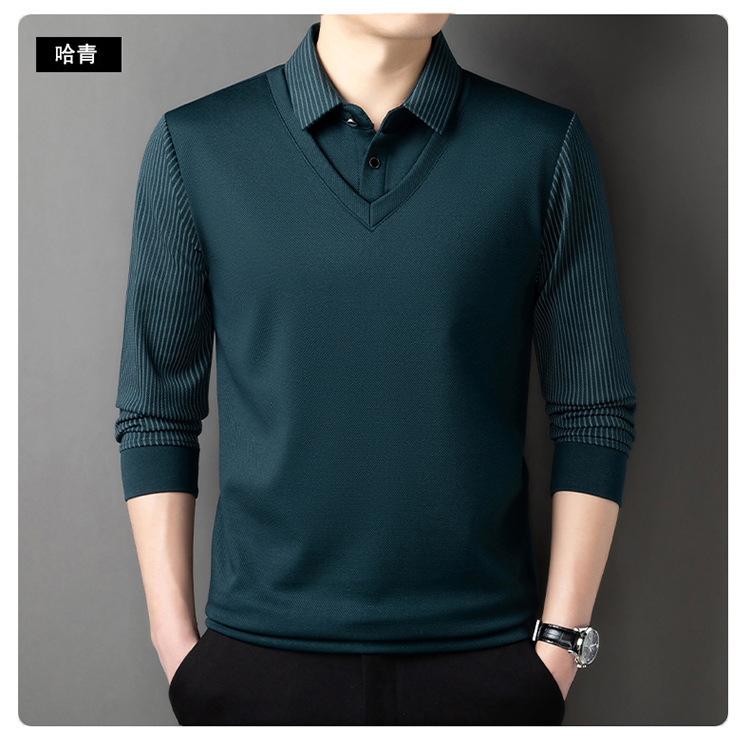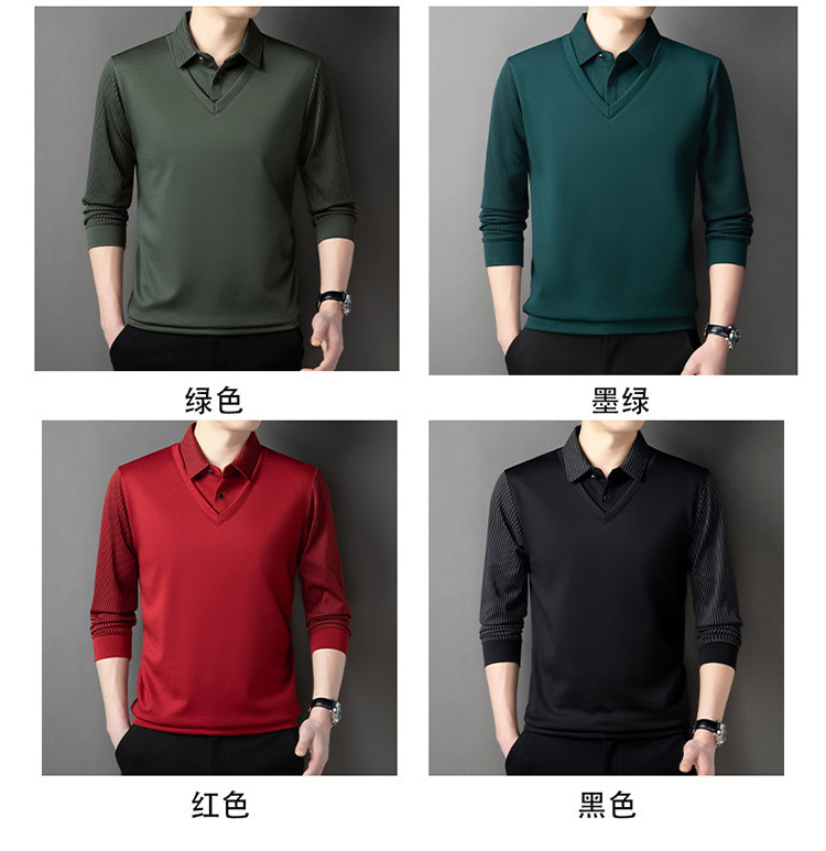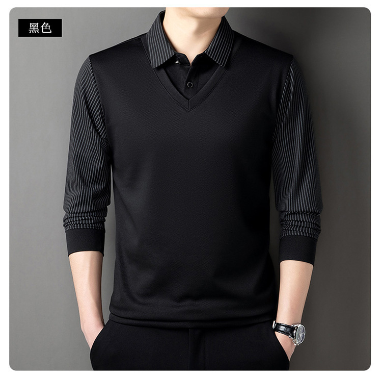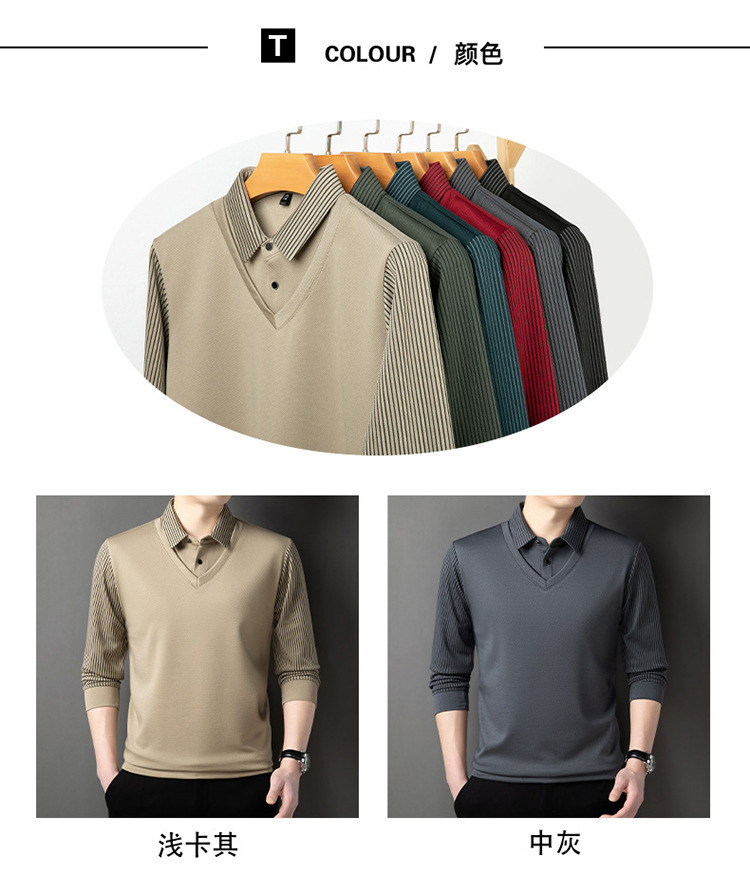 厂家直销2024春季新款男士假两件T恤薄款爸爸装衬衫领拼接打底衫
