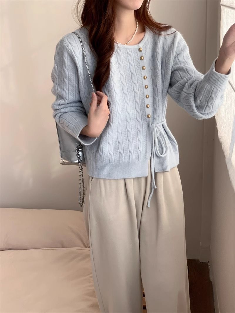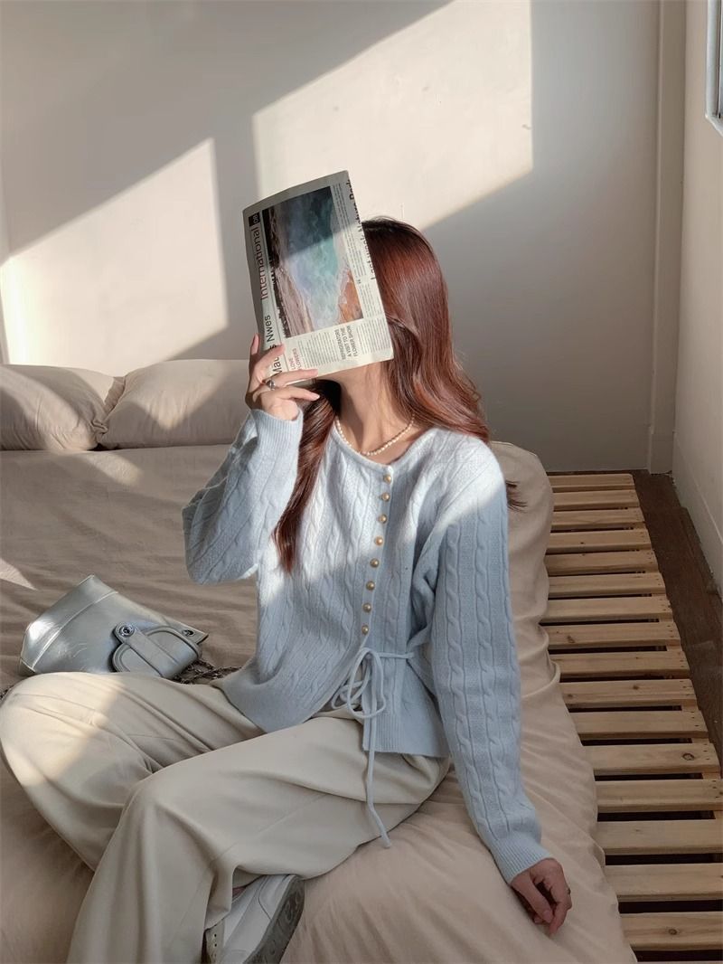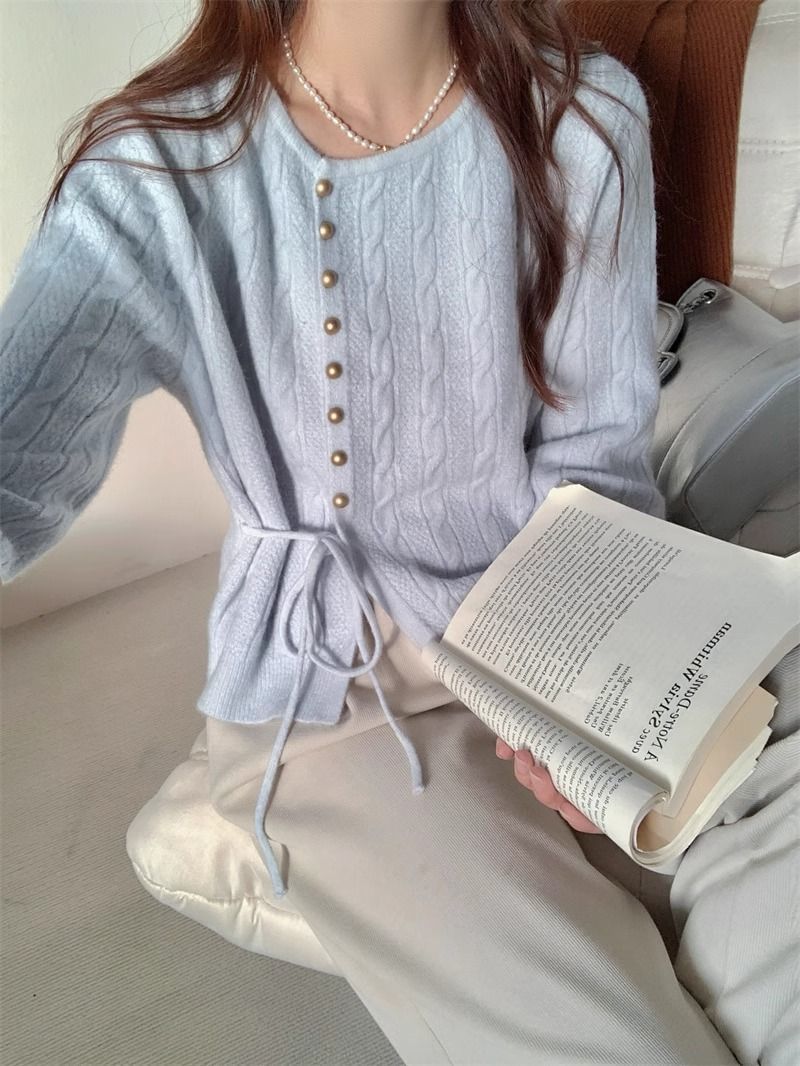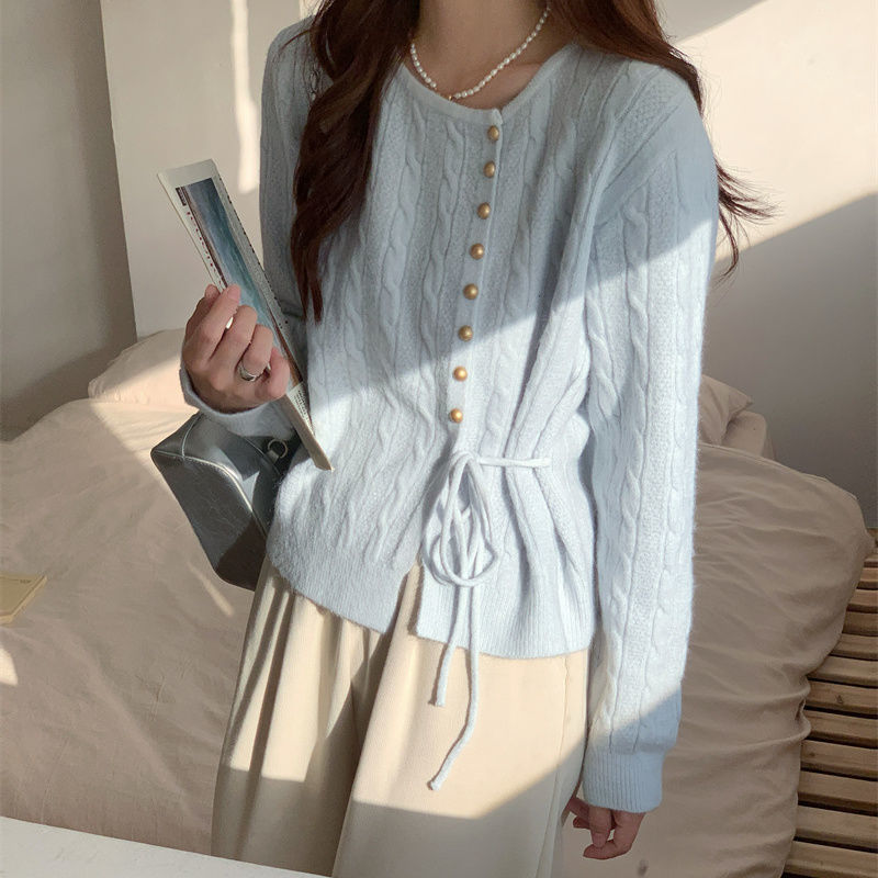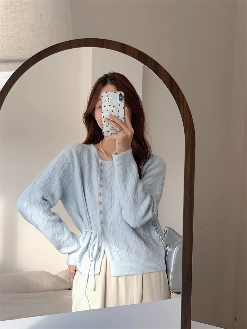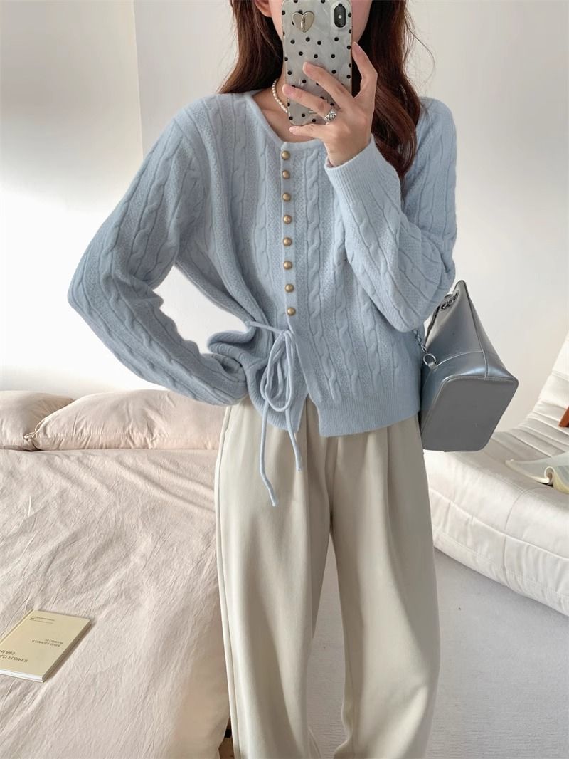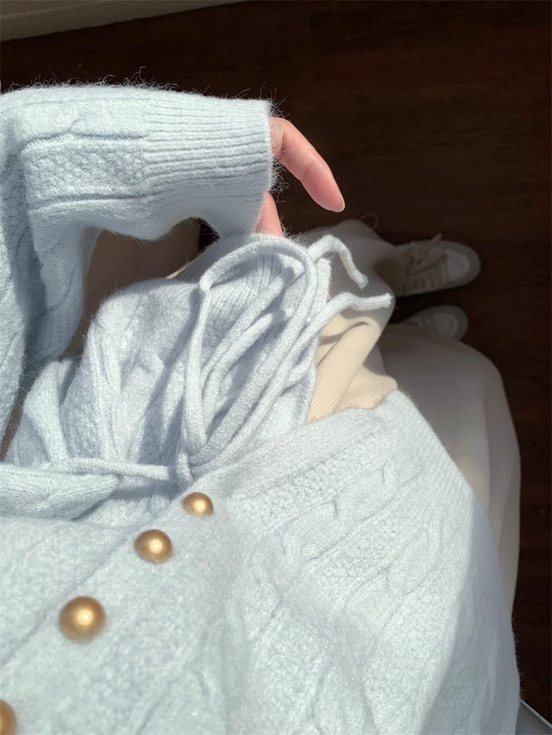 OLISI 부드러운 우유 스타일 블루 트위스트 한국 스타일 내부 니트 탑 카디건 게으른 느슨한 스웨터 여성 코트