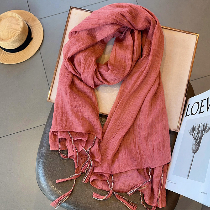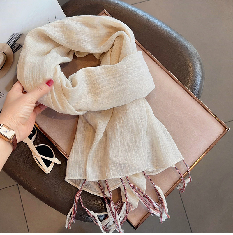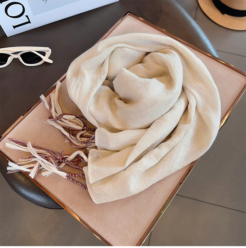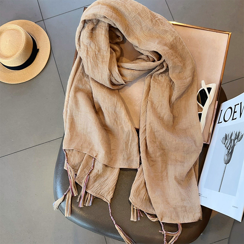 素净纯色棉麻流苏围巾超大防晒披肩女春秋护颈纱巾度假沙滩丝巾夏