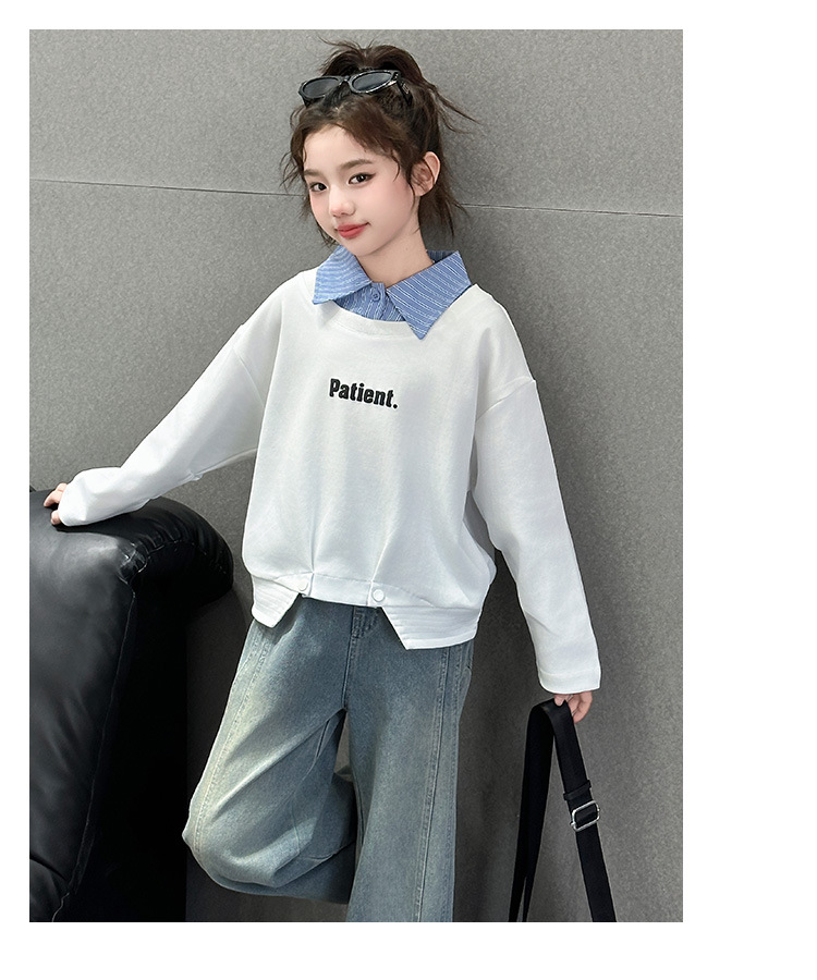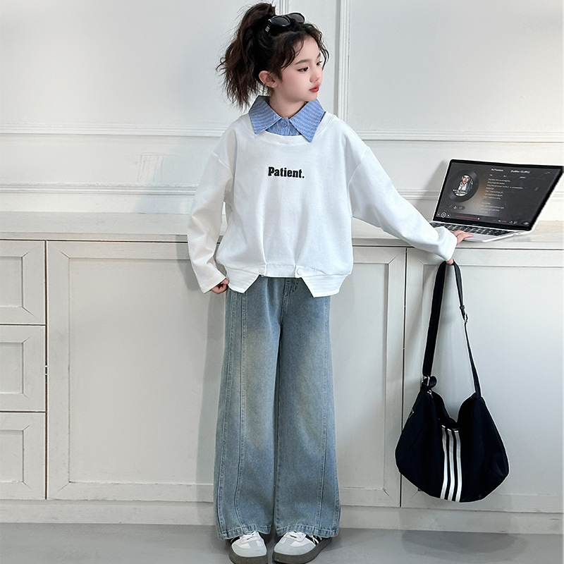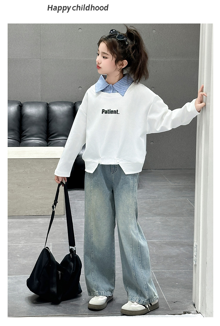소녀의 봄과 가을 세트 2025 새로운 아이들의 세련된 유행 소녀의 인터넷 축하 옷깃 넓은 다리 바지 두 조각 세트스토어 가기
