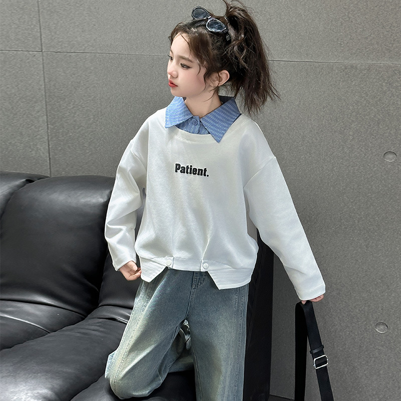 소녀의 봄과 가을 세트 2025 새로운 아이들의 세련된 유행 소녀의 인터넷 축하 옷깃 넓은 다리 바지 두 조각 세트
