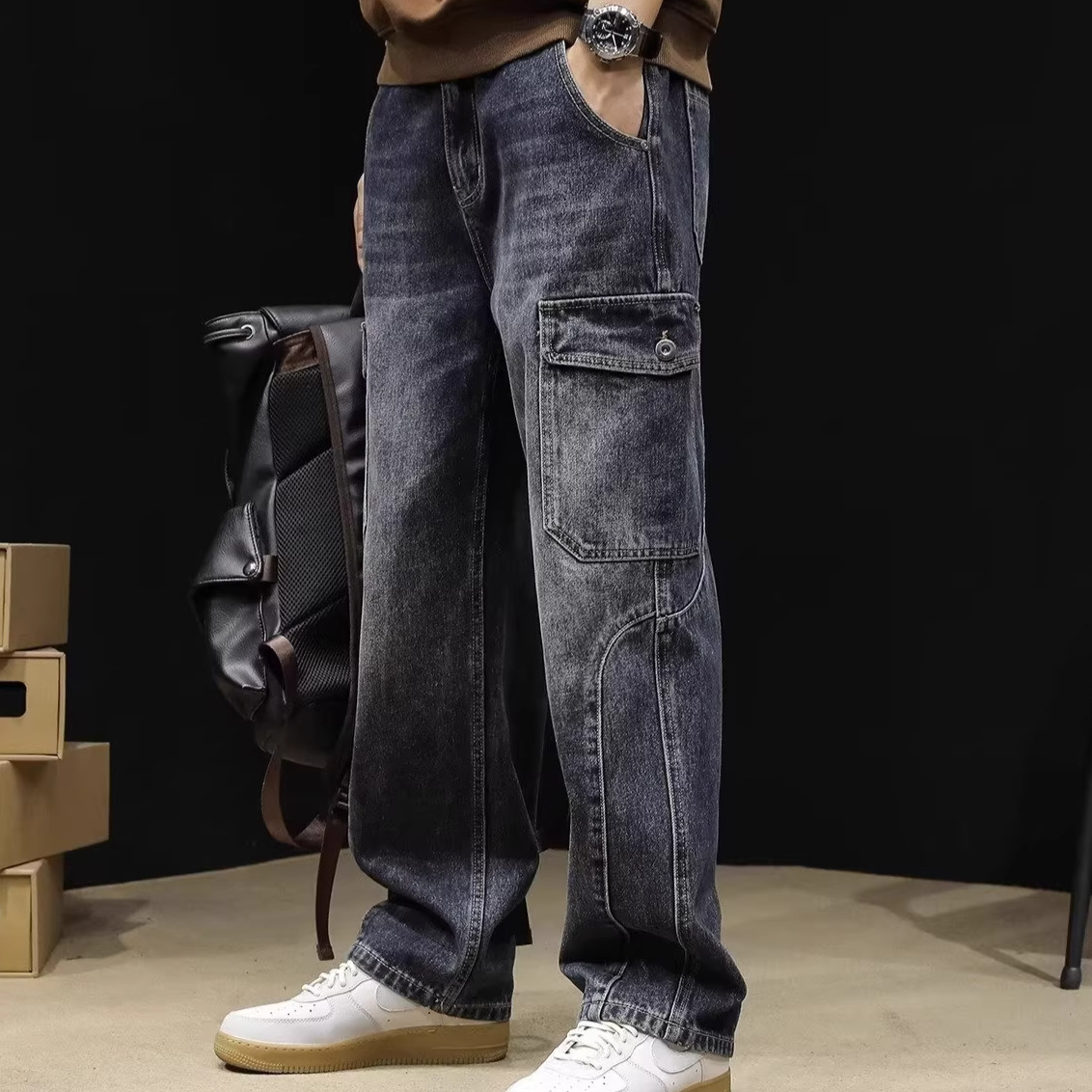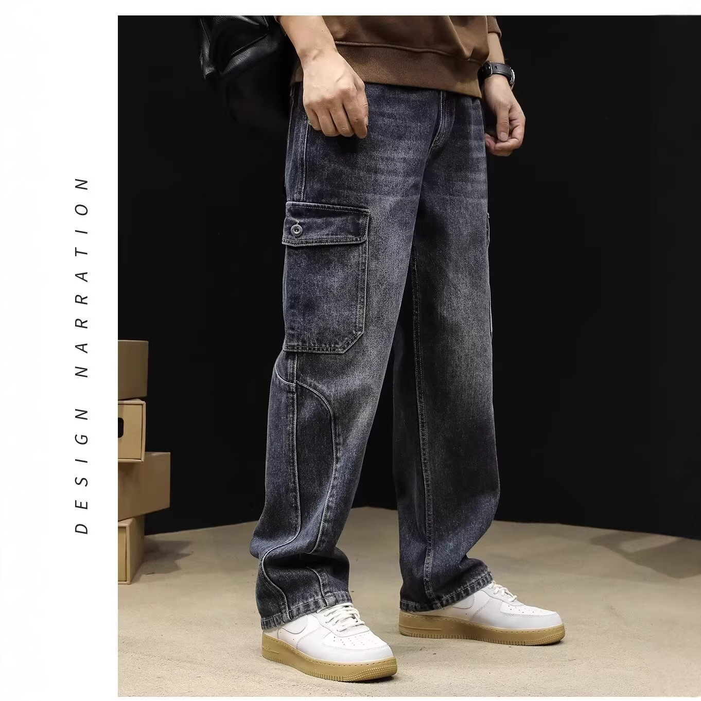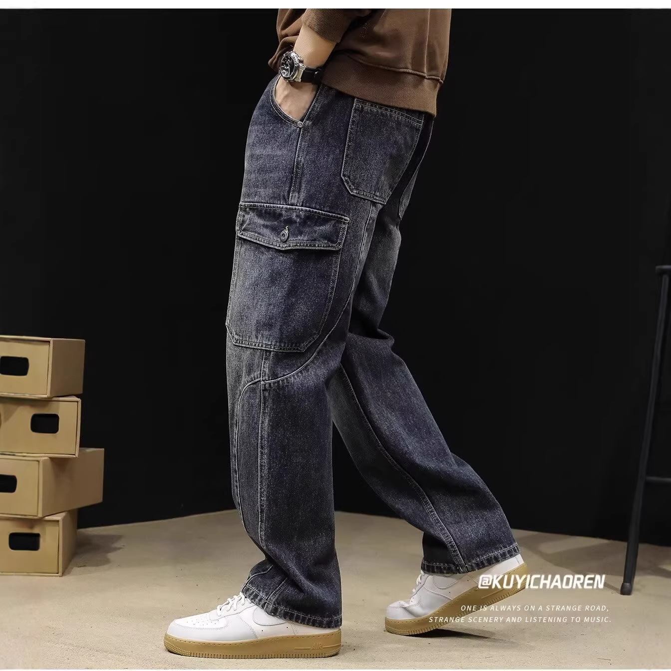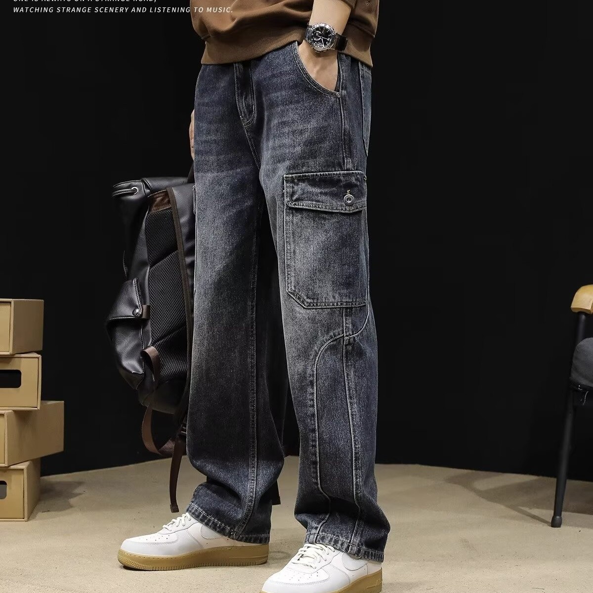 봄과 가을 트렌디 브랜드 빈티지 스트레이트 청바지 남성용 느슨한 캐주얼 엘라스토 허리 바지 넓은 다리 바지스토어 가기