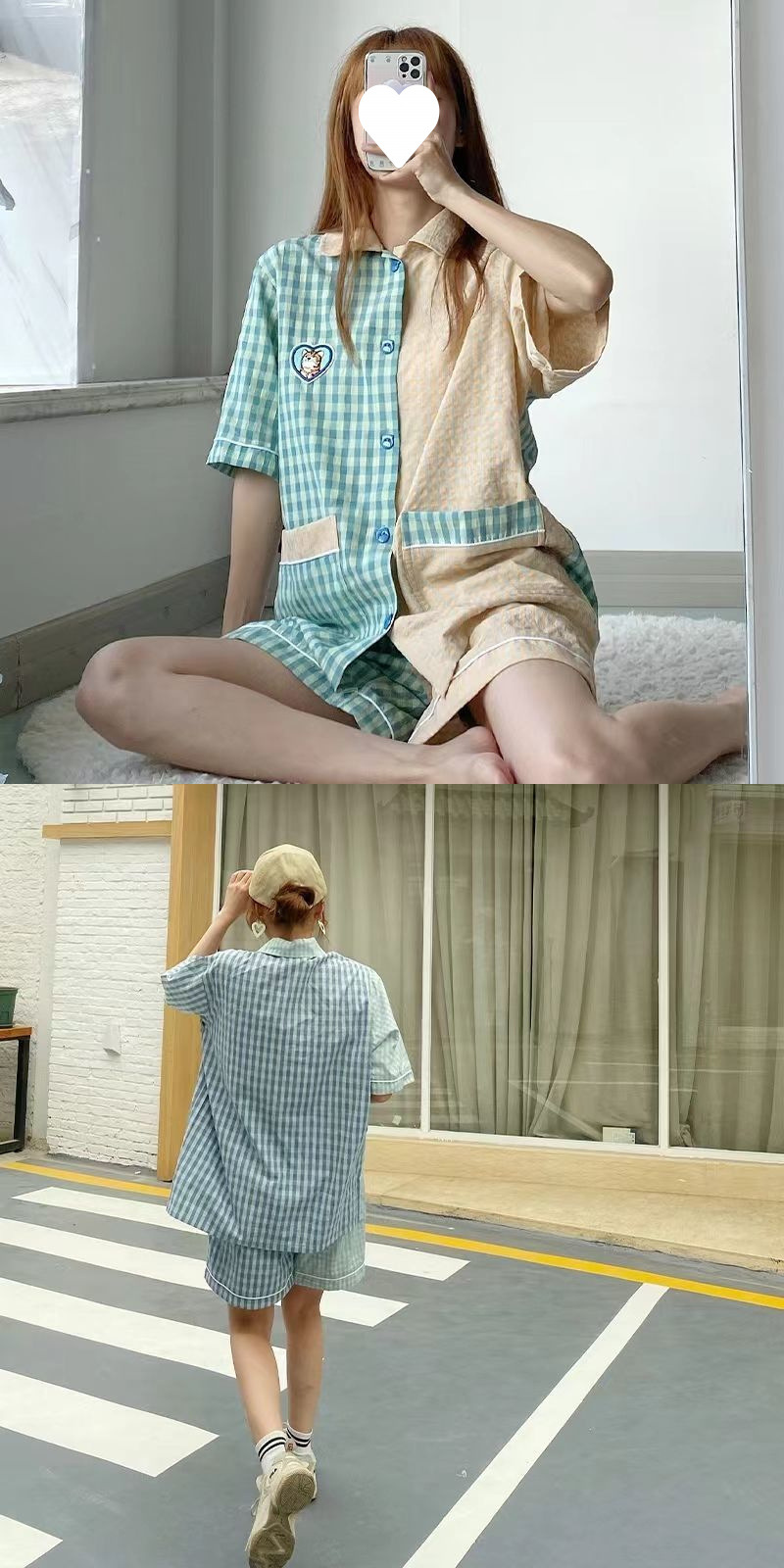 여름 새로운 격자 무늬 여성의 간단한 인터넷 인기 스타일 소녀의 캐주얼 홈 옷 바느질 홈 의류스토어 가기
