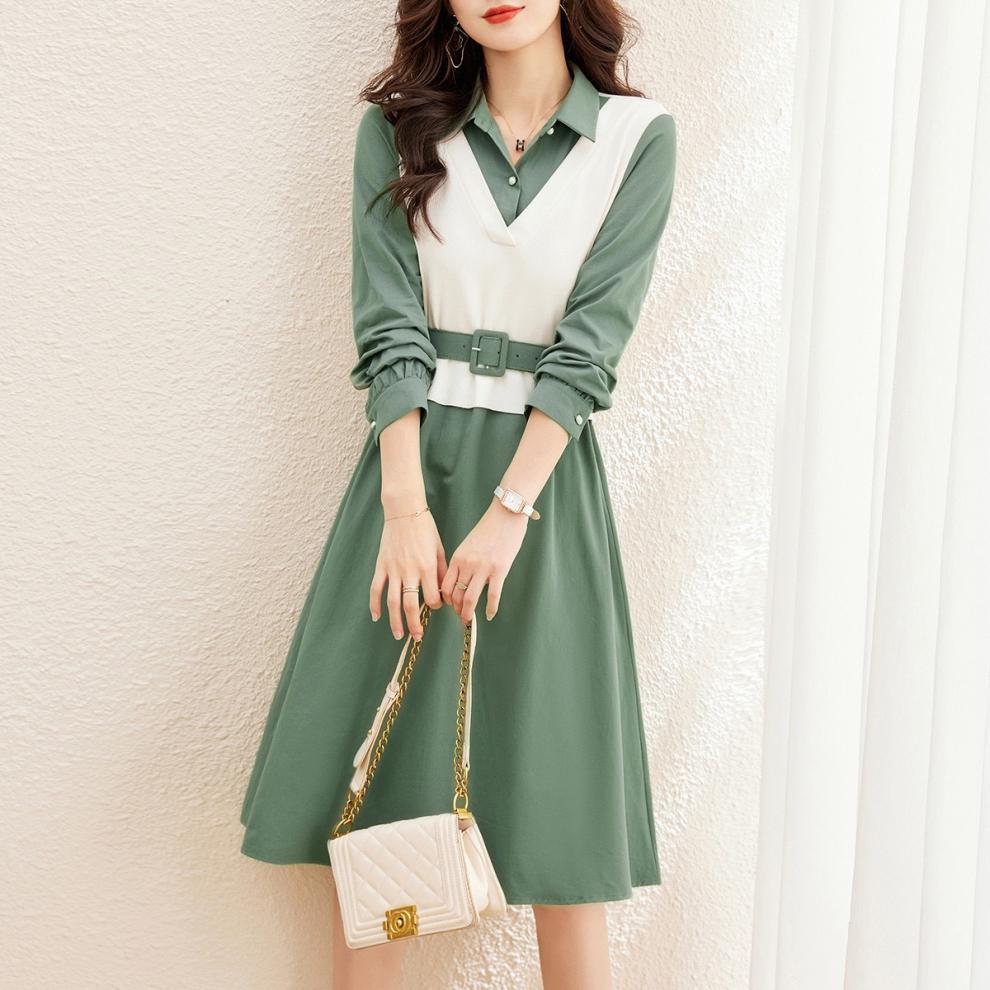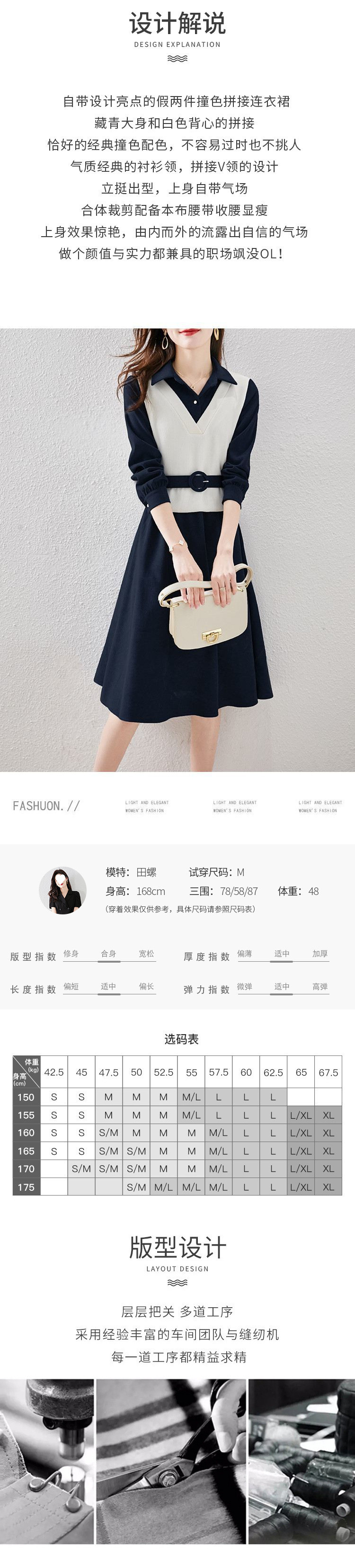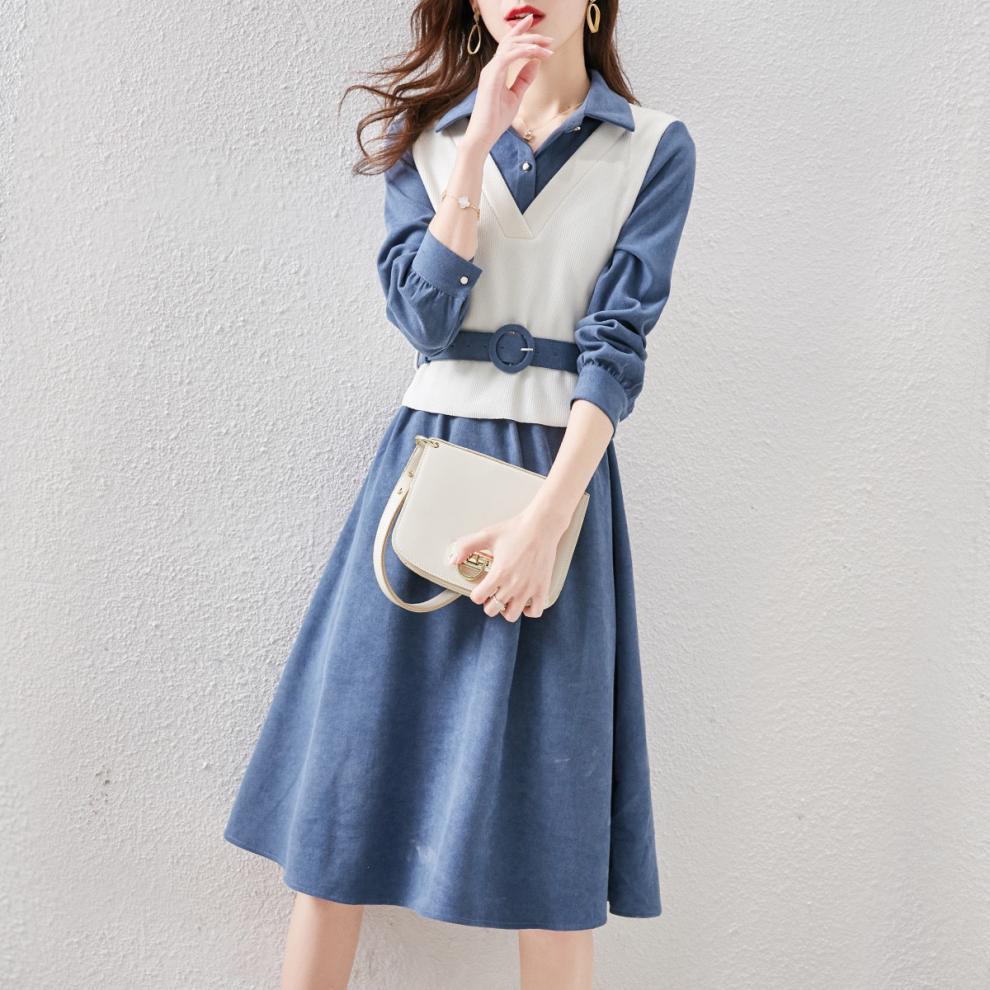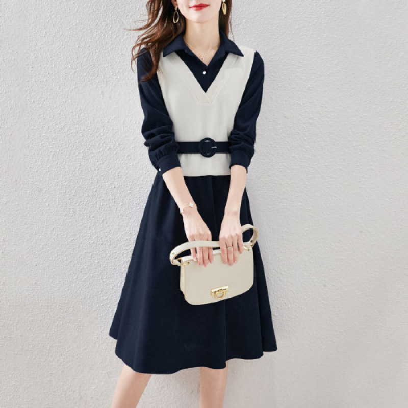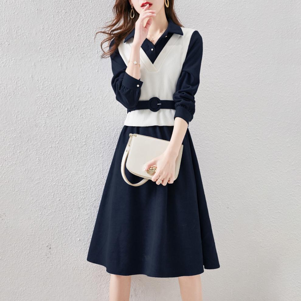 2022 년 겨울 새 올매치 POLO 칼라 페이크 원피스 여자 A 라인 스커트 허리 컬러 매칭 미드 길이 스커트 여자 스커트스토어 가기