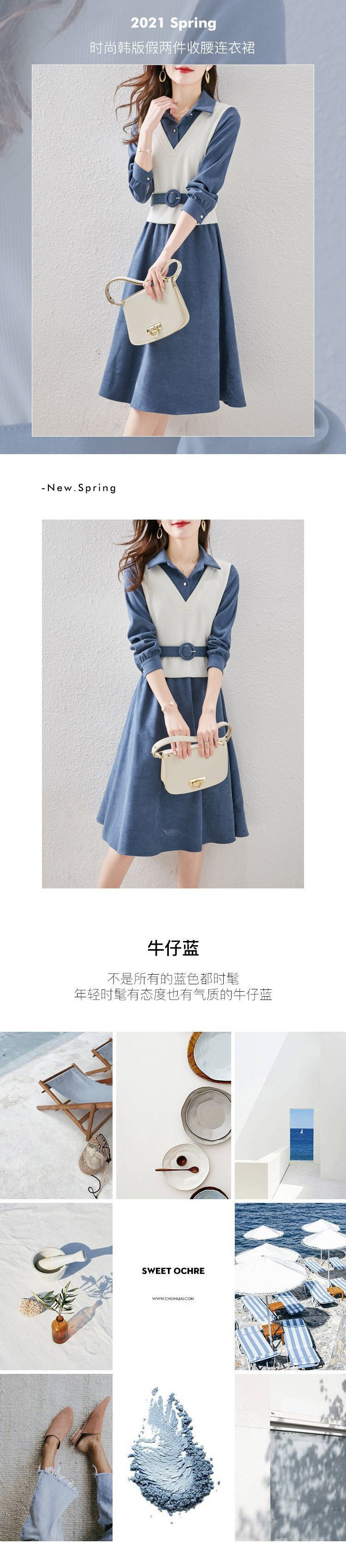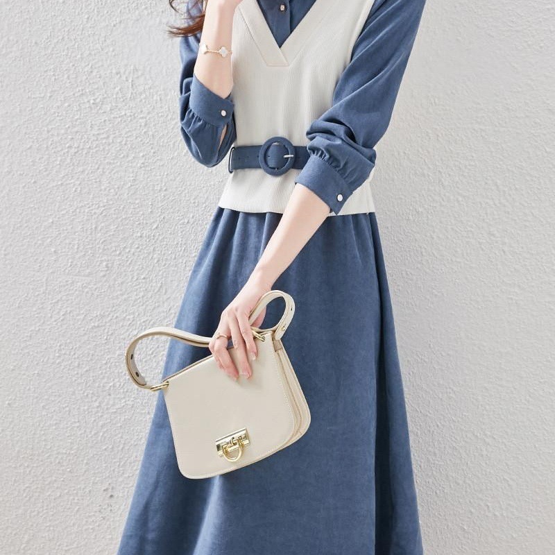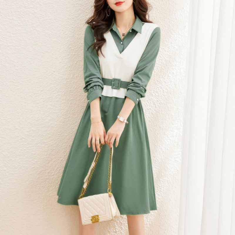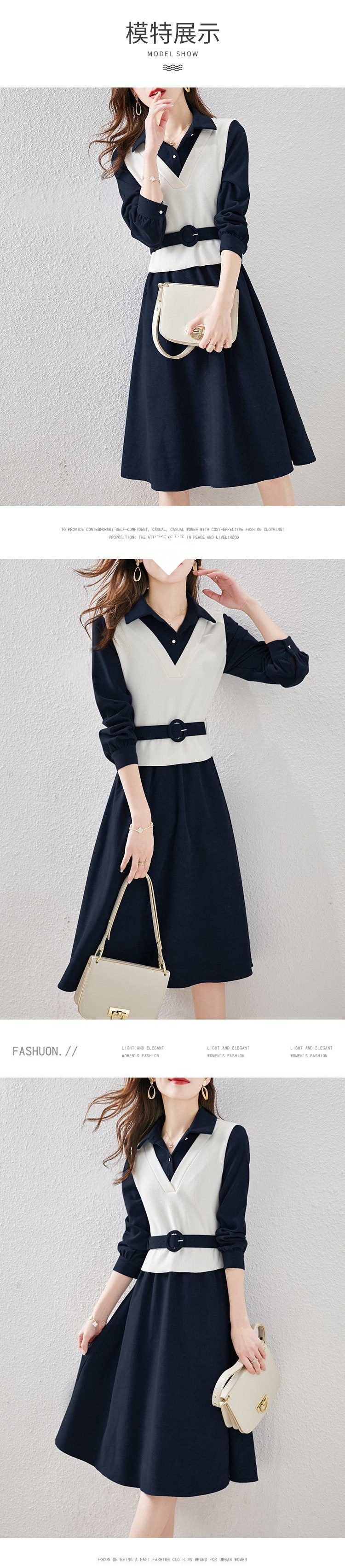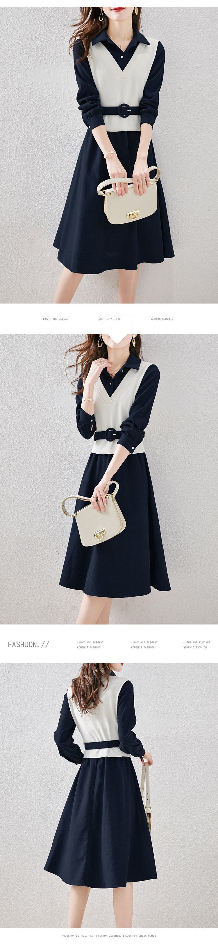 2022 년 겨울 새 올매치 POLO 칼라 페이크 원피스 여자 A 라인 스커트 허리 컬러 매칭 미드 길이 스커트 여자 스커트스토어 가기
