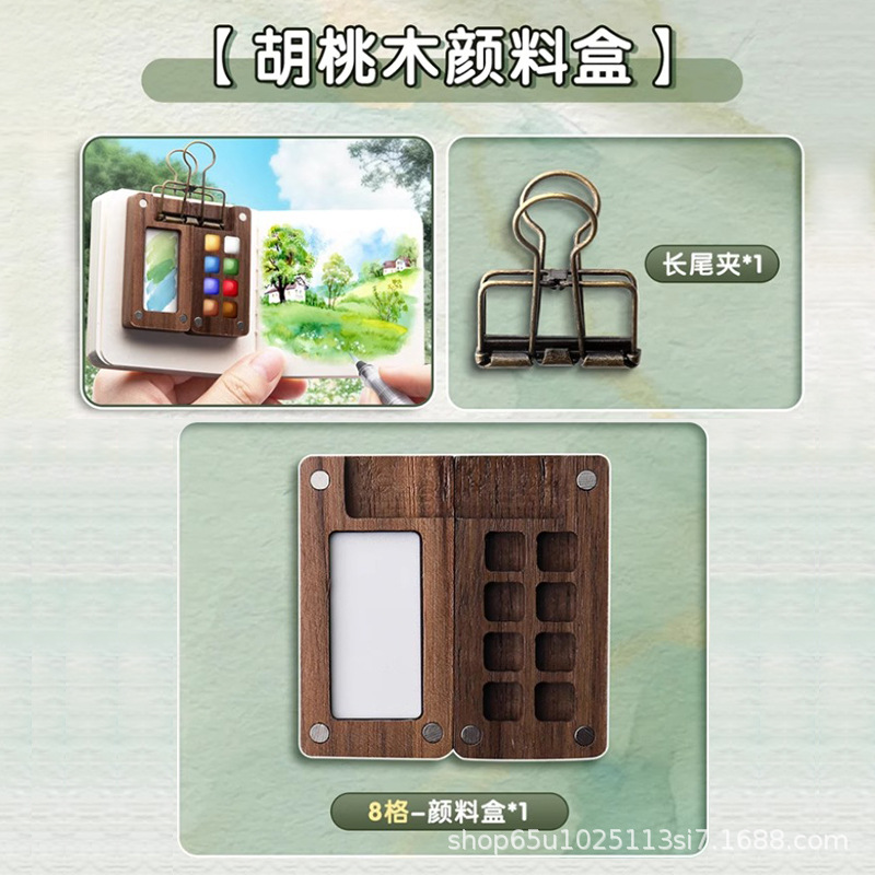 • [스케치 세트] 8칸 호두 페인트 상자 + 12색 수채화 + 그림책 + 물펜 + 클립