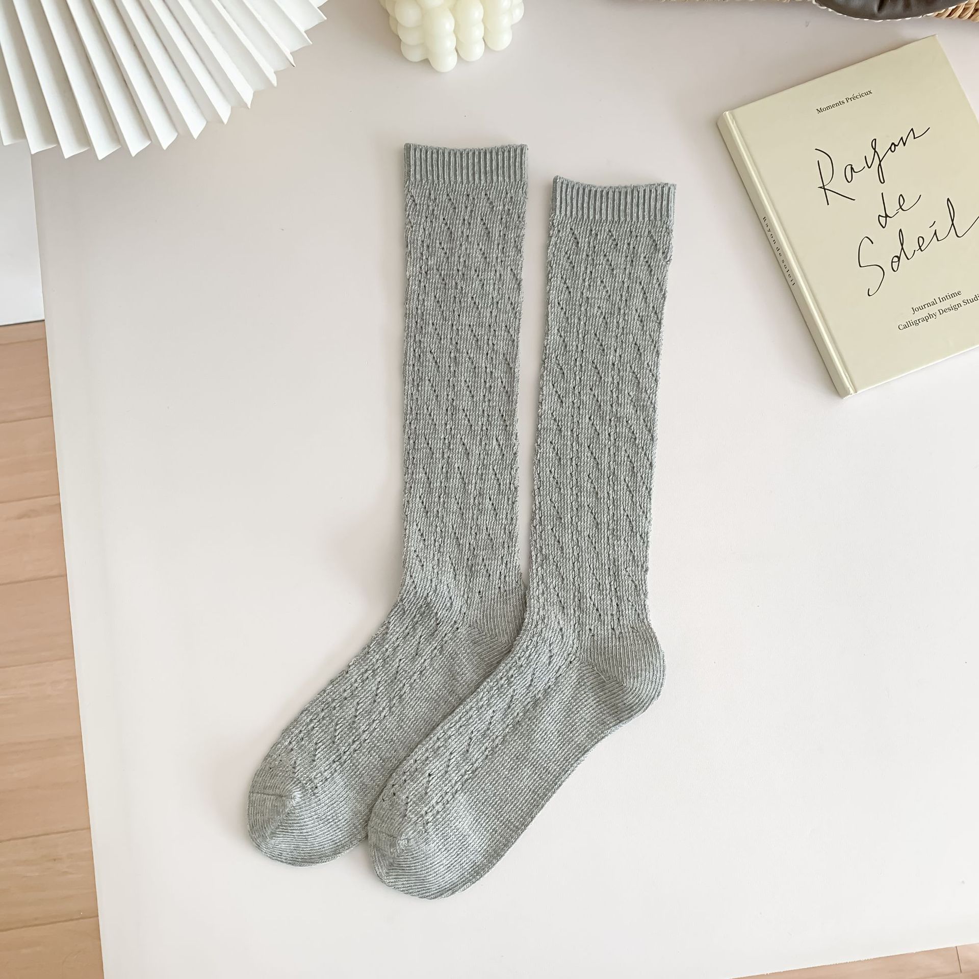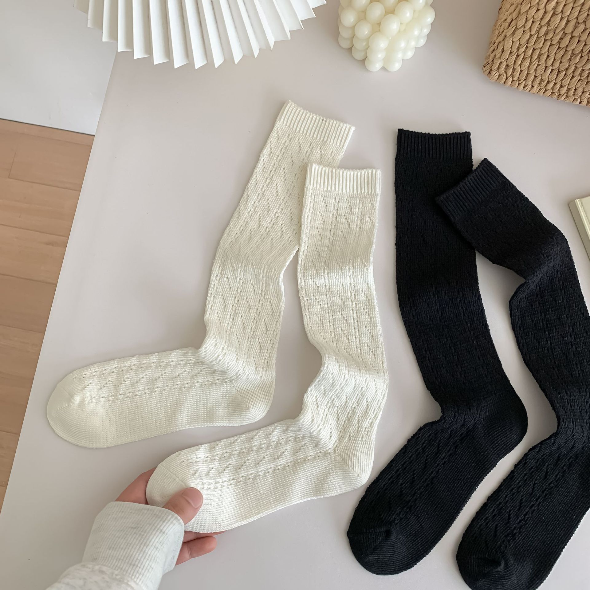 단색 중공 통기성 메쉬 양말 여성용 얇은 흰색 송아지 양말 무릎 길이 흑백 일본 JK 스태킹 양말