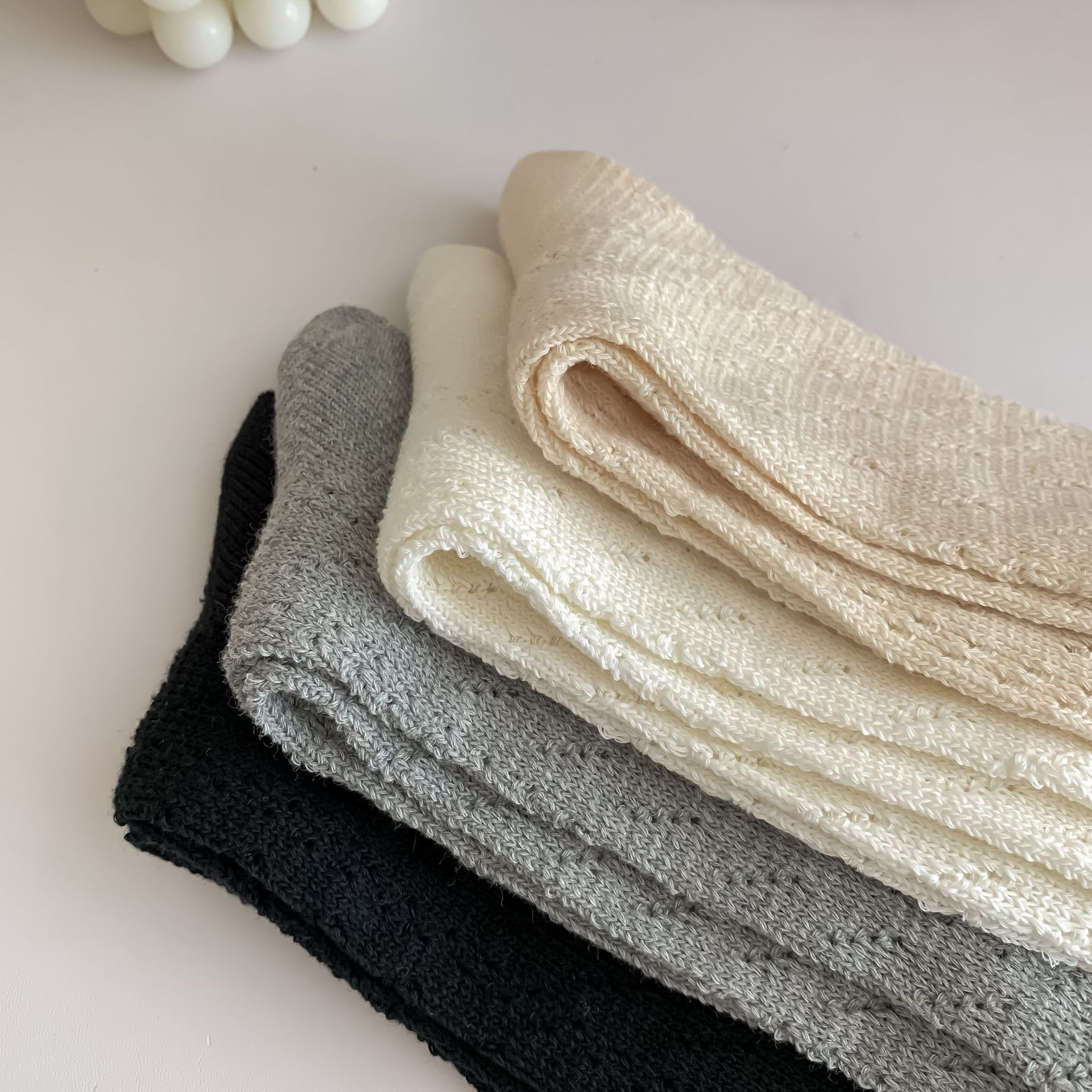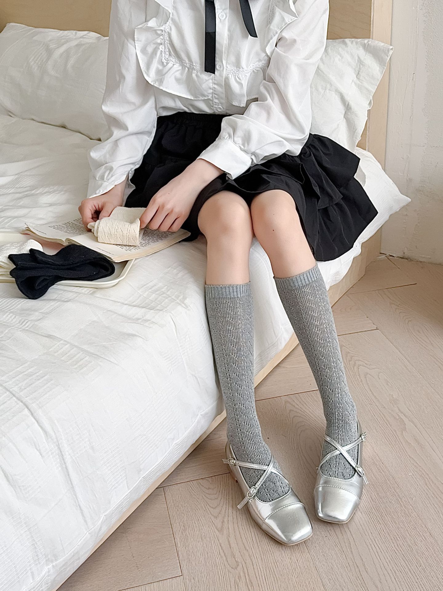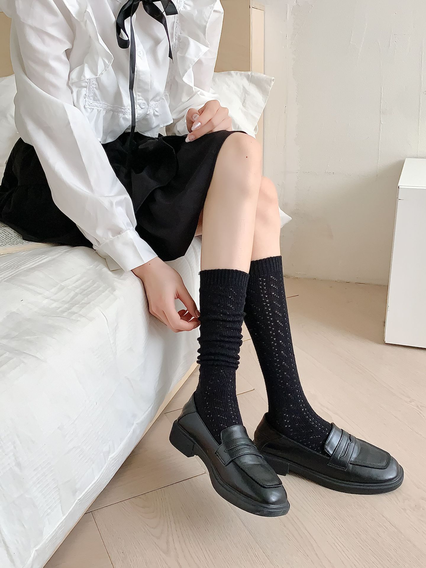 단색 중공 통기성 메쉬 양말 여성용 얇은 흰색 송아지 양말 무릎 길이 흑백 일본 JK 스태킹 양말스토어 가기
