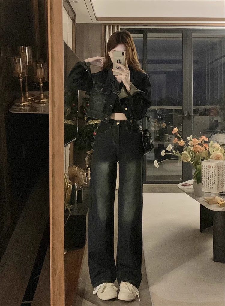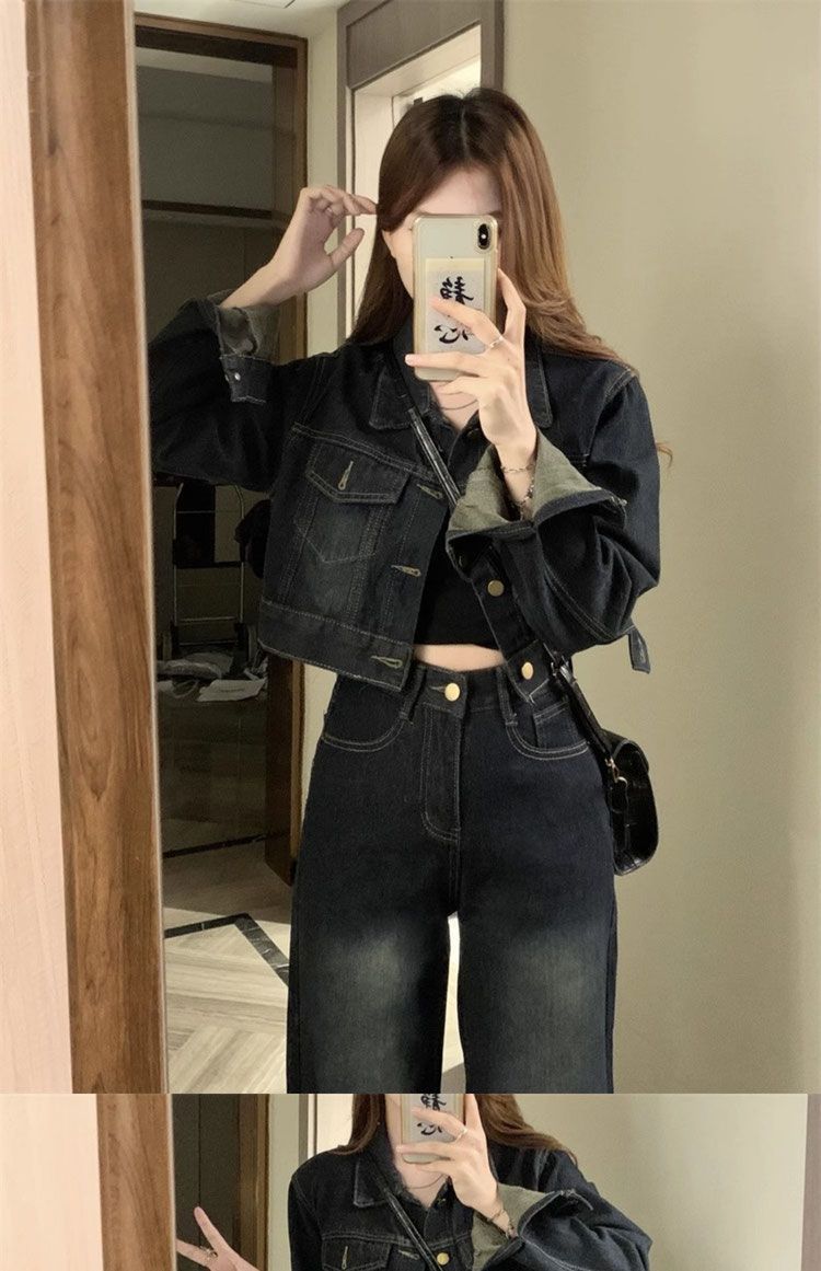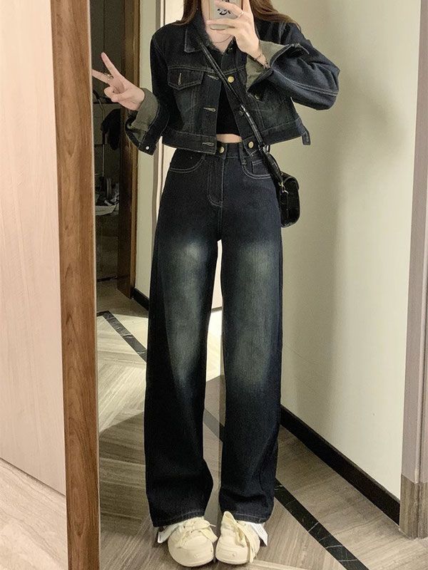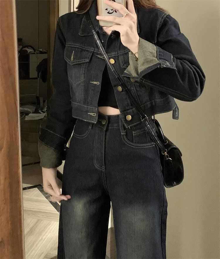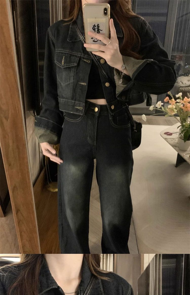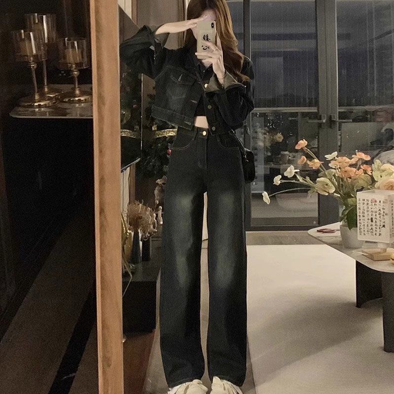 플러스 사이즈 여성 미국 빈티지 데님 세트 가을 2024 새로운 짧은 재킷 와이드 다리 바지 투피스 세트스토어 가기