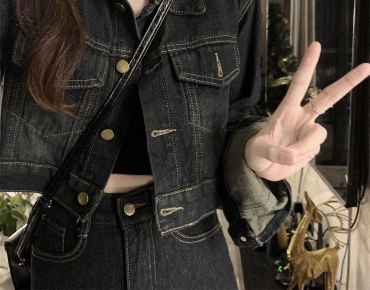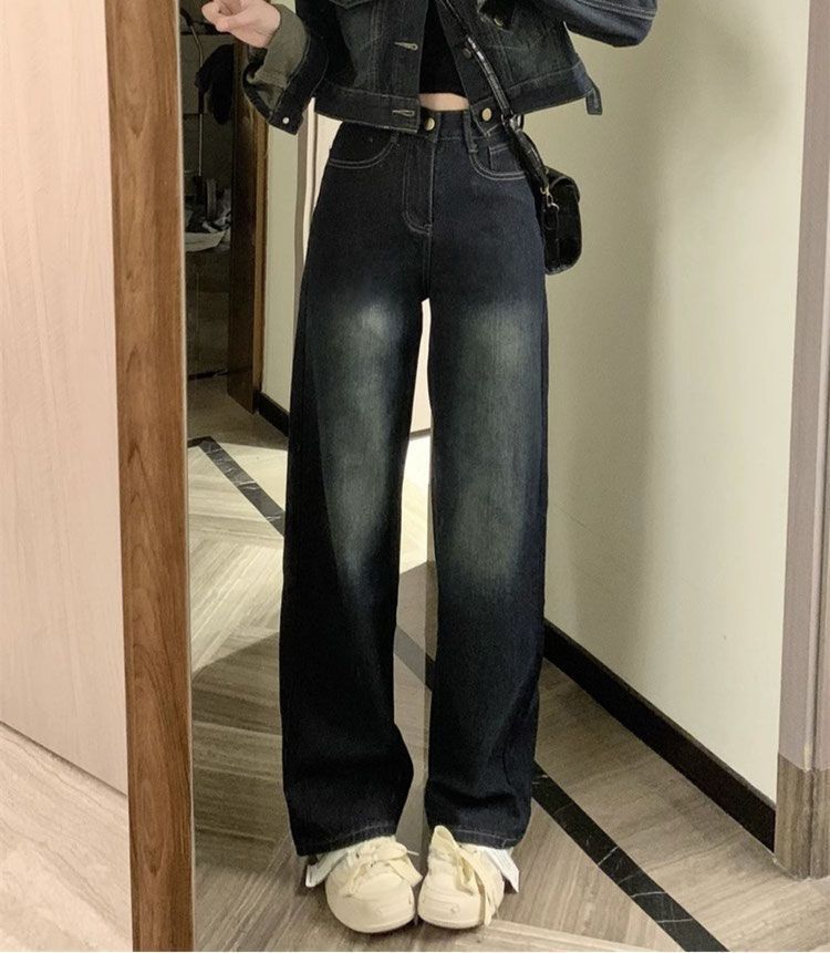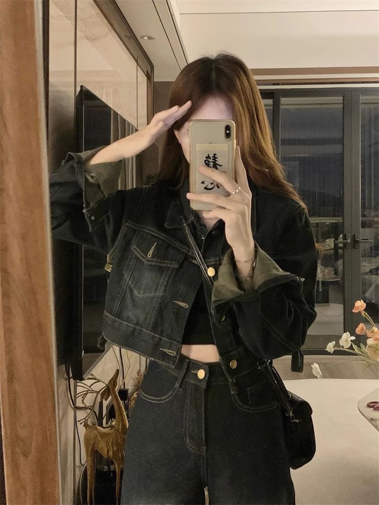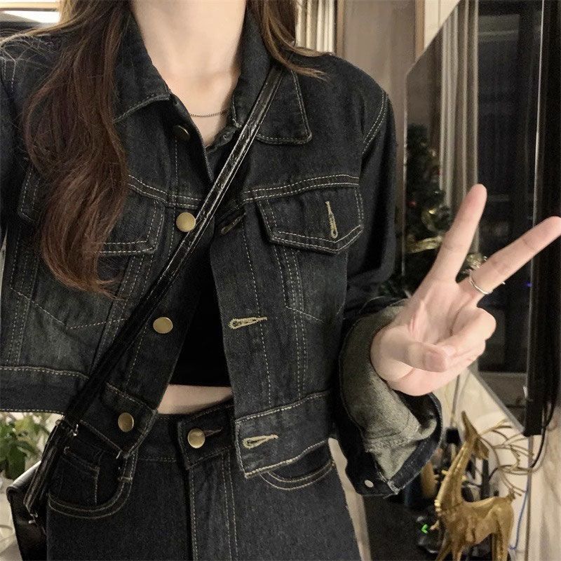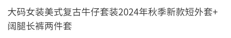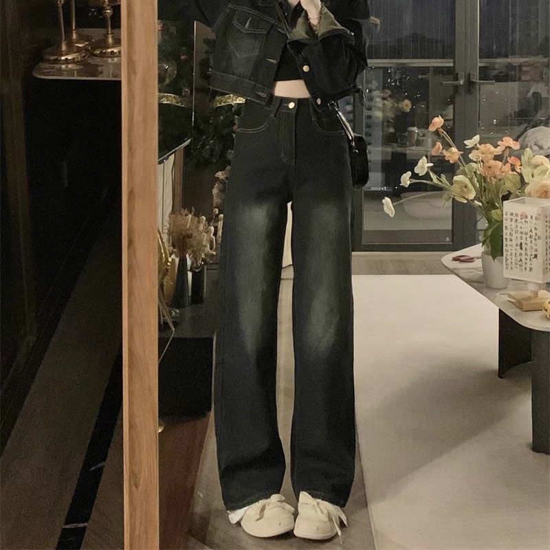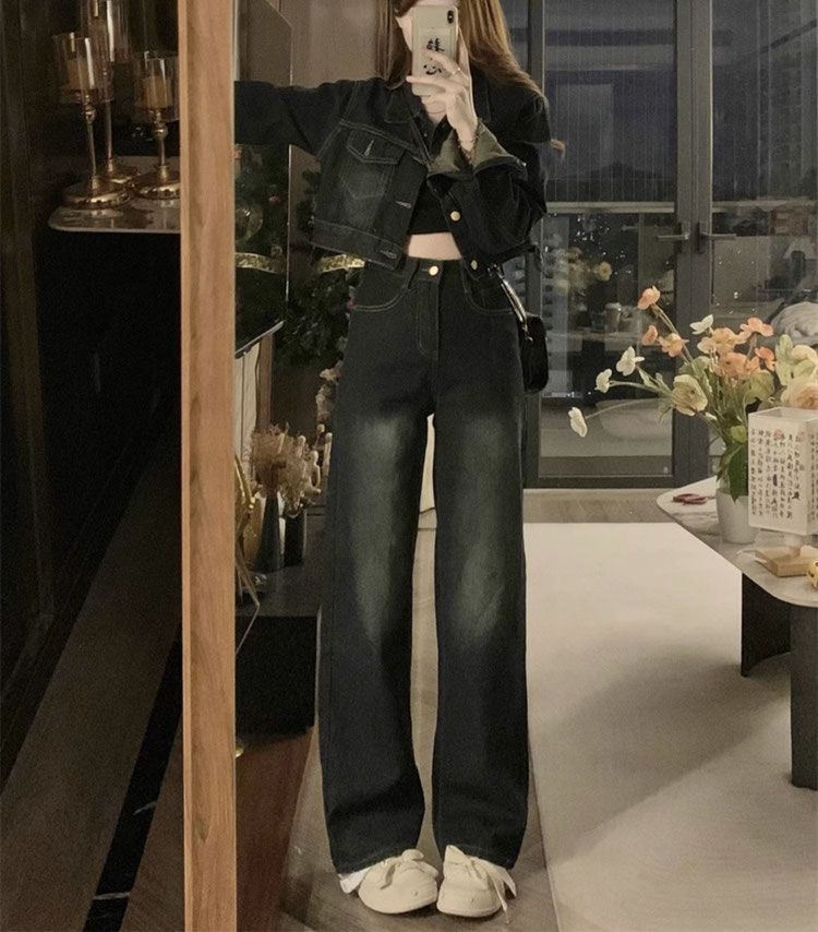 플러스 사이즈 여성 미국 빈티지 데님 세트 가을 2024 새로운 짧은 재킷 와이드 다리 바지 투피스 세트스토어 가기