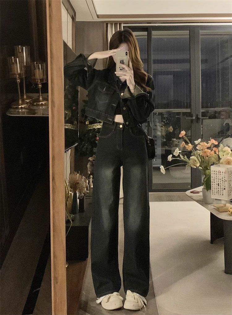 플러스 사이즈 여성 미국 빈티지 데님 세트 가을 2024 새로운 짧은 재킷 와이드 다리 바지 투피스 세트
