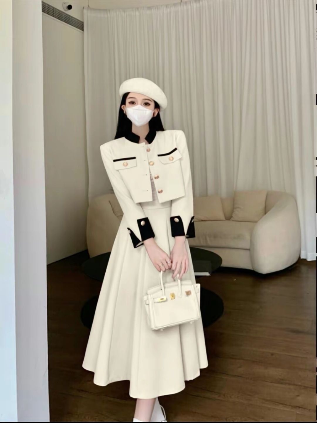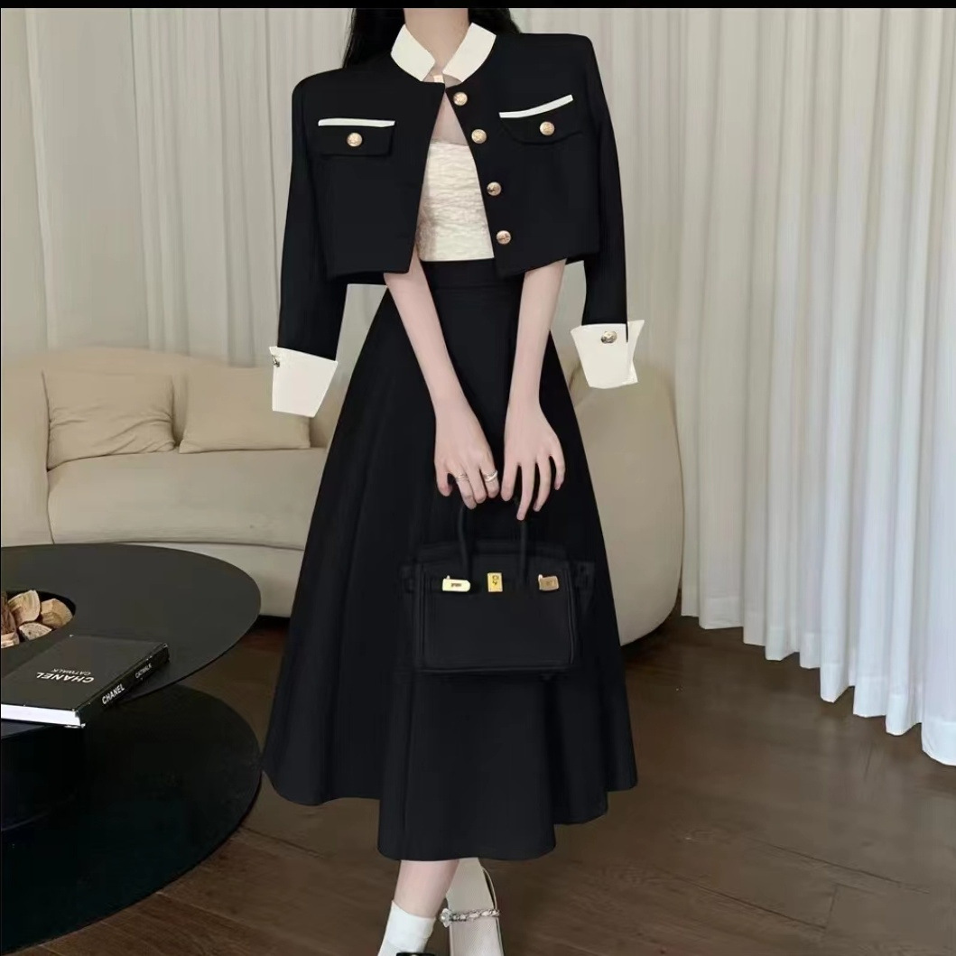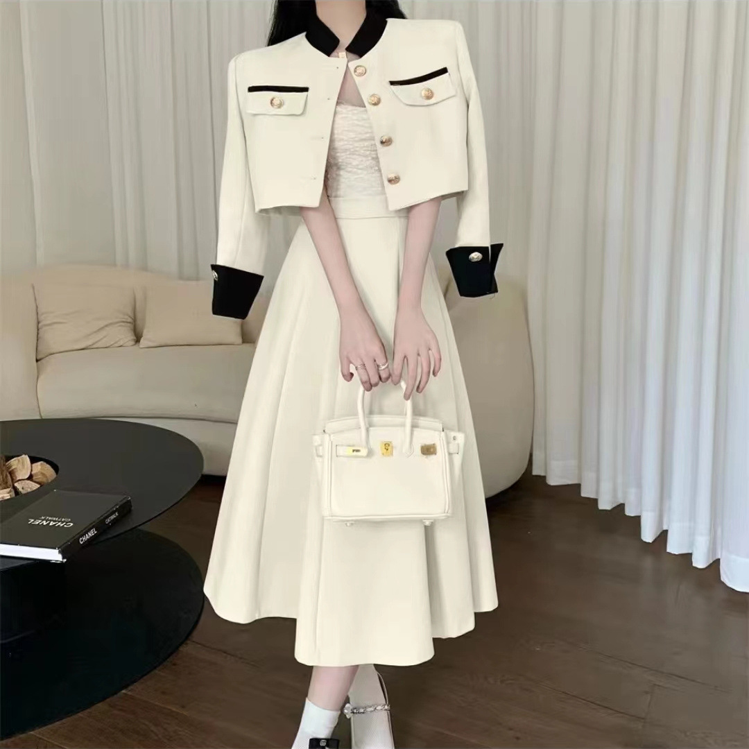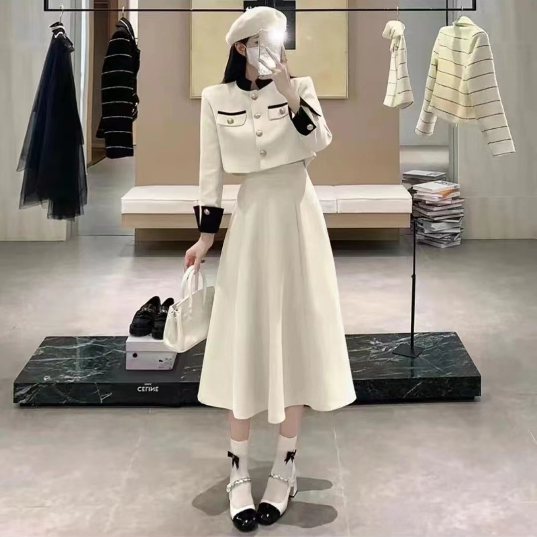 2025 새로운 봄과 가을 명암 칼라 짧은 외부 착용 작은 샤넬 스타일 세트 원피스 투피스 우아한 성숙한 왕실 자매