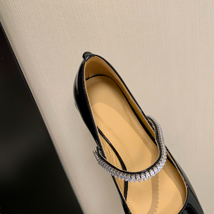 스퀘어 헤드 라인스톤 두꺼운 힐 메리 제인 신발 여성용 얕은 입 싱글 레이어 신발 미드 힐 로우 탑 풀 가죽 신발 여성용 신발