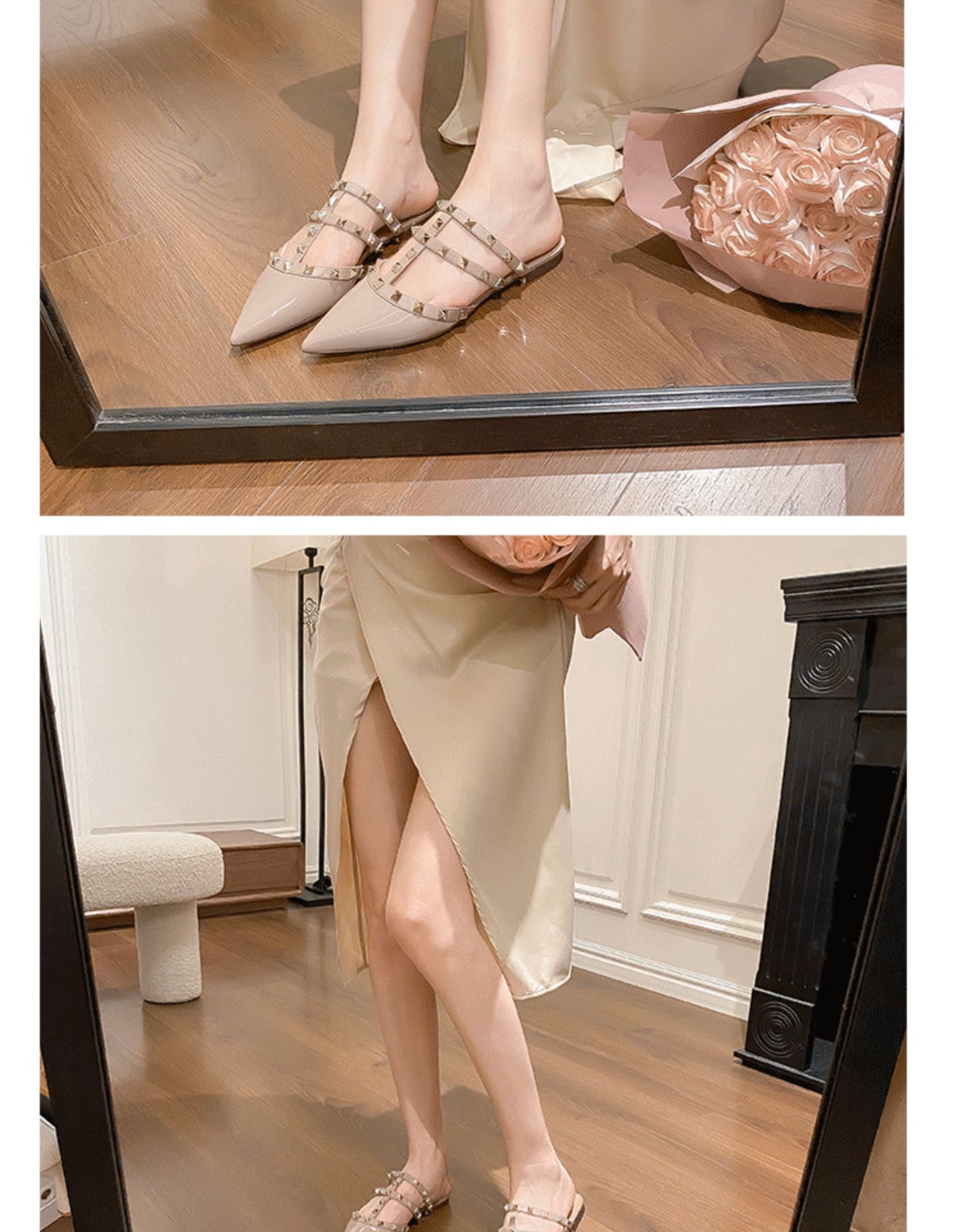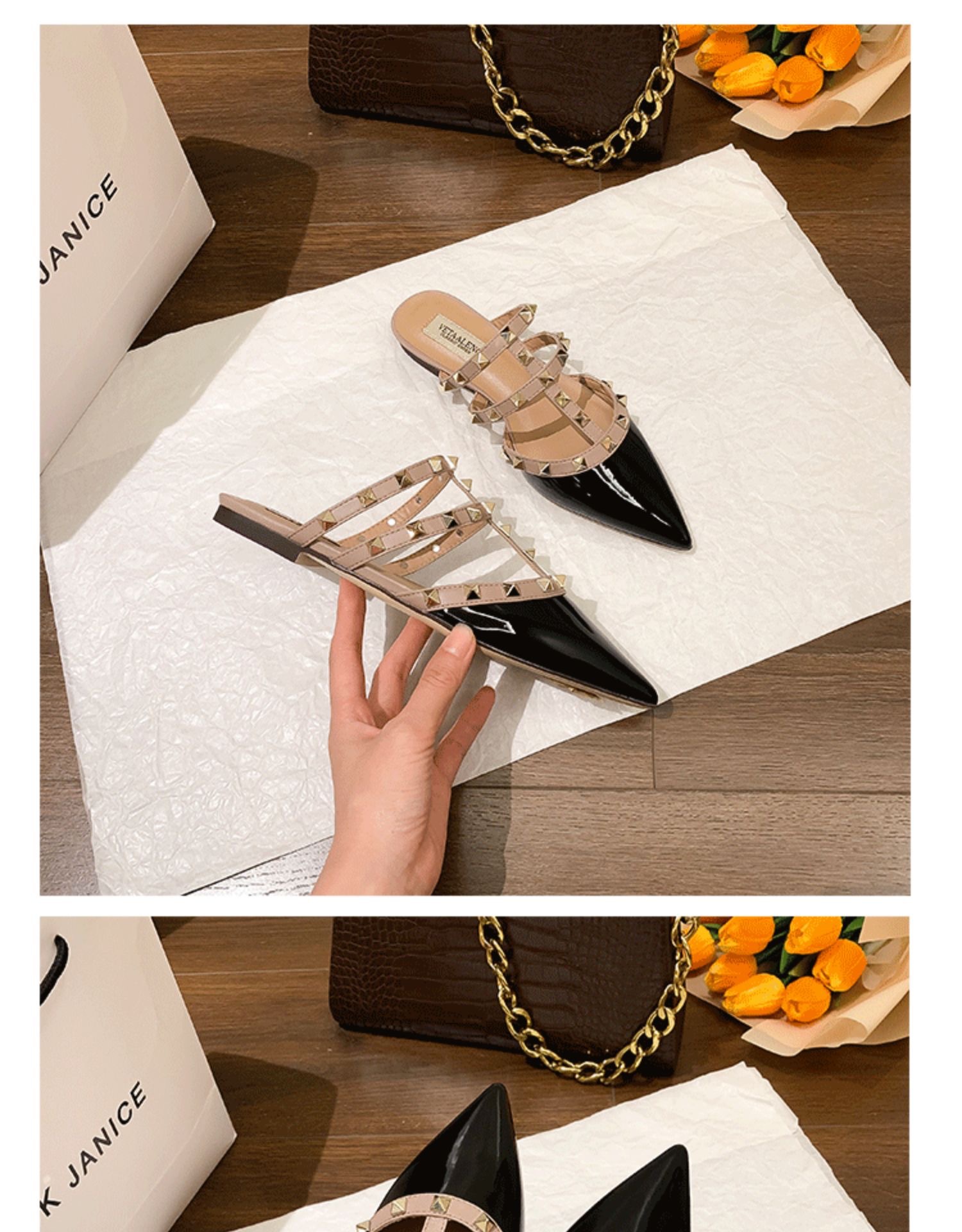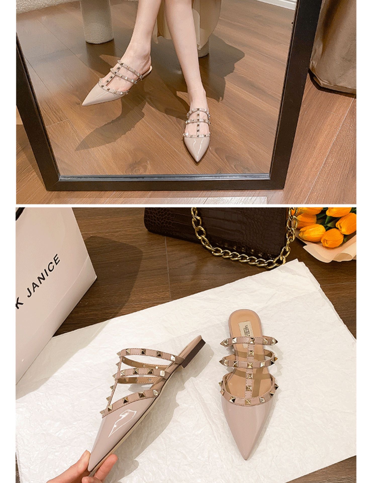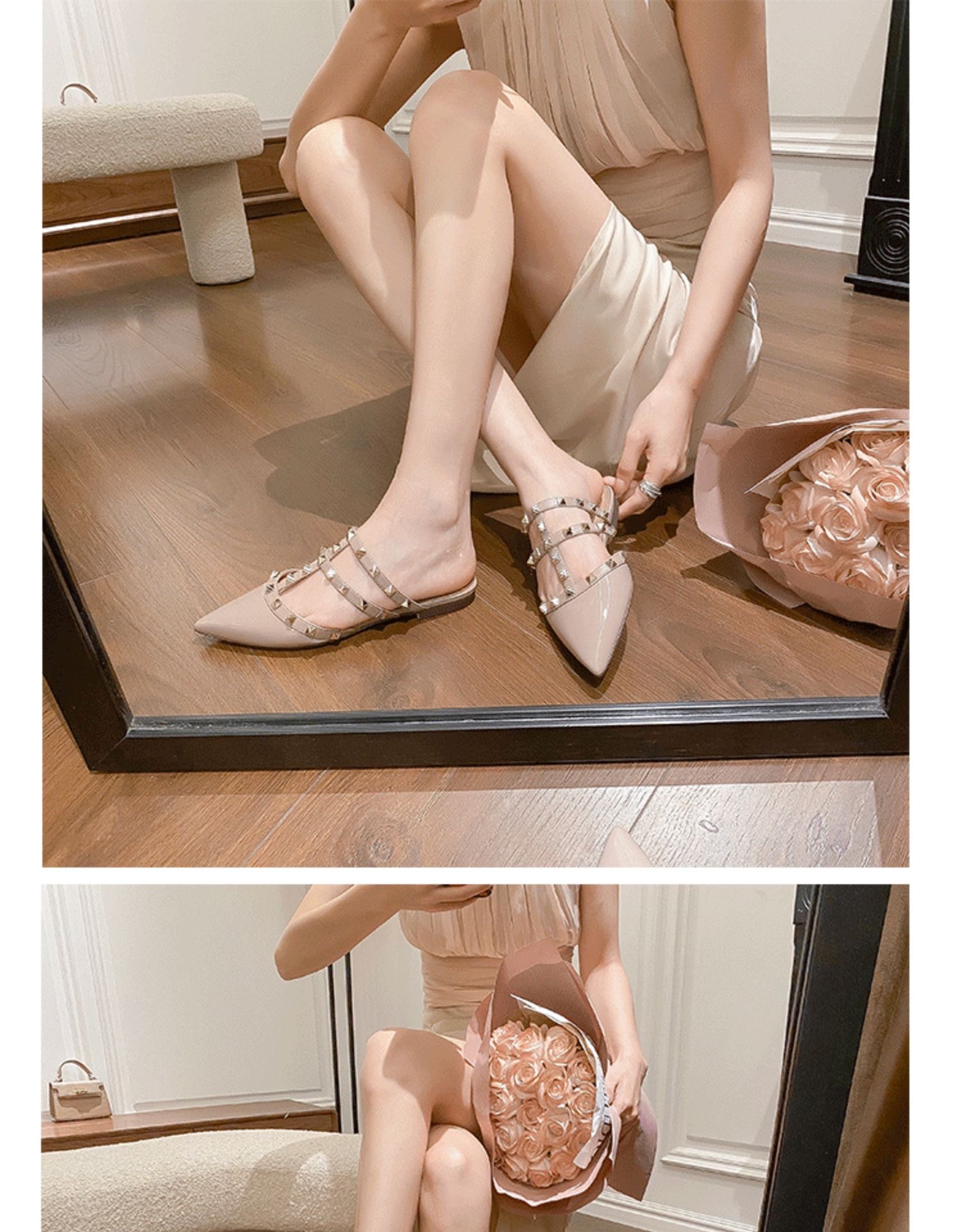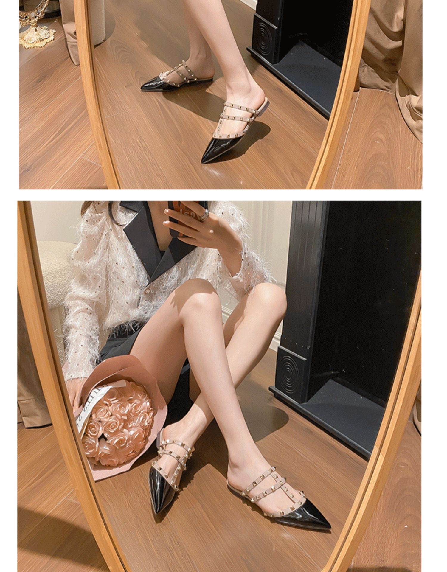 2025 년 이른 봄 새로운 리벳 평평한 바닥 반 슬리퍼 여성 외부 특허 가죽 낮은 발 뒤꿈치 뾰족한 노새 신발