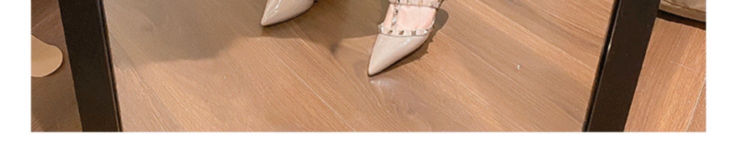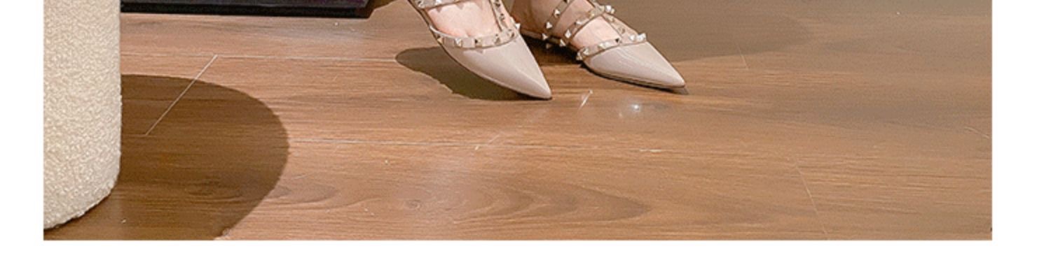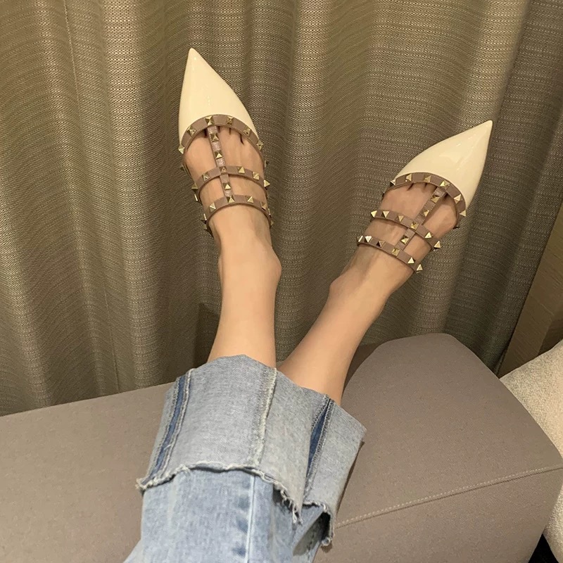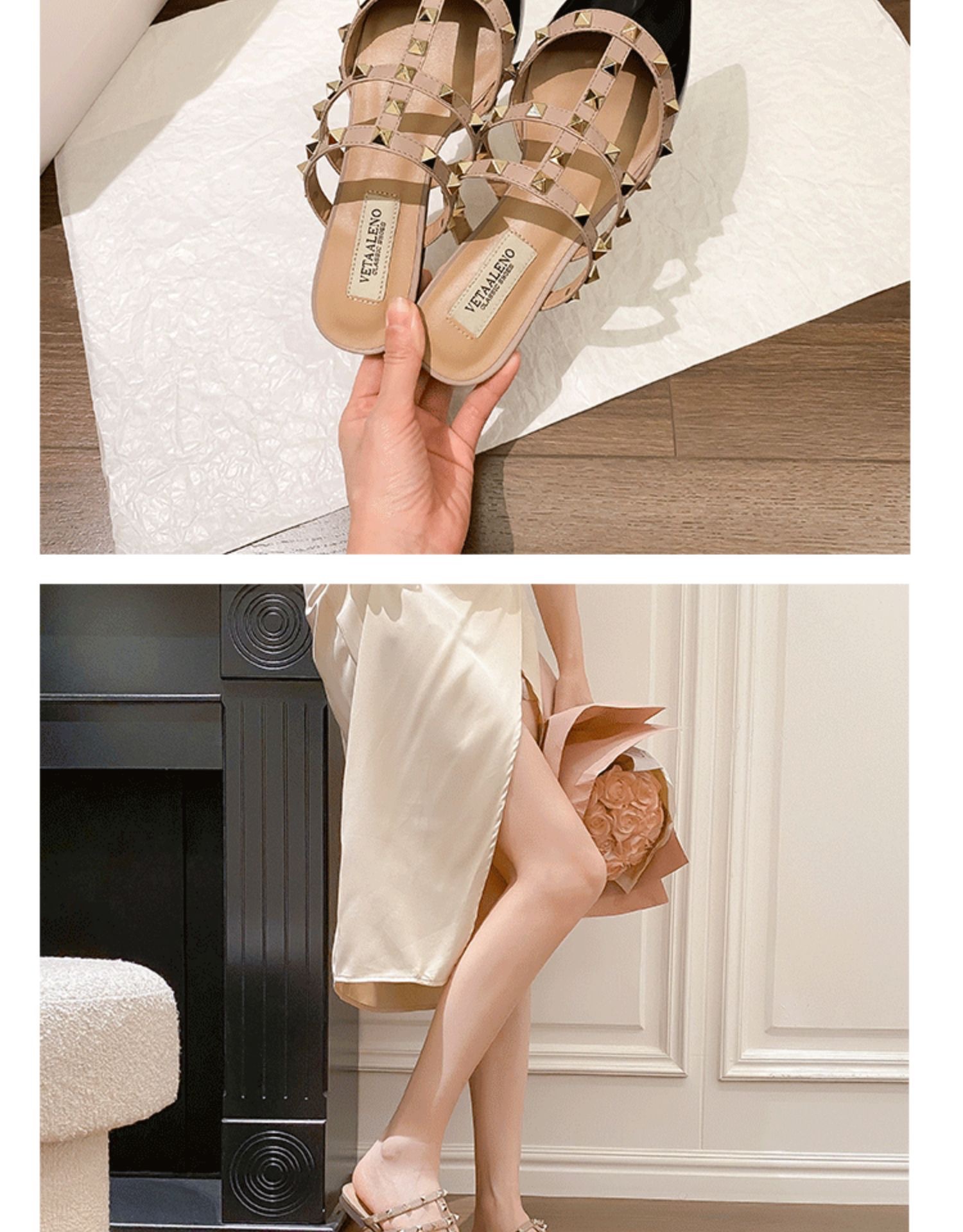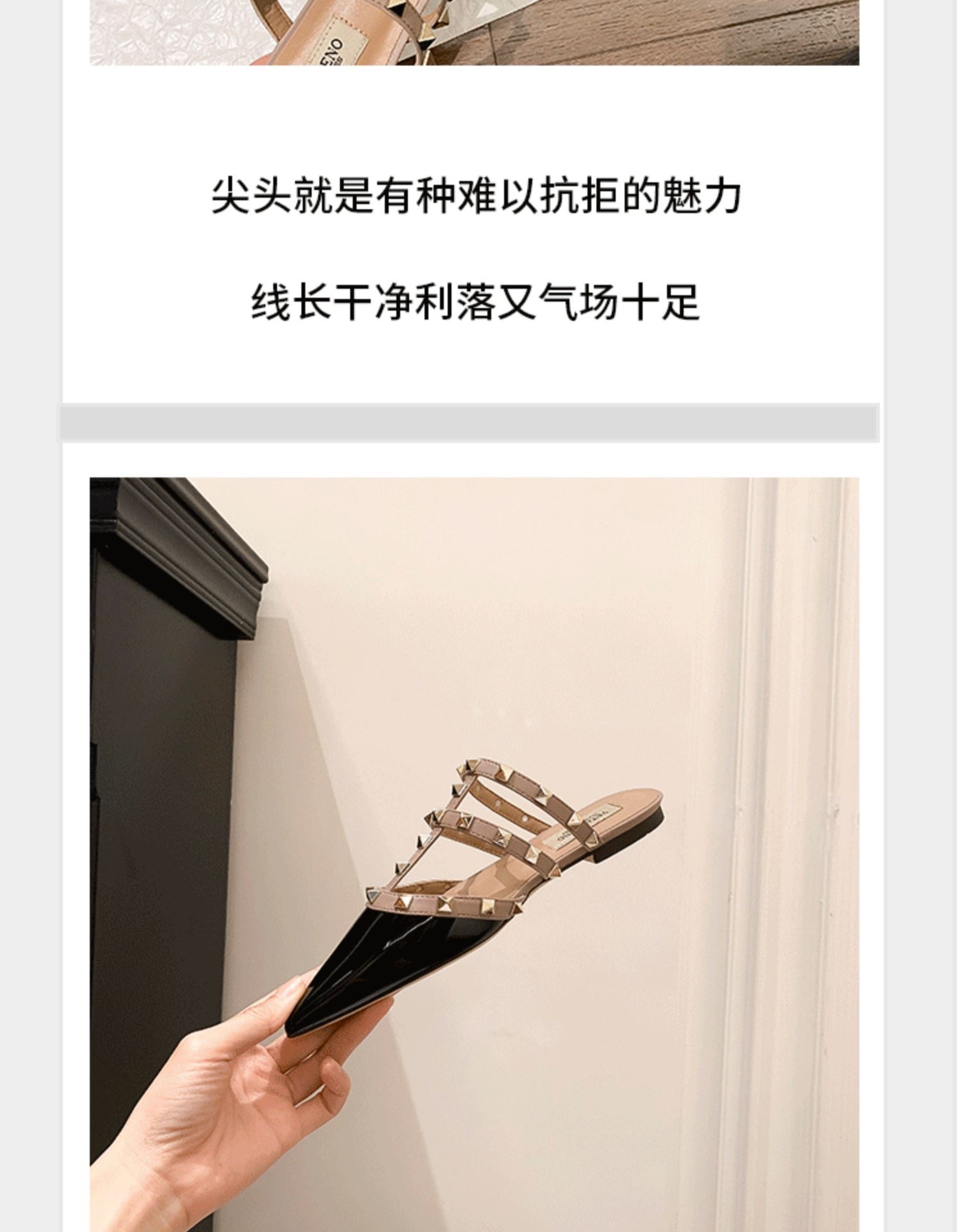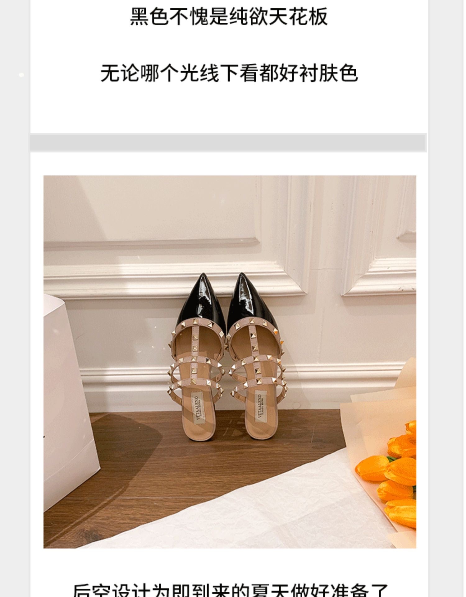 2025 년 이른 봄 새로운 리벳 평평한 바닥 반 슬리퍼 여성 외부 특허 가죽 낮은 발 뒤꿈치 뾰족한 노새 신발