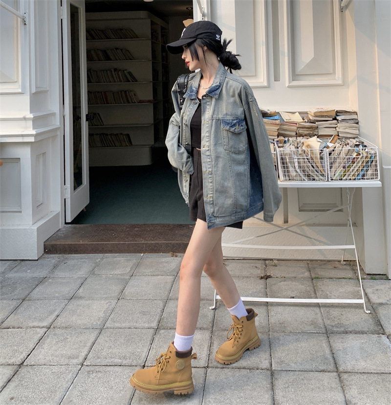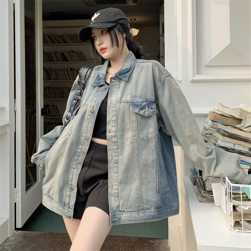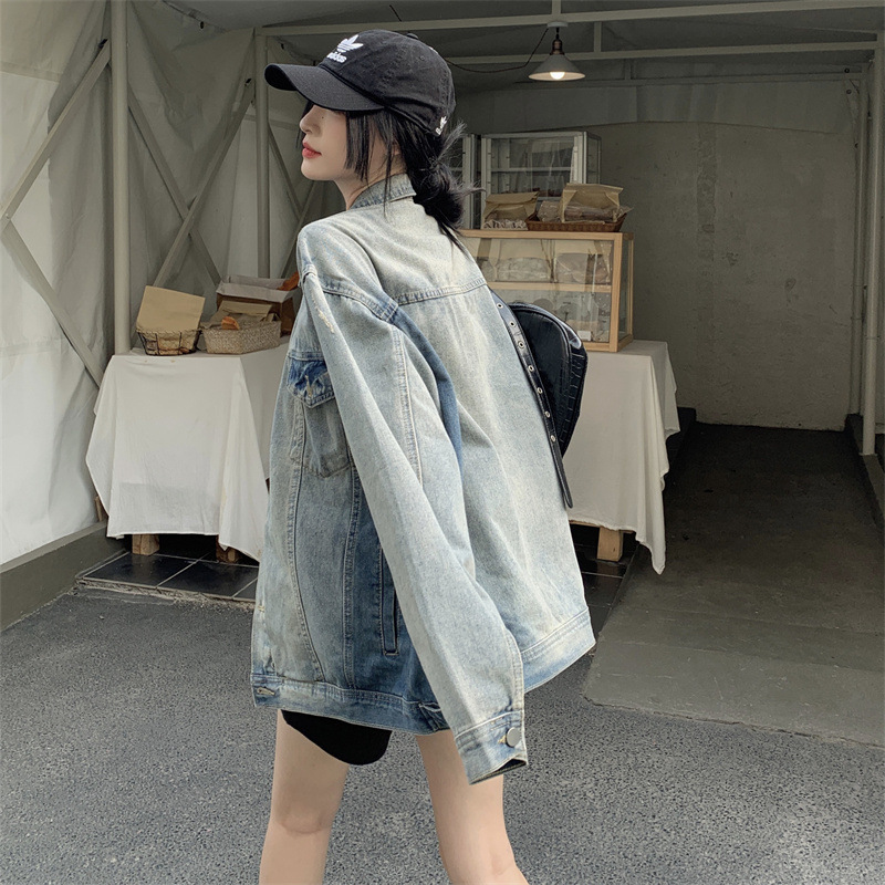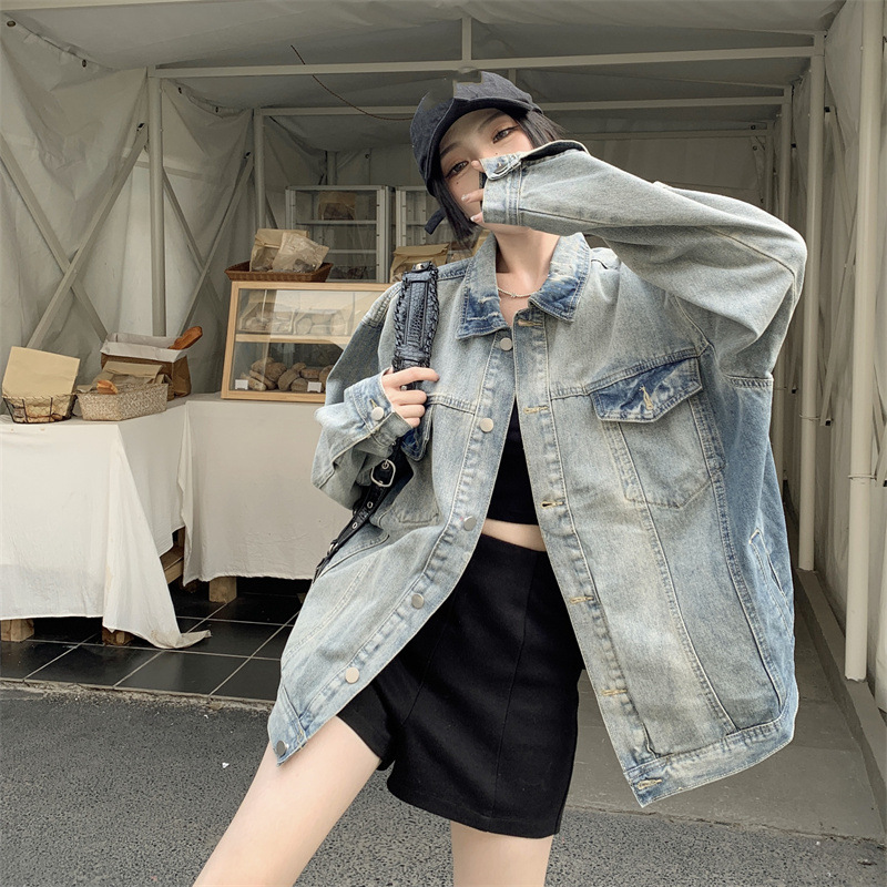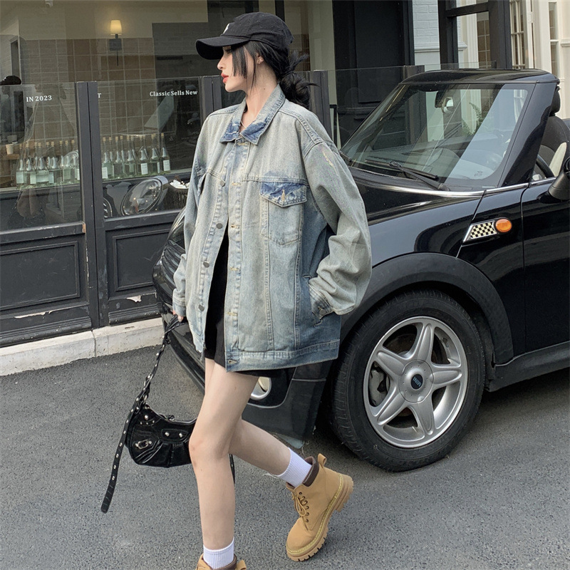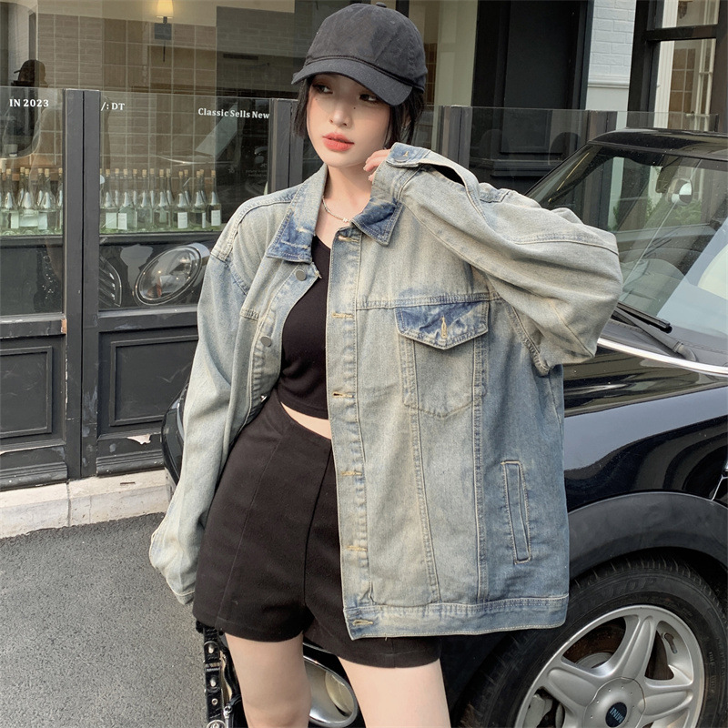 빈티지 모래 세척 돌 공장 중공업 세척 느슨한 프로필 데님 재킷스토어 가기