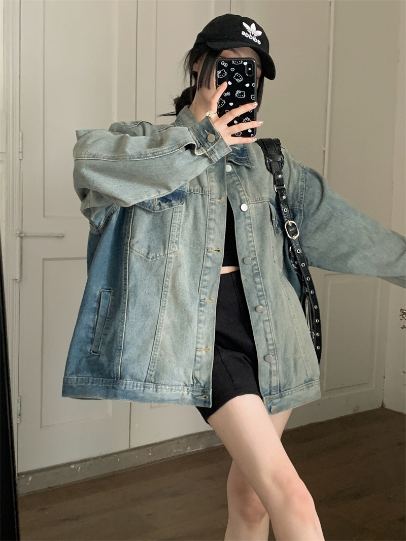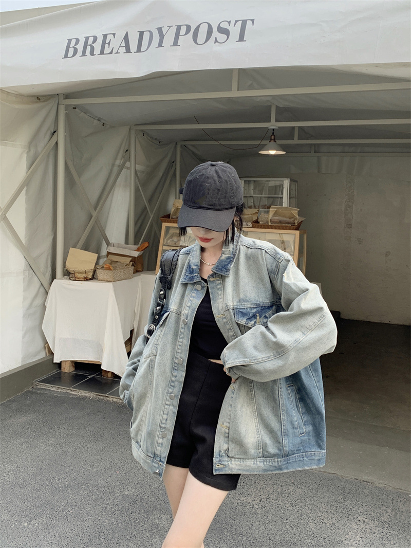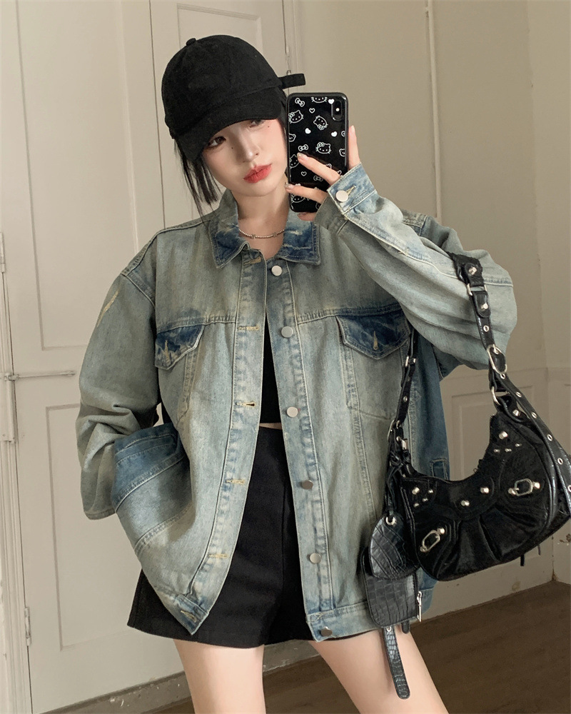 빈티지 모래 세척 돌 공장 중공업 세척 느슨한 프로필 데님 재킷