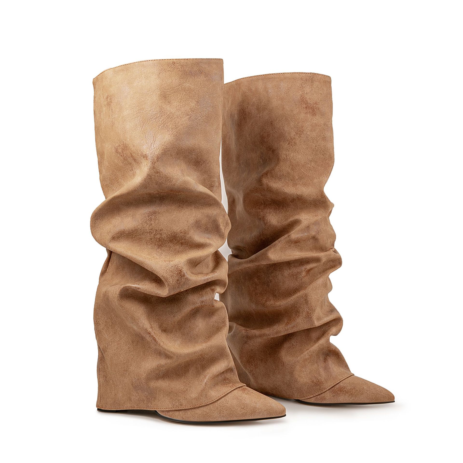 유럽풍 레트로 스타일의 극세사 스택부츠~뾰족코 스플라이싱 러플 디테일의 롤업 슬리브 주름 장식 초하이힐 니하이부츠 여성용 스틸레토힐