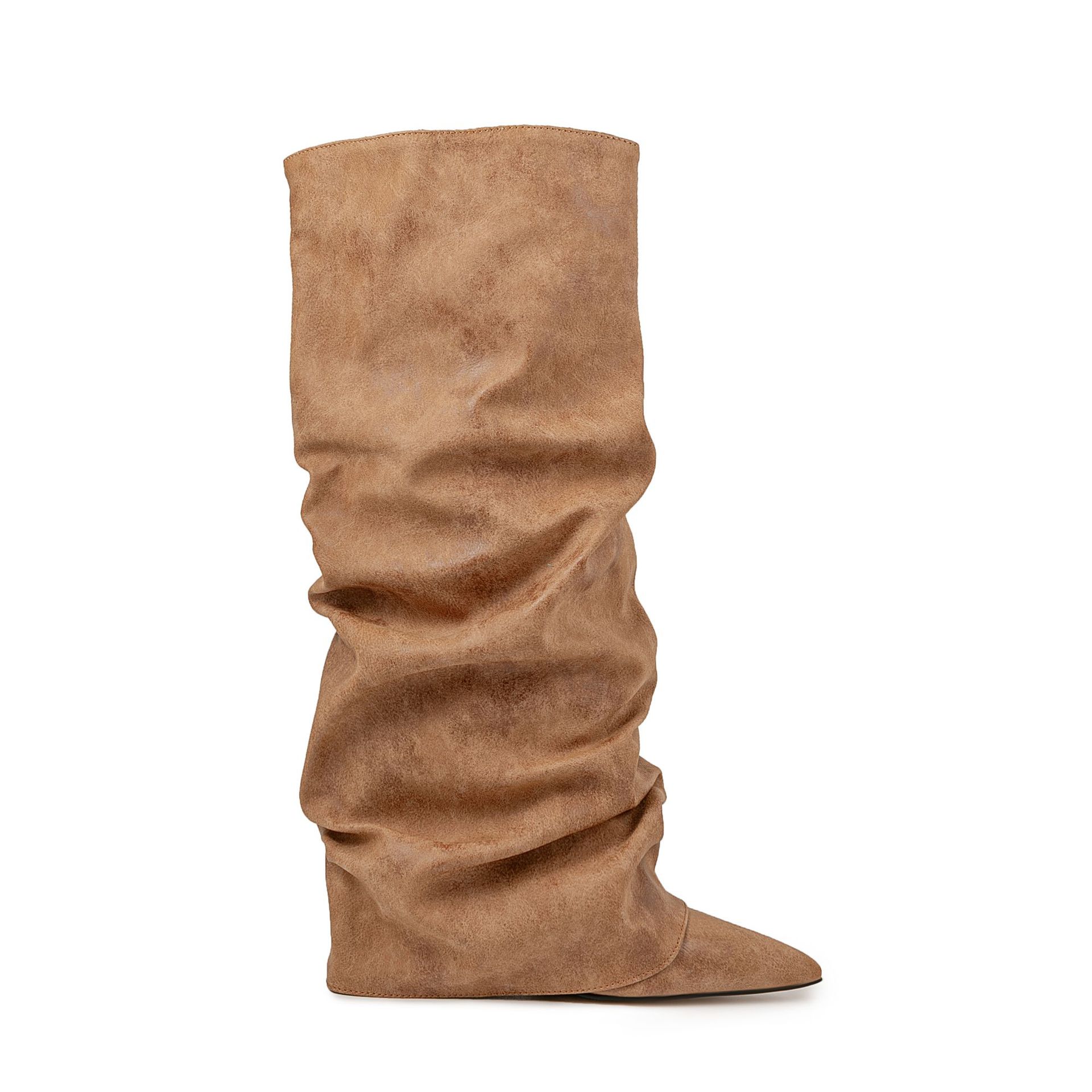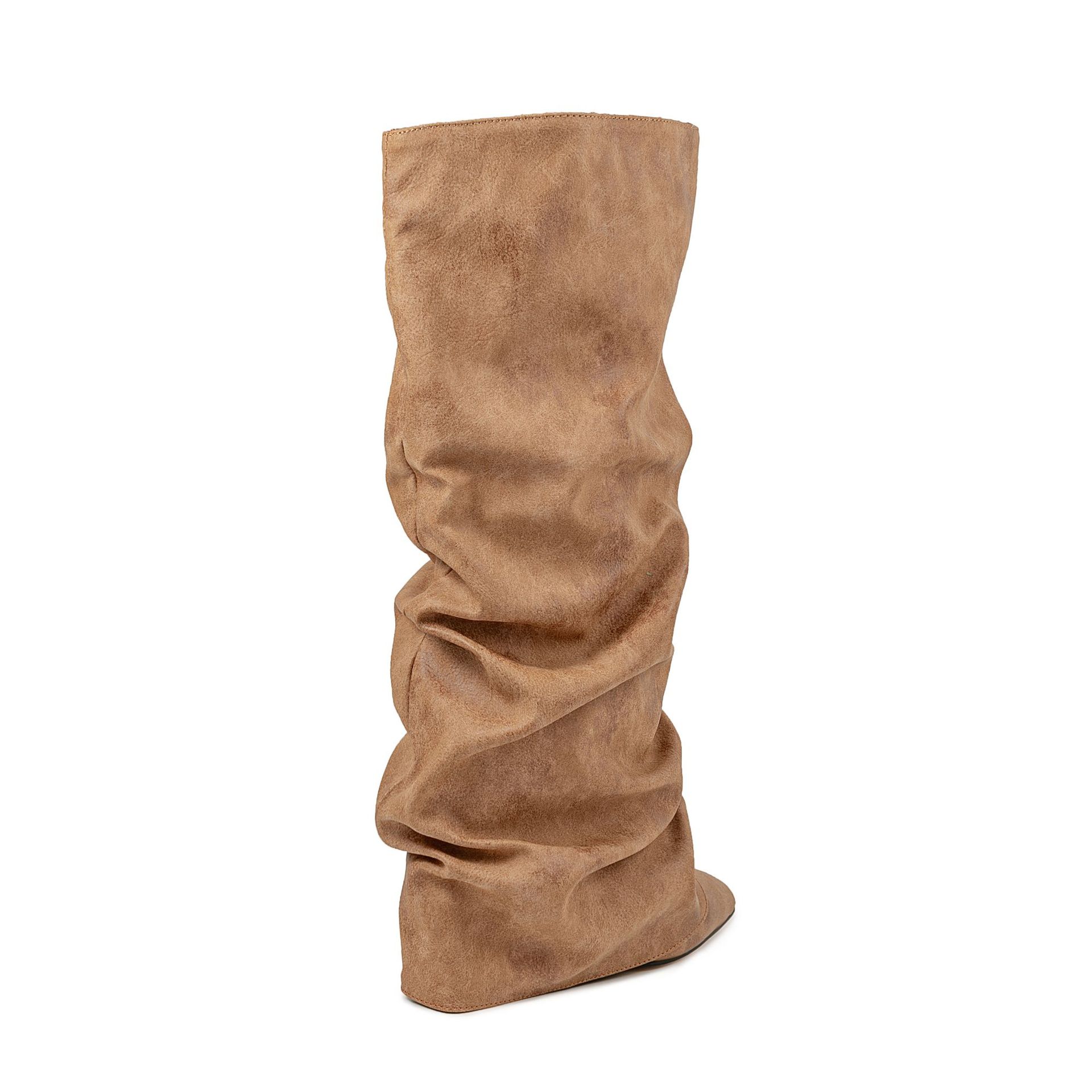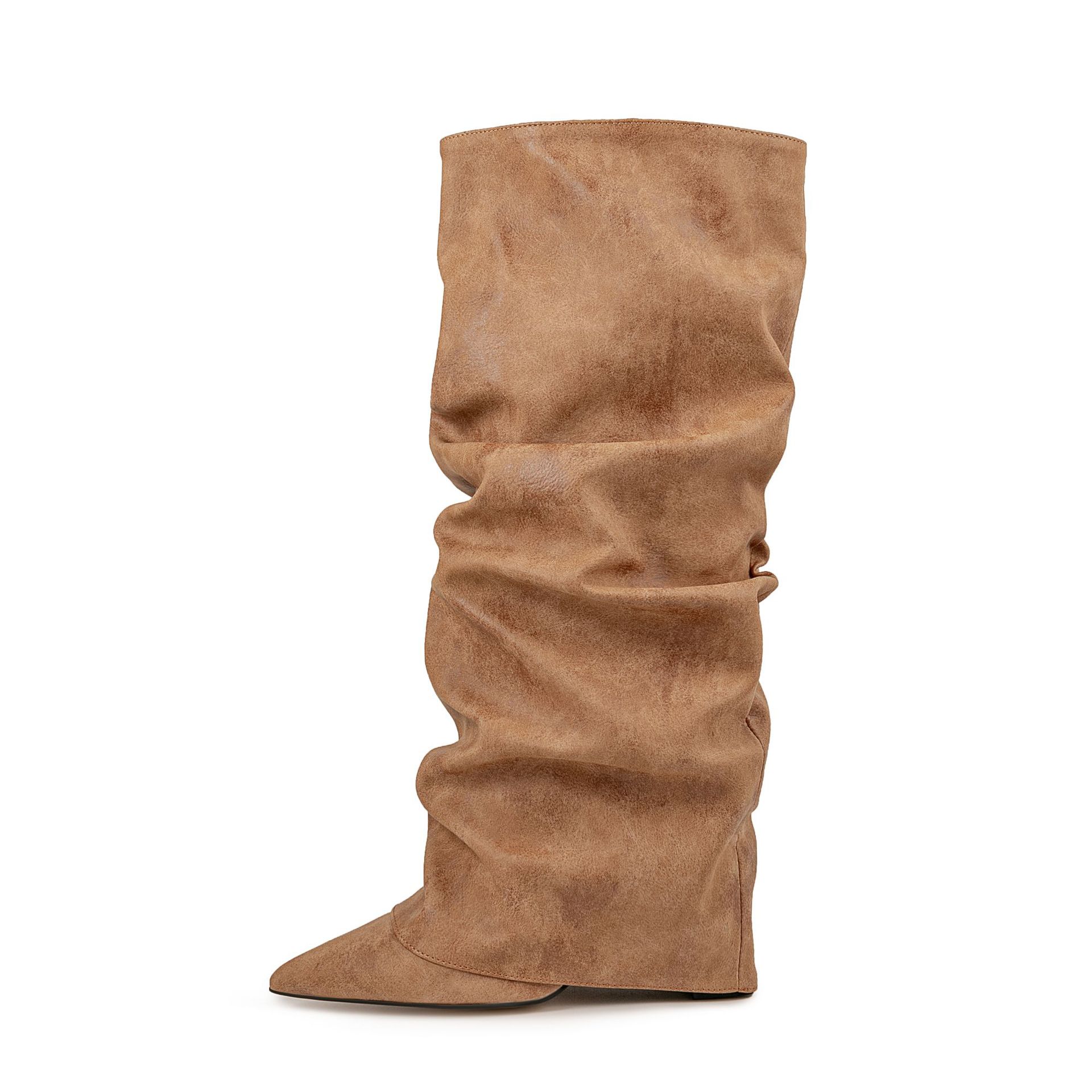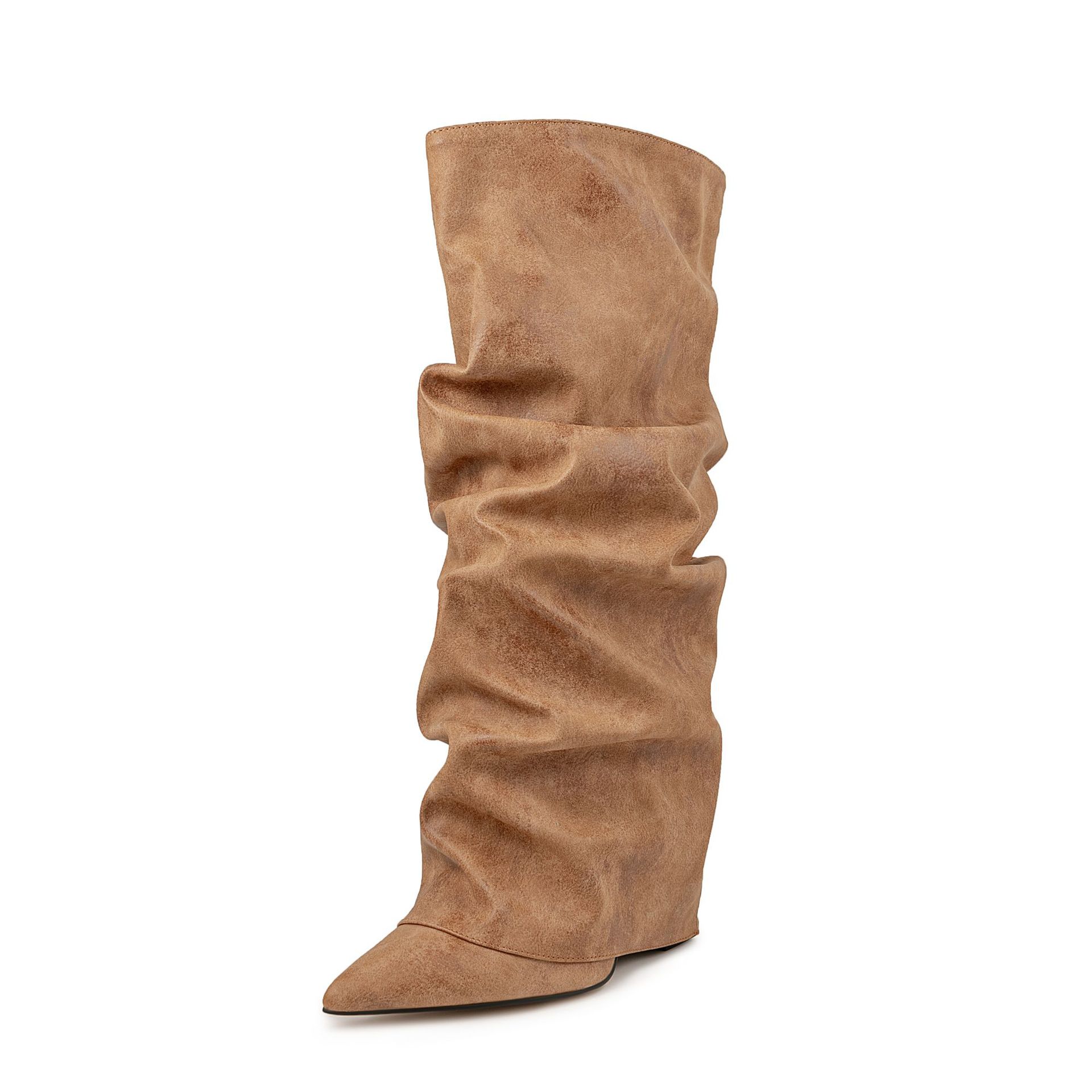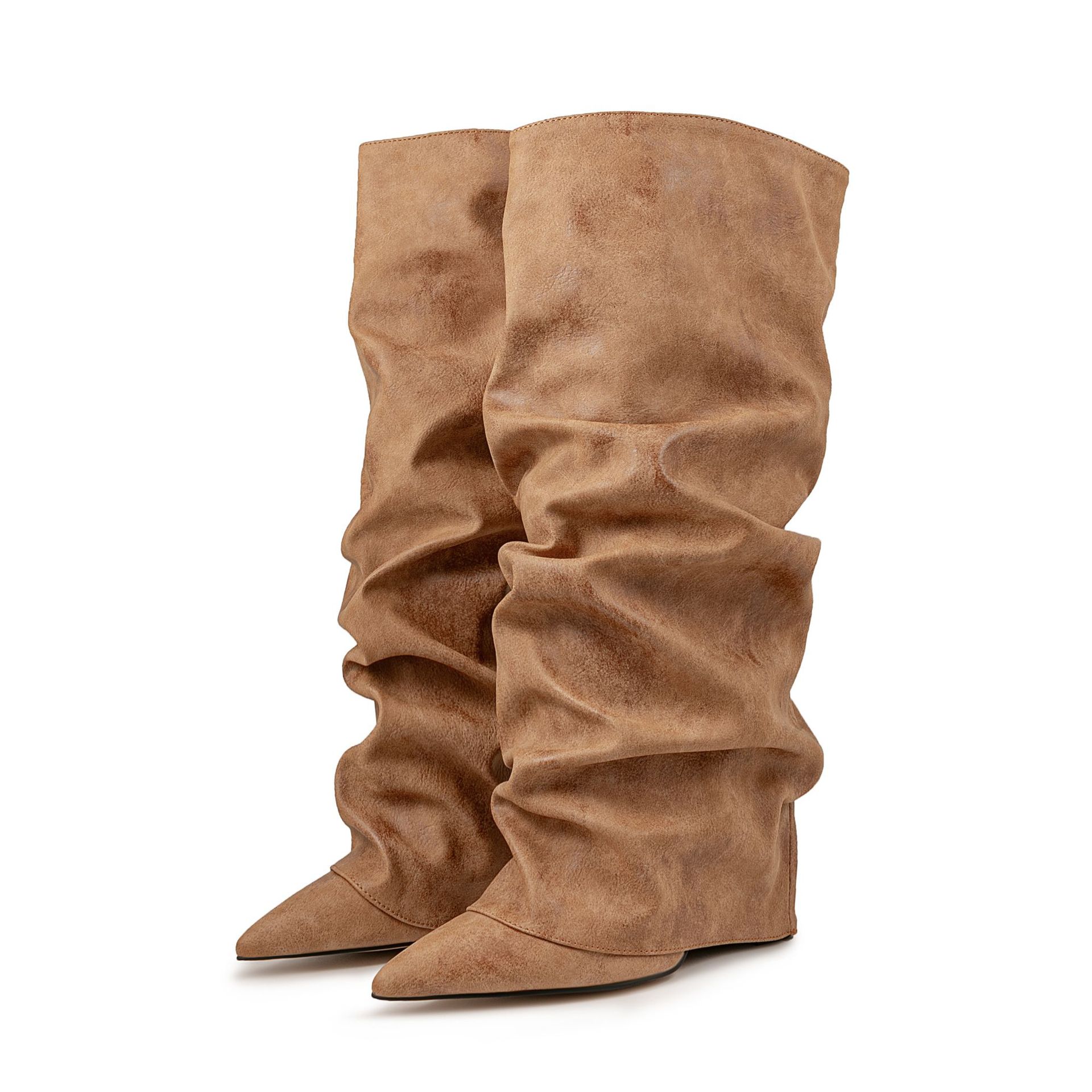 유럽풍 레트로 스타일의 극세사 스택부츠~뾰족코 스플라이싱 러플 디테일의 롤업 슬리브 주름 장식 초하이힐 니하이부츠 여성용 스틸레토힐스토어 가기